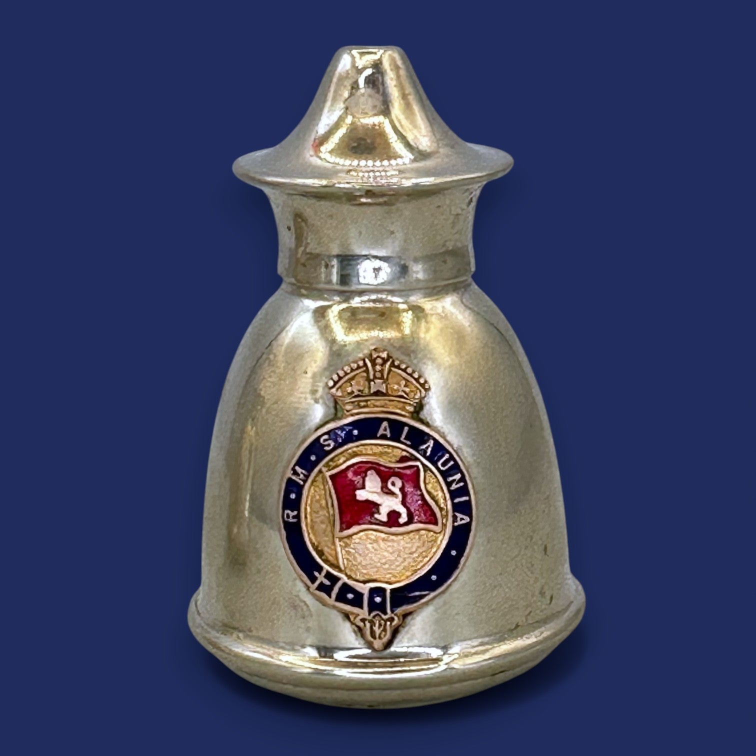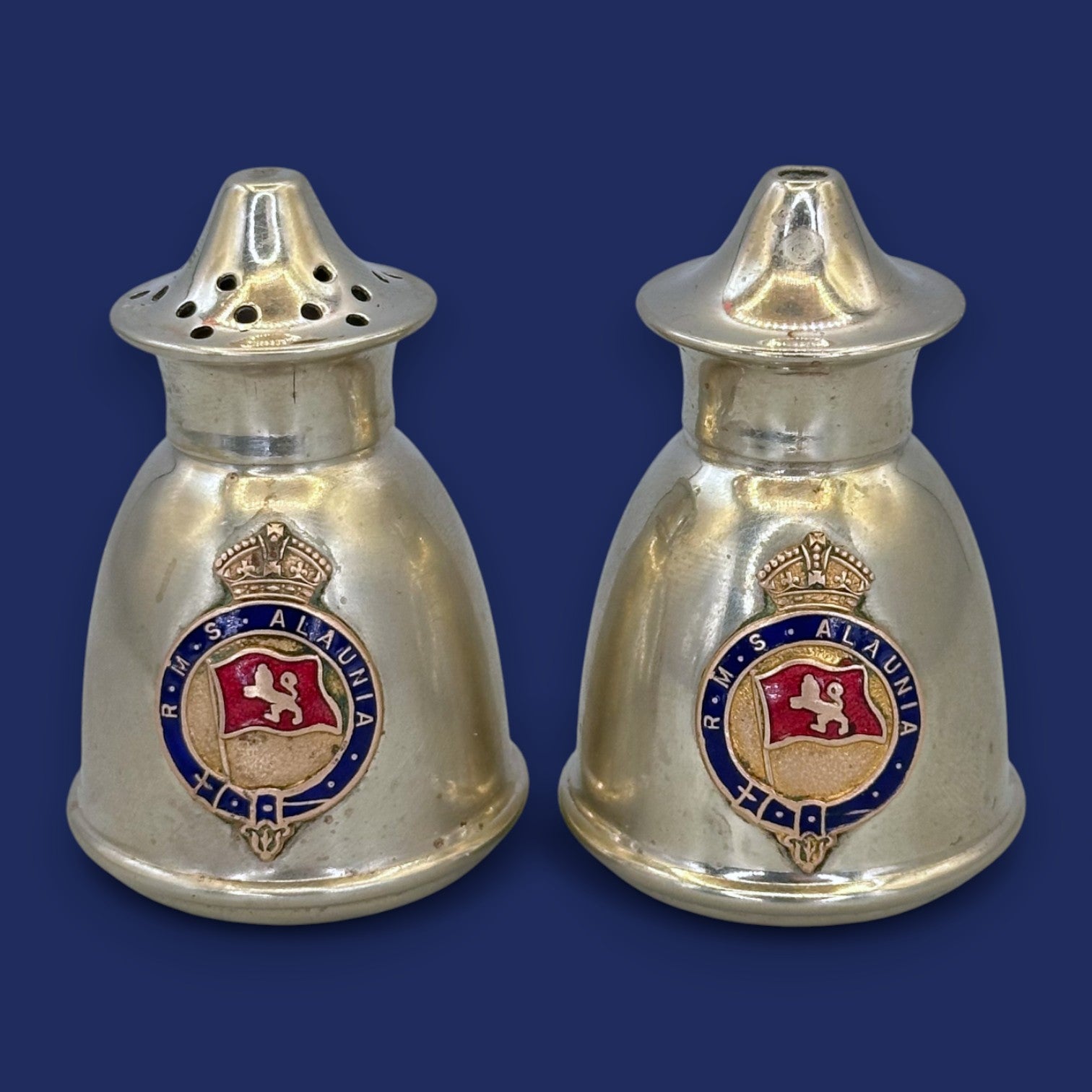 These exquisite, bell-shaped EPNS silverplate salt and pepper shakers feature the colourful, enamelled RMS Alaunia crest. The polished silver-tone metal has a classic, warm patina, suggesting their approximate age is early 20th century (likely associated with the 1913 or 1925 Cunard liners). Originating from the United Kingdom, this pair embodies the grandeur of transatlantic ocean liner travel.