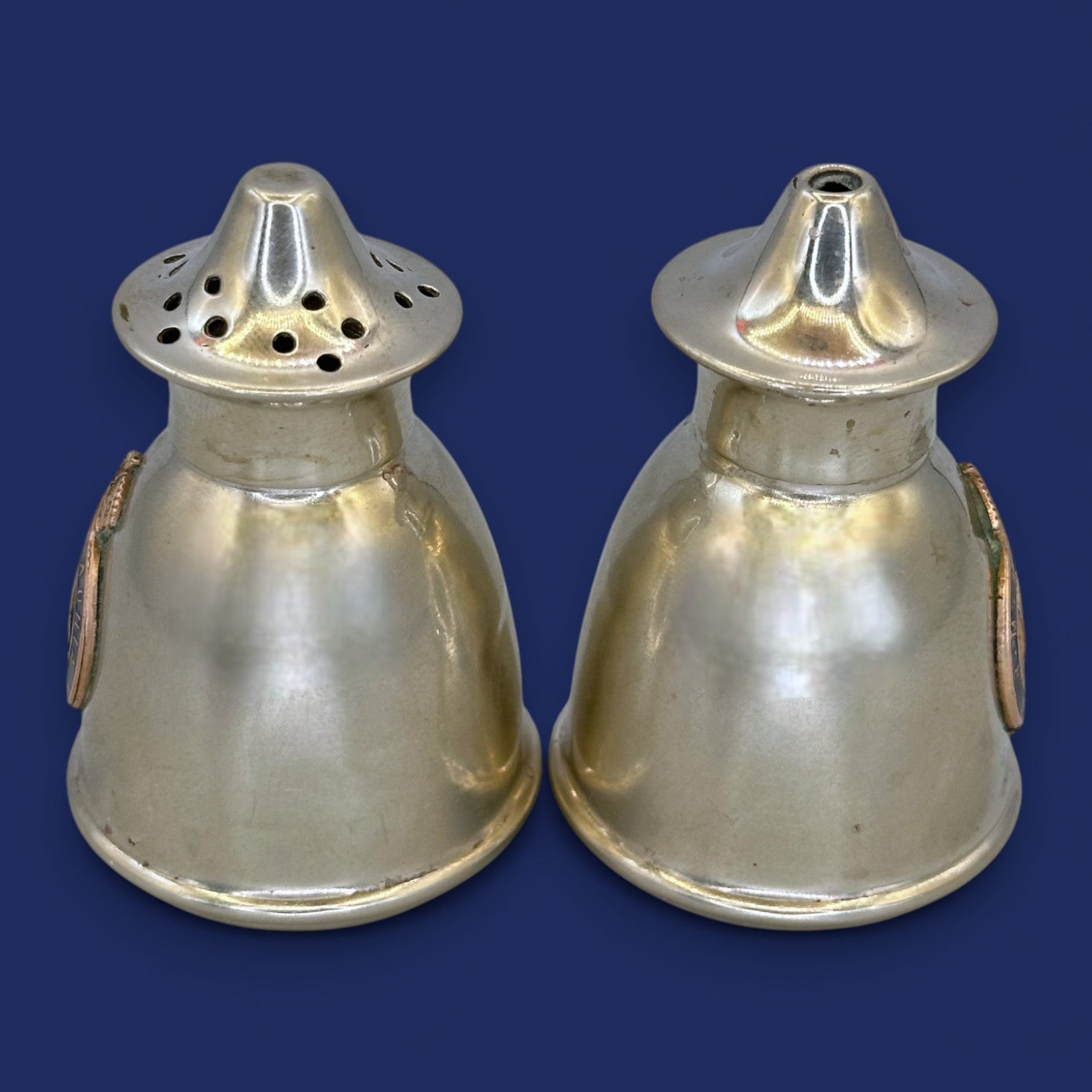 Enamelled Ship's Crest: Each shaker proudly displays the ship's distinctive, multicoloured coat of arms under a crown.