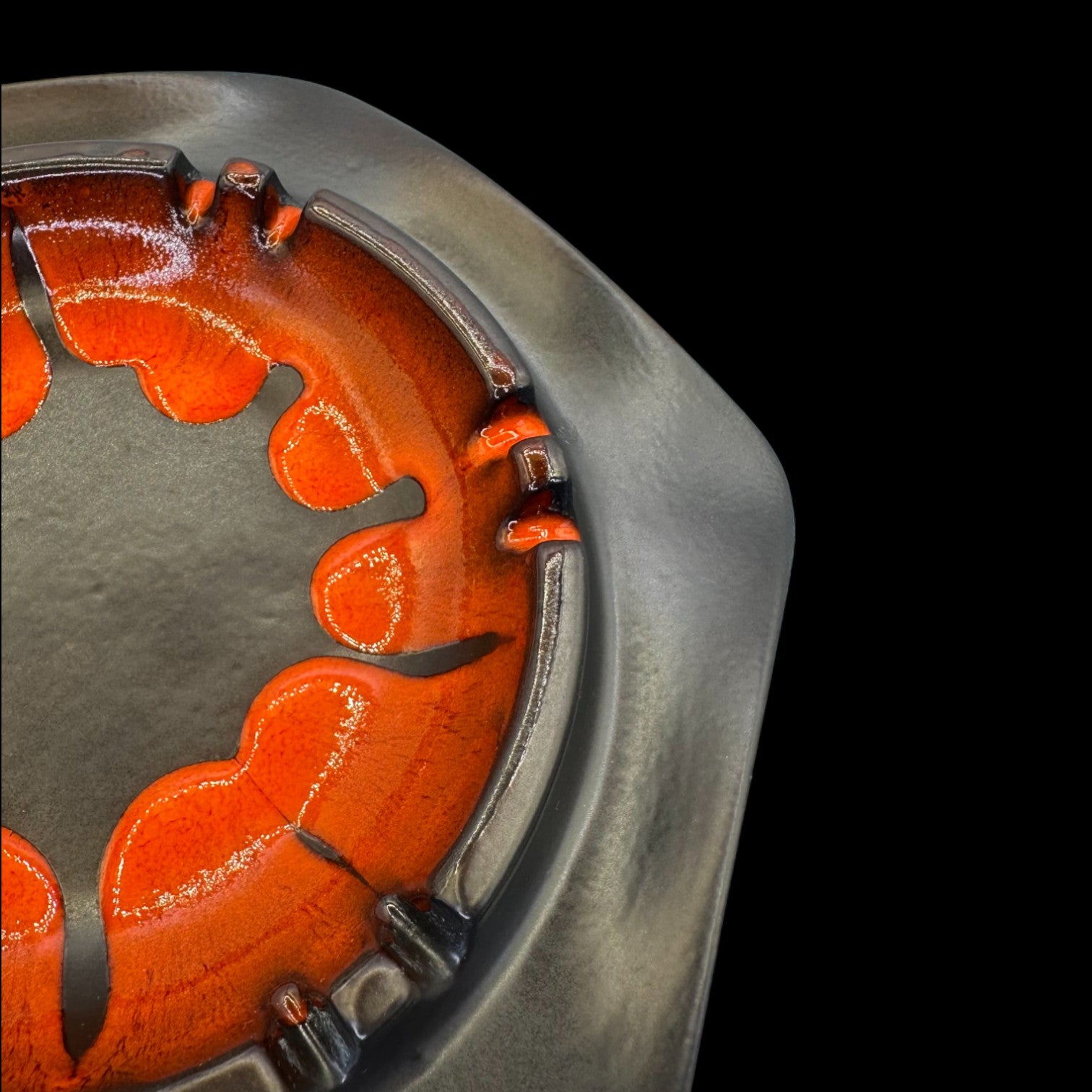 Beauceware Mid-Century Modern Drip Glaze Ashtray – Black & Orange Art Pottery