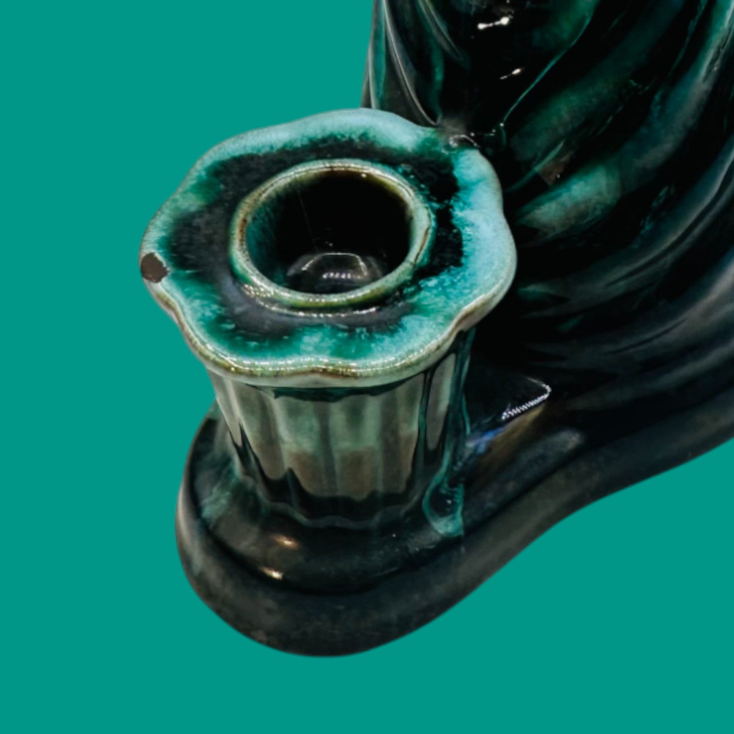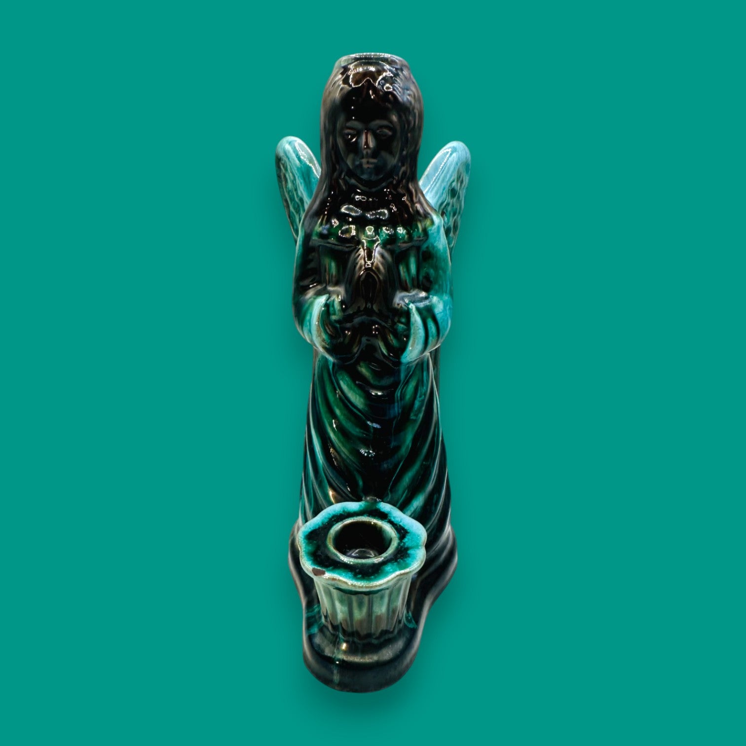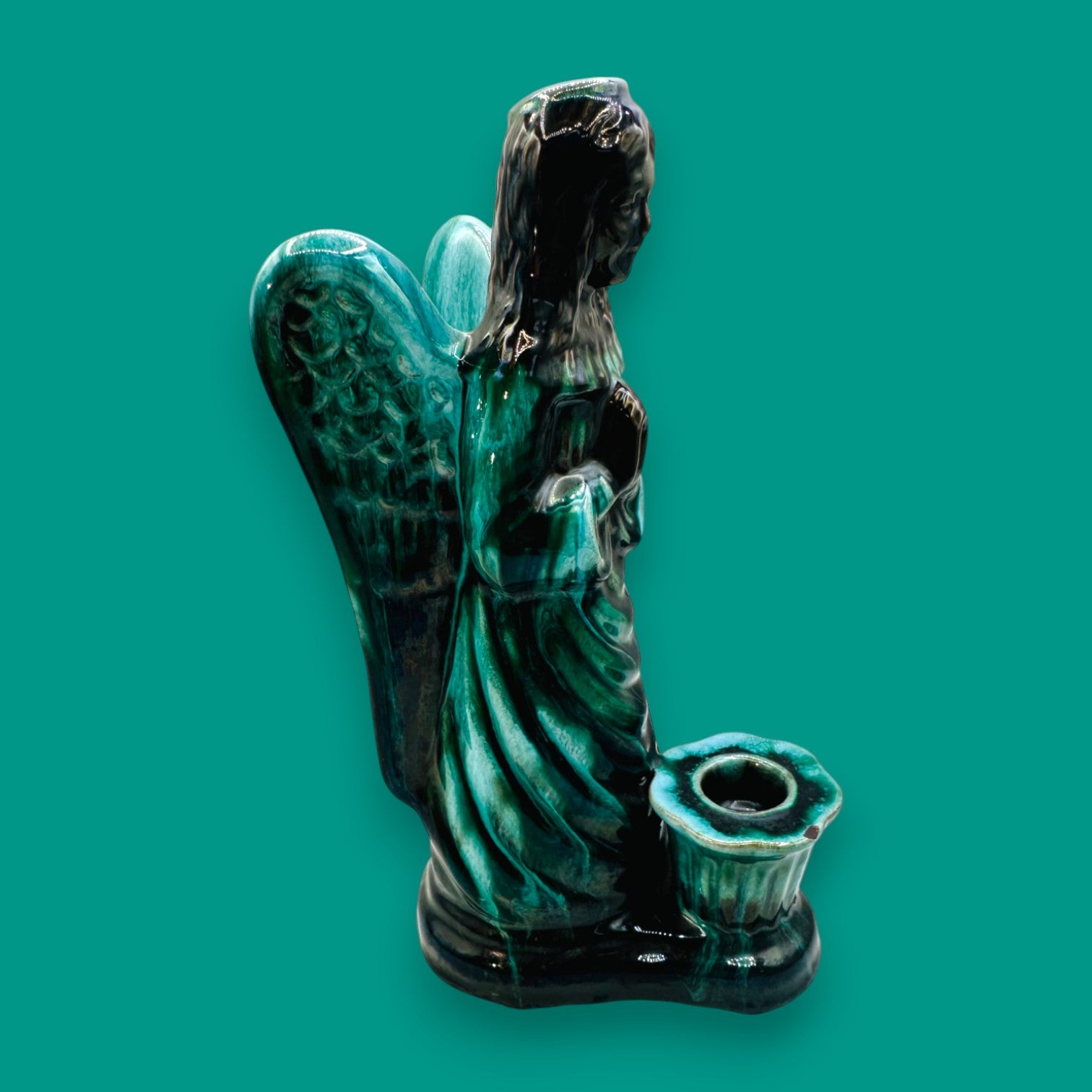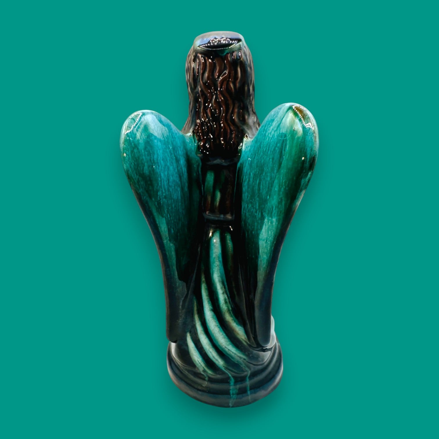 This 1970s Blue Mountain Pottery angel candle holder captures the essence of vintage artistry with its signature green and black drip glaze. Standing tall with serene detail, the angel figure holds a candle holder at its base, blending spiritual symbolism with functional design. Known for their distinct glazing technique, Blue Mountain Pottery pieces are highly collectible today. A meaningful addition to any mid-century collection or as a statement decor piece.