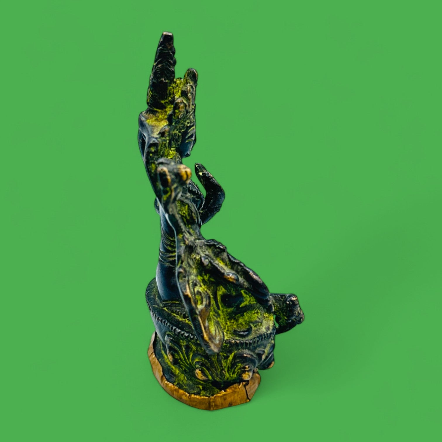 This brass statue depicts Green Tara, one of the most revered deities in Buddhism, known as the “Mother of Liberation.” She embodies compassion, wisdom, and protection, offering guidance to those who seek spiritual growth. Shown seated in a graceful posture, adorned with a crown and detailed ornaments, Tara radiates divine presence and serenity. The statue’s brass body with a green patina enhances its sacred aura, making it both a devotional icon and a striking piece of art.