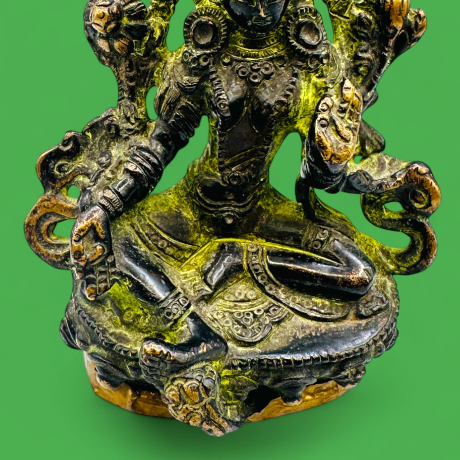 Vintage Brass Green Tara Statue – Seated Buddhist Deity Figurine with Patina