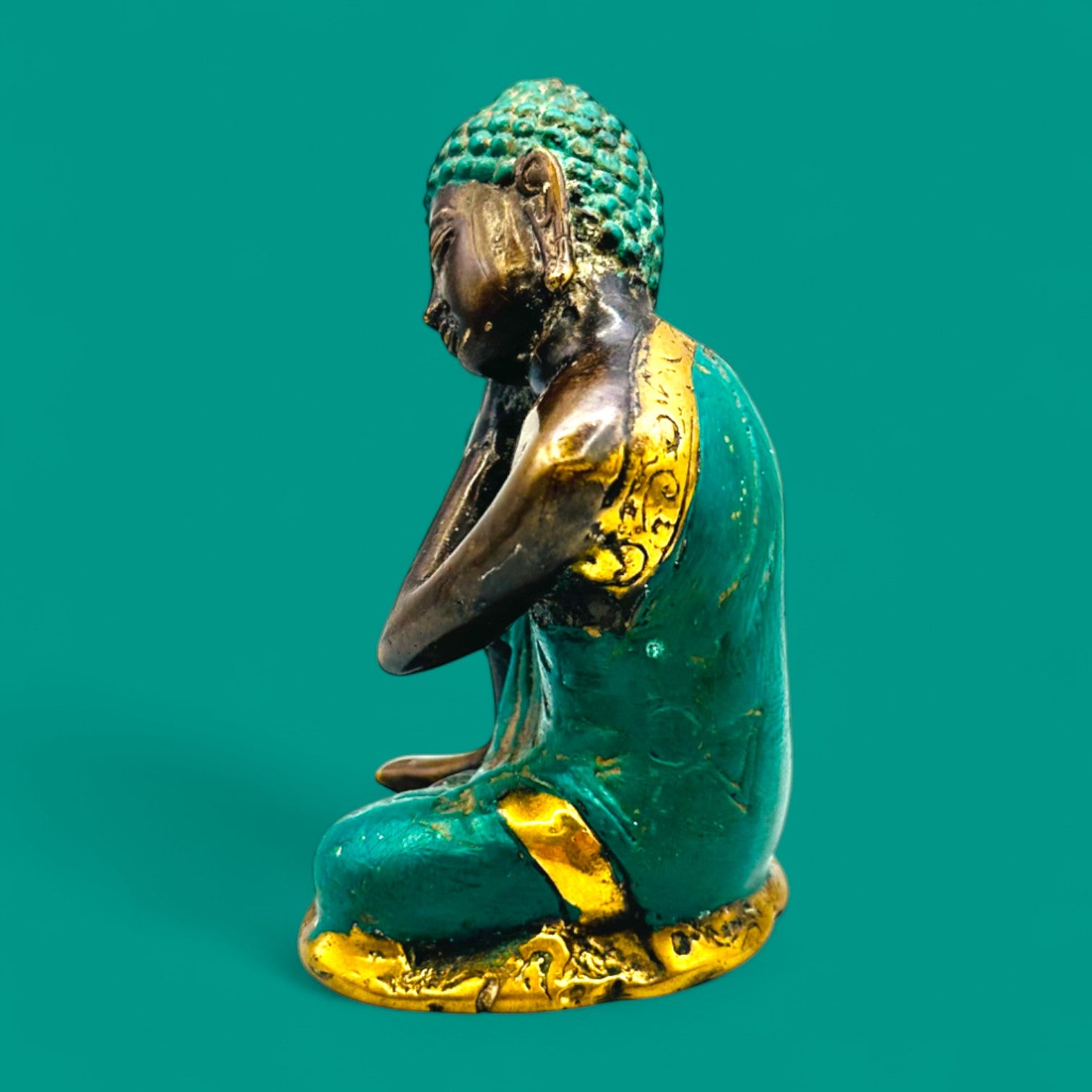 This vintage brass statue depicts the “Contemplating Buddha,” also known as the Royal Pensive Buddha. Unlike the more common seated or reclining poses, this unique representation shows Buddha resting his head gently on his hand in deep thought, symbolizing reflection on the nature of suffering and enlightenment. The green and gold patina finish enhances its antique character, making it a captivating piece for collectors and spiritual spaces.