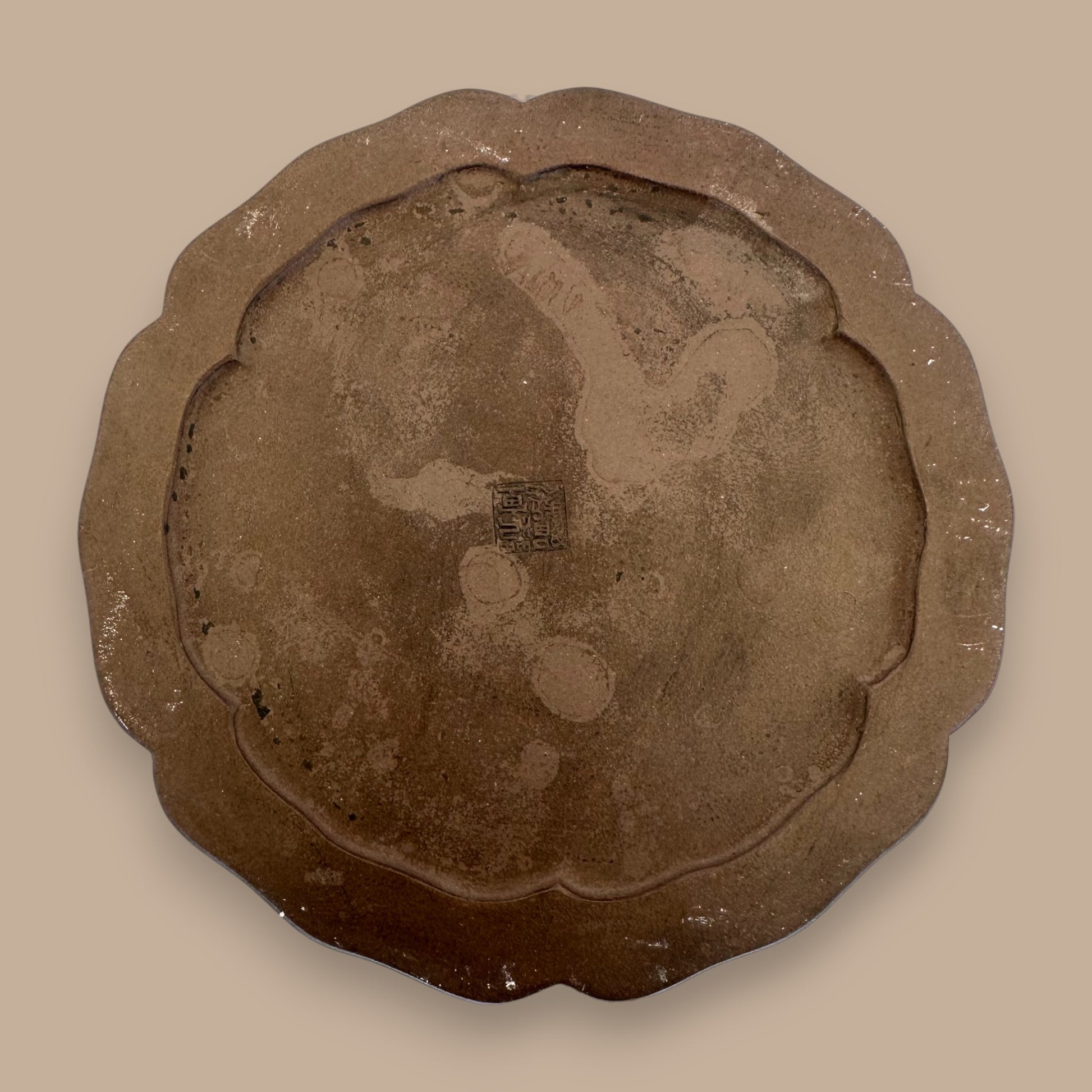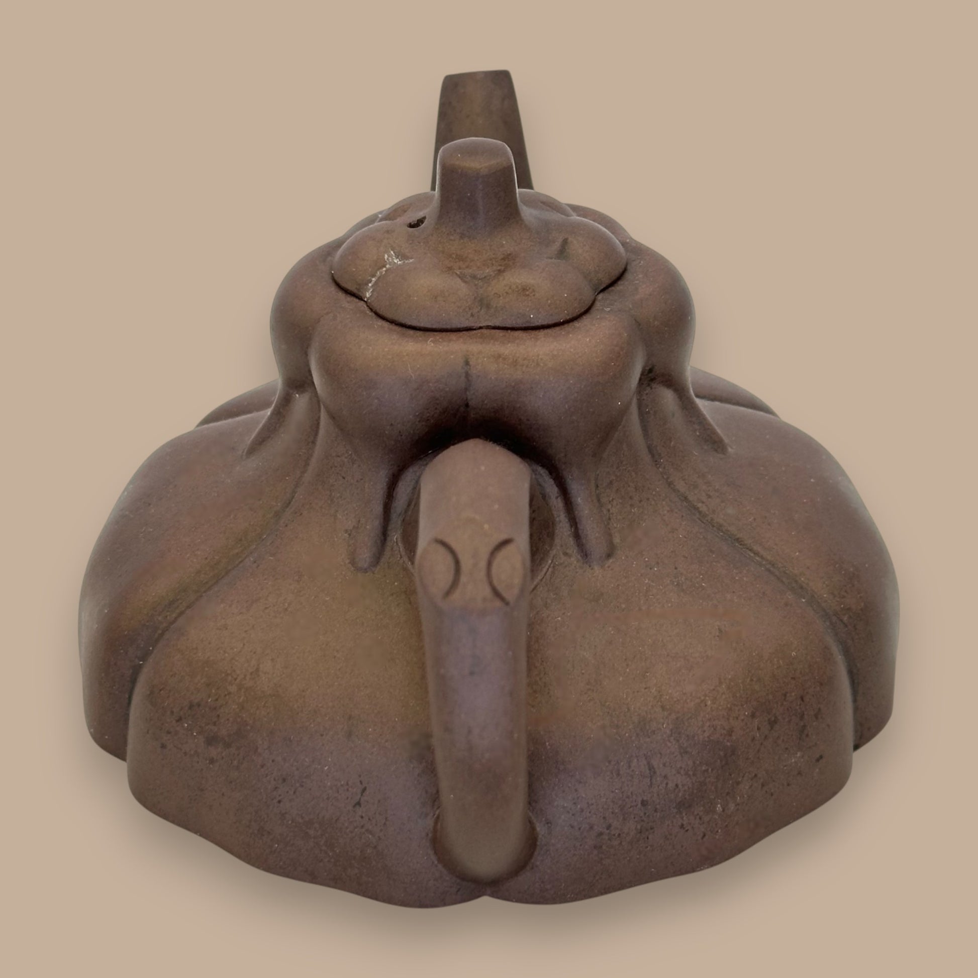 This Yixing teapot reflects centuries of Chinese craftsmanship rooted in the tradition of Zisha clay. Shaped in an elegant gourd form with fluted sides and a flower-inspired lid, it captures the organic harmony between form and function. The deep purplish-brown hue and unglazed surface highlight the natural beauty of the clay. Marked with the “Great Qing, Qianlong” reign seal beneath, this piece carries the cultural depth and serene aesthetics of imperial tea culture.