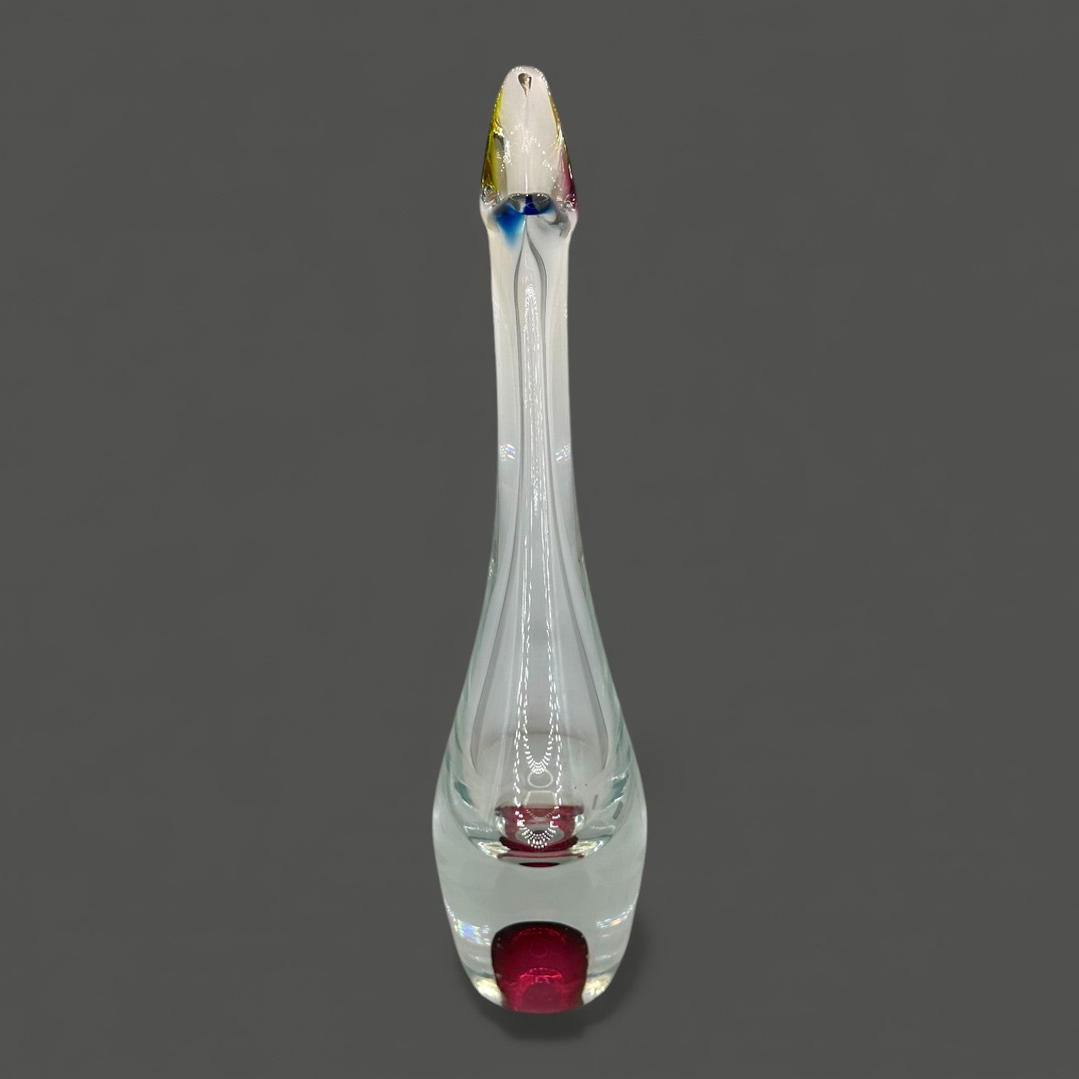 This exquisite Chribska art glass vase captures the iconic style of 1960s Czech glassmaking, blending sculptural form with vibrant, layered colour. Hand-blown with remarkable precision, it showcases a clear elongated body, a fluid flared rim accented with soft blue and yellow, and a bold pink core suspended within the thick glass base. Each angle reflects light beautifully, creating a dynamic play of depth and clarity. With its combination of artistry and history, this vase brings a true statement piece into your home.