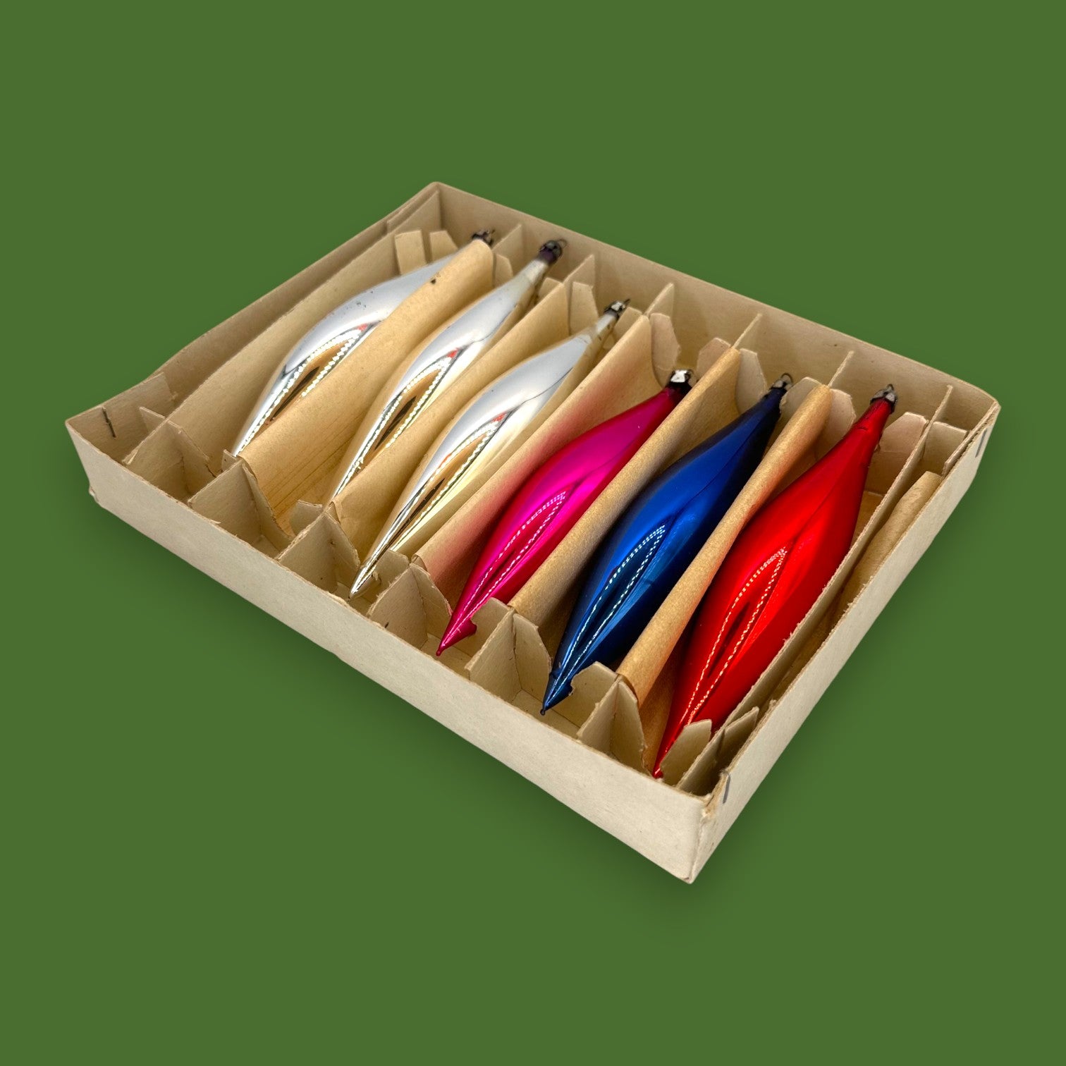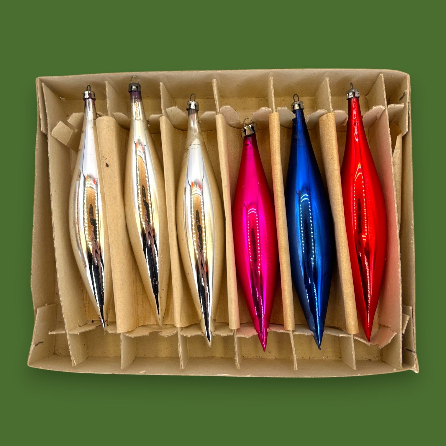 Vintage, shiny teardrop ornaments in vibrant, classic colours: silver, cerise pink, deep blue, and bright red. This iconic box of six glass ornaments, likely from the 1950s or 1960s and possibly made in the USA, features a sleek, elongated torpedo or icicle shape, complete with original metal caps and hooks. The cardboard box boasts charming mid-century holiday graphics, including Santa, bells, and wreaths, making the presentation itself a treasure.
