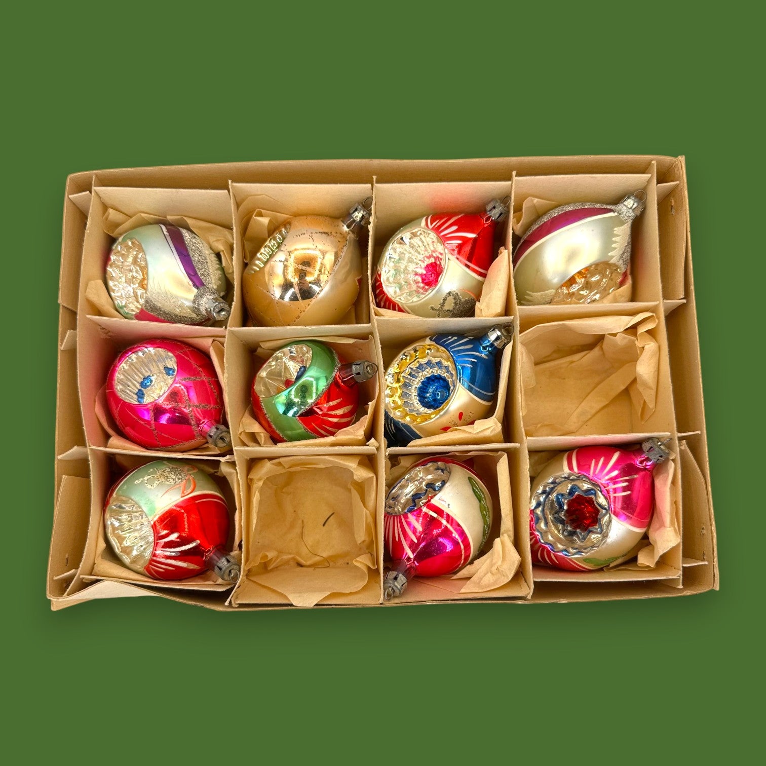 These vibrant, colourful antique Christmas tree ornaments capture the magic of mid-century holiday décor. This exquisite full box contains twelve unique, pressed glass ornaments featuring bright metallic colours like magenta, gold, red, blue, and green, with silvered details and stunning concave indentations, often called 'witches eye' or reflector ornaments. Believed to be from the 1950s or 1960s and likely originating from Poland or East Germany, they embody classic post-war European craftsmanship.