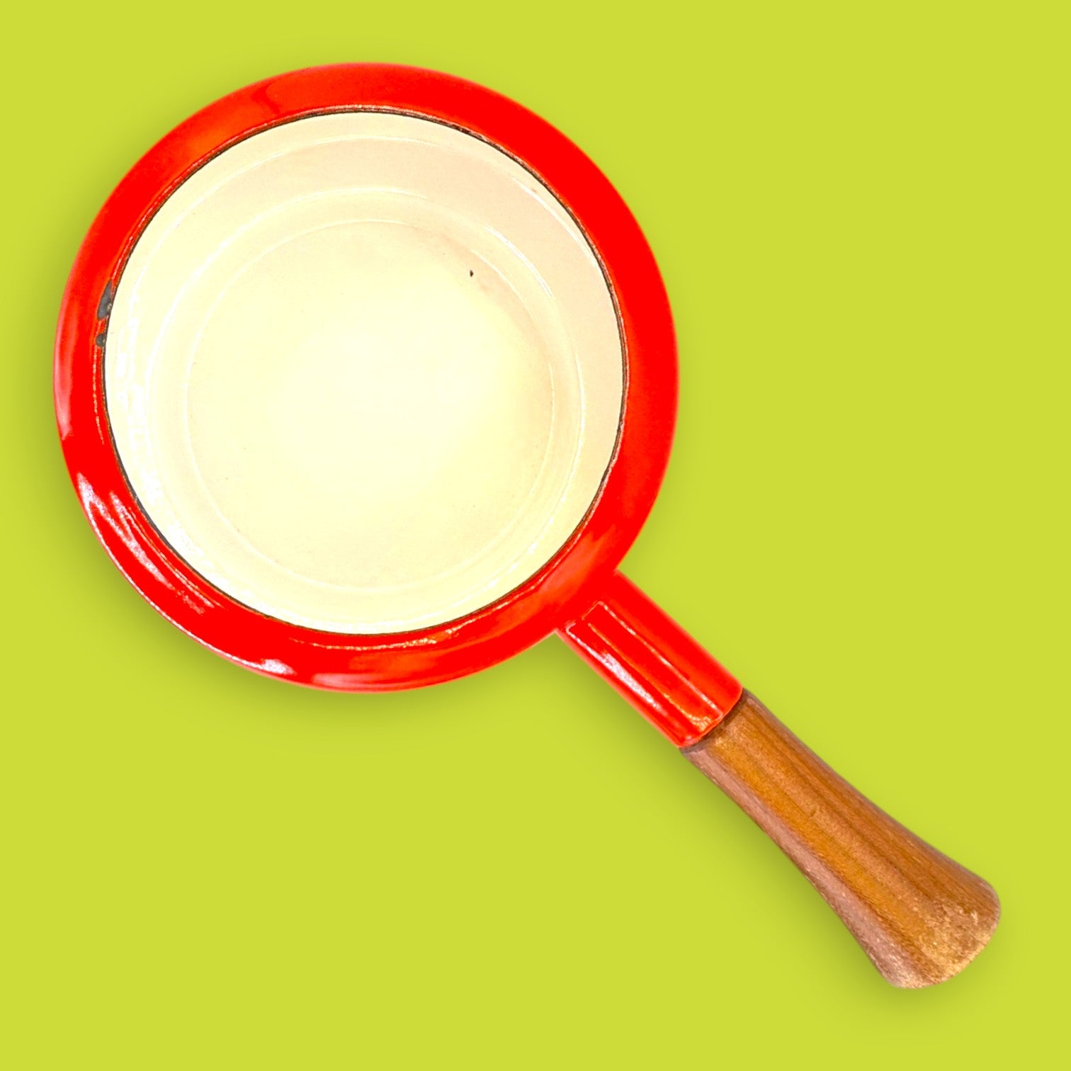 JHQ Jens Quistgaard. This striking red enamel fondue pot by Dansk Design France perfectly captures the warmth and creativity of mid-century modern style. Designed for both form and function, it combines vivid enamel color, sculpted wood accents, and durable cast iron craftsmanship. Whether displayed as a retro kitchen accent or used for cozy fondue nights, this piece embodies timeless Scandinavian-inspired design.