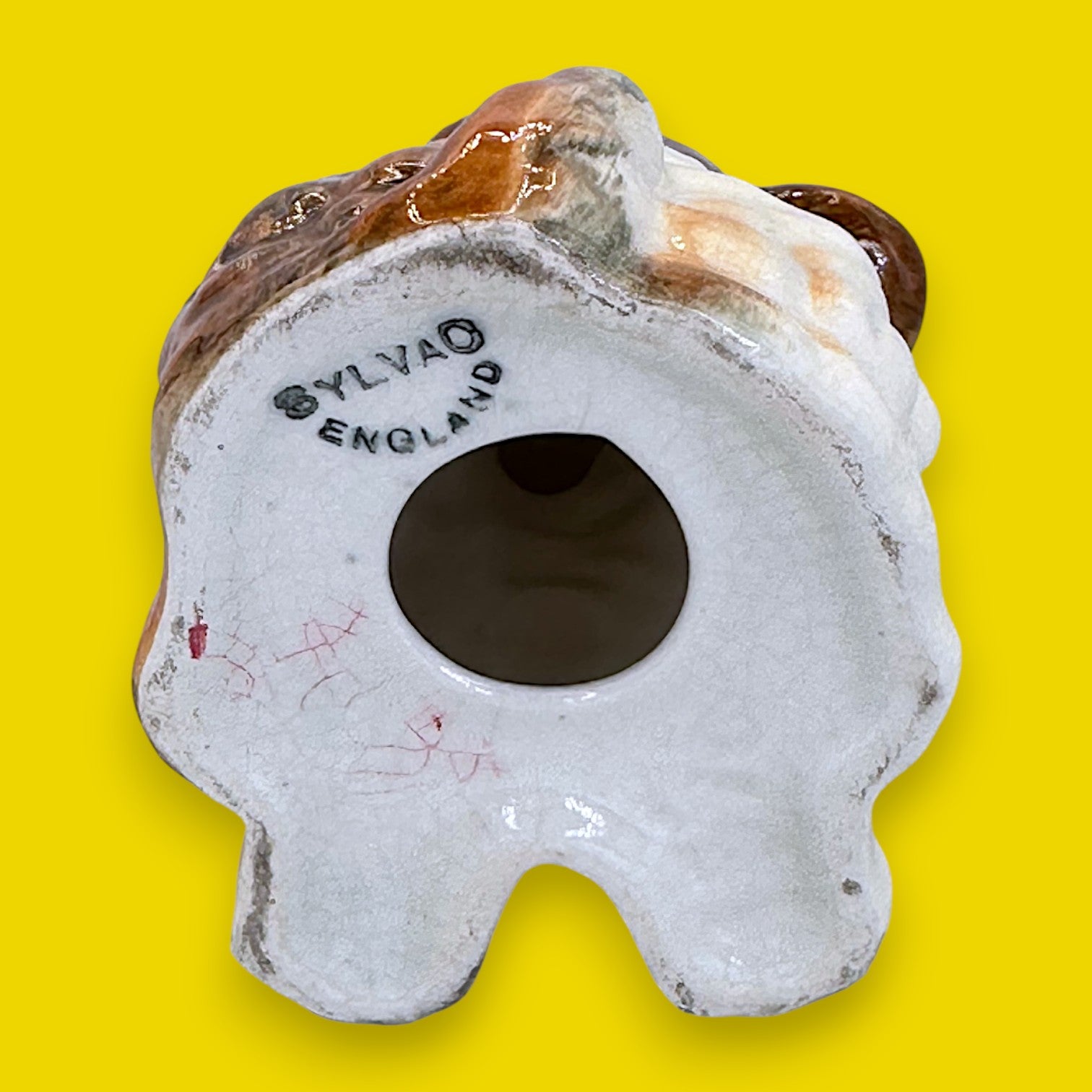 Say hello to this handsome, sit-down Sylvao Terrier dog figurine, originating from England and likely produced in the mid-20th century (1940s-1950s). This ceramic piece features a classic, seated pose with a slightly cocked head that gives him an endearing, quizzical expression. He's finished in a high-gloss glaze of warm browns, tans, and creamy white, with subtle hand-painted black details for the eyes and nose. The white areas show characteristic age-related crazing, adding to its antique charm. The base is clearly stamped with the iconic "SYLVAO ENGLAND" backstamp, confirming its British pottery provenance.