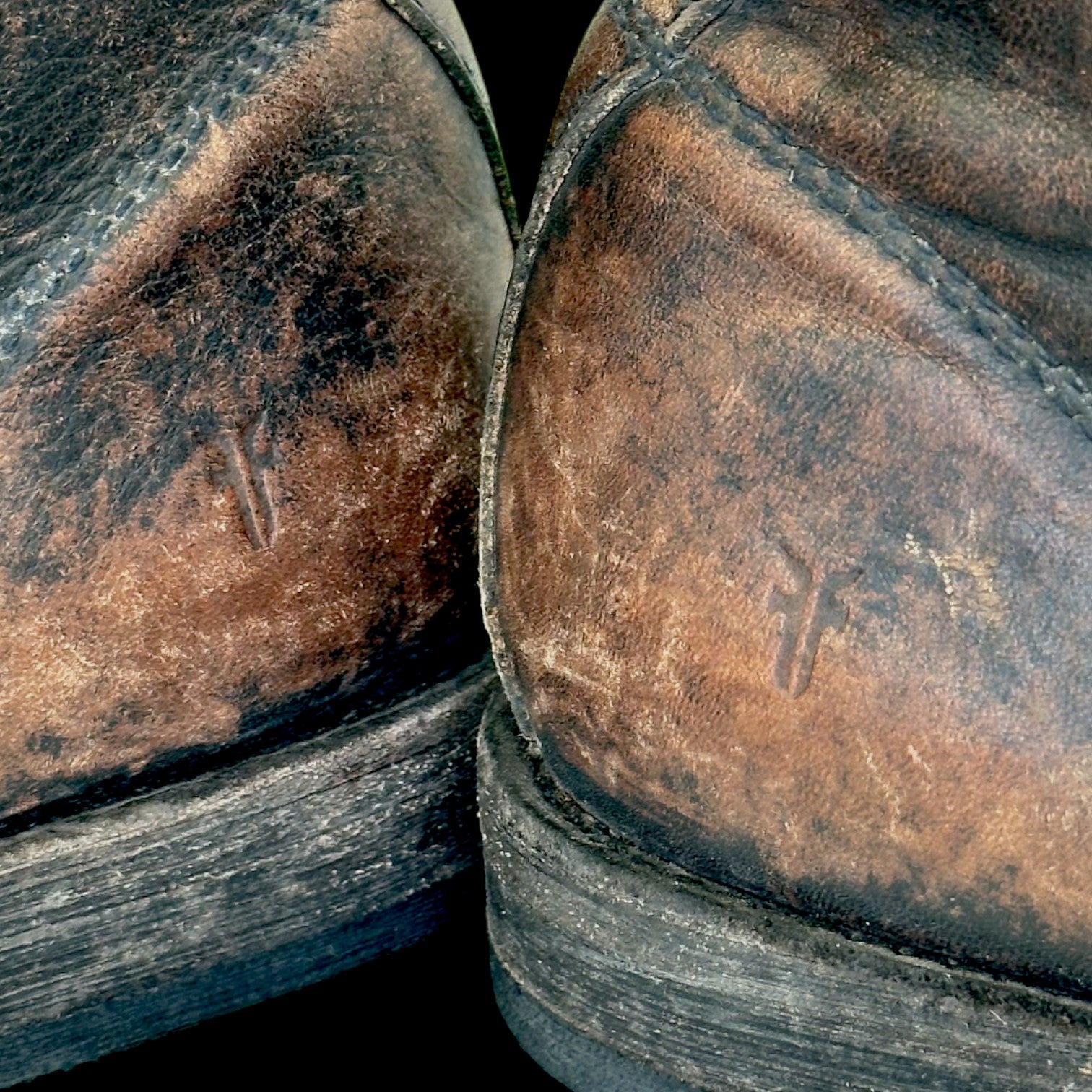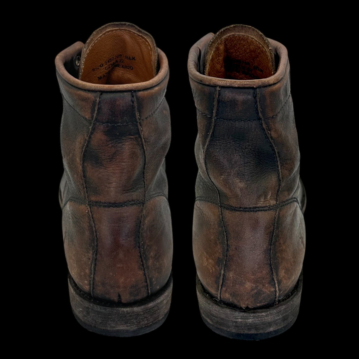 The black distressed leather possesses rich, natural brown undertones. Over time, and without occasional black polishing, the boot will develop an increasingly brown patina, which only adds to its unique, rugged character.
