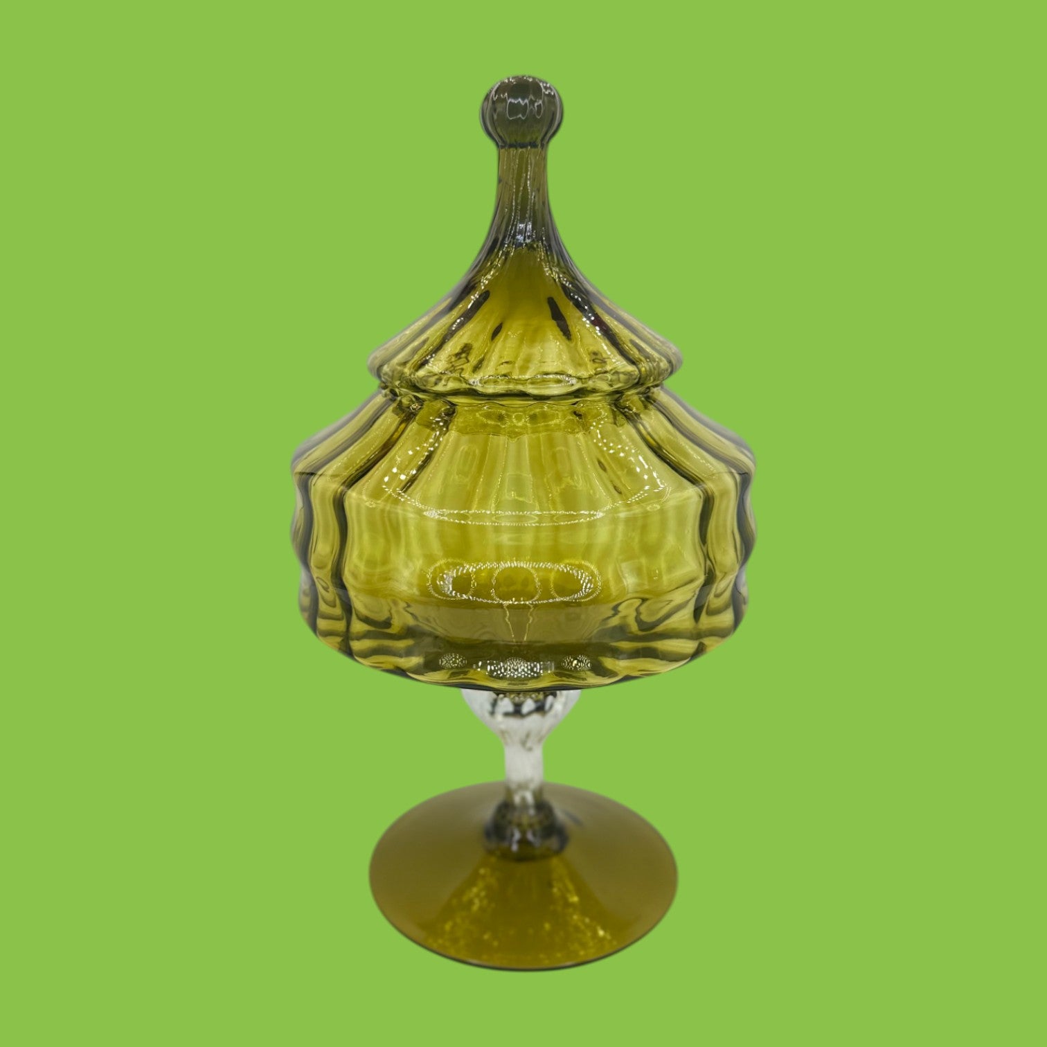 This vintage Empoli covered compote jar in olive green is a rare mid-century modern treasure. Its circus-tent inspired form, paired with bold retro lines, makes it both functional and highly decorative. Crafted in Italy, this apothecary-style jar reflects light beautifully, bringing a warm prismatic glow to your space. A true collector’s item that embodies the elegance and playfulness of 1960s–70s Italian glassware.