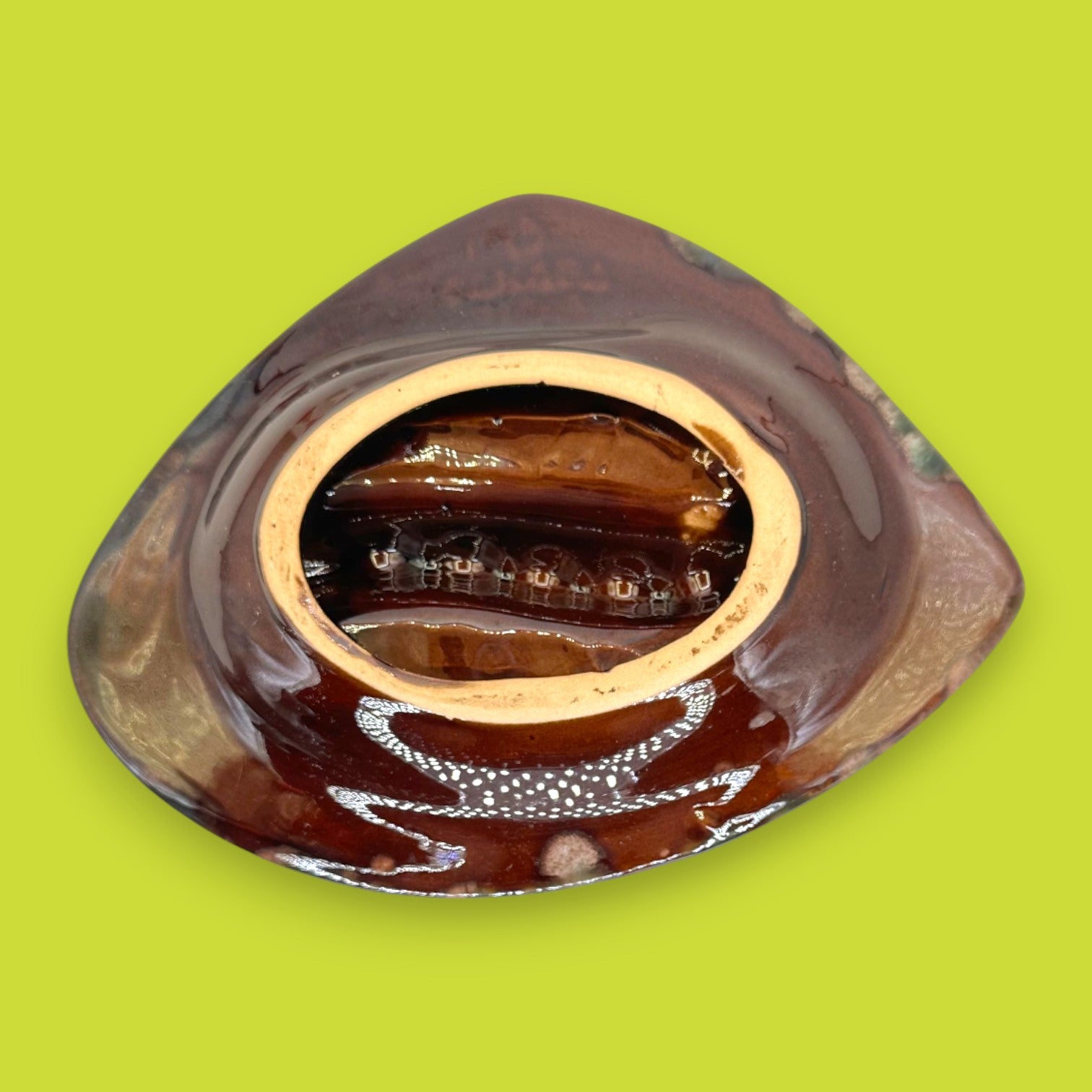 This vintage drip-glaze ashtray showcases the warm earth tones and flowing patterns that defined Canadian mid-century pottery. Its sculpted inner ring and rich brown-green glaze create a bold visual contrast, highlighting the handmade character of the piece. The glossy surface and organic texture give it a timeless charm, whether used practically or displayed as décor. A true expression of retro craftsmanship, it adds warmth and personality to any setting.