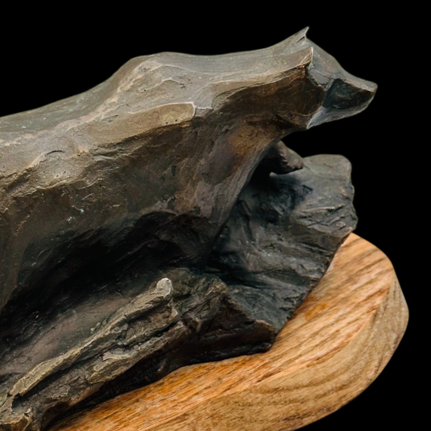 This handmade bronze statue captures the raw strength and quiet watchfulness of the grizzly bear. Resting on a natural wood base, it embodies both rugged wilderness spirit and refined craftsmanship. Designed by Kelowna, BC artist Alan Hunter, this piece carries Art Deco influence while maintaining a timeless natural presence. Perfect for collectors of fine art, wildlife enthusiasts, or those who appreciate bold, nature-inspired design.