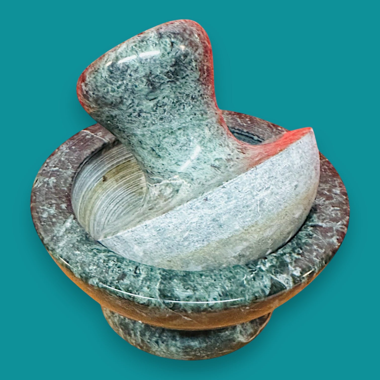 • Shape & Texture: Rounded bowl with a smooth grinding surface and matching ergonomic pestle