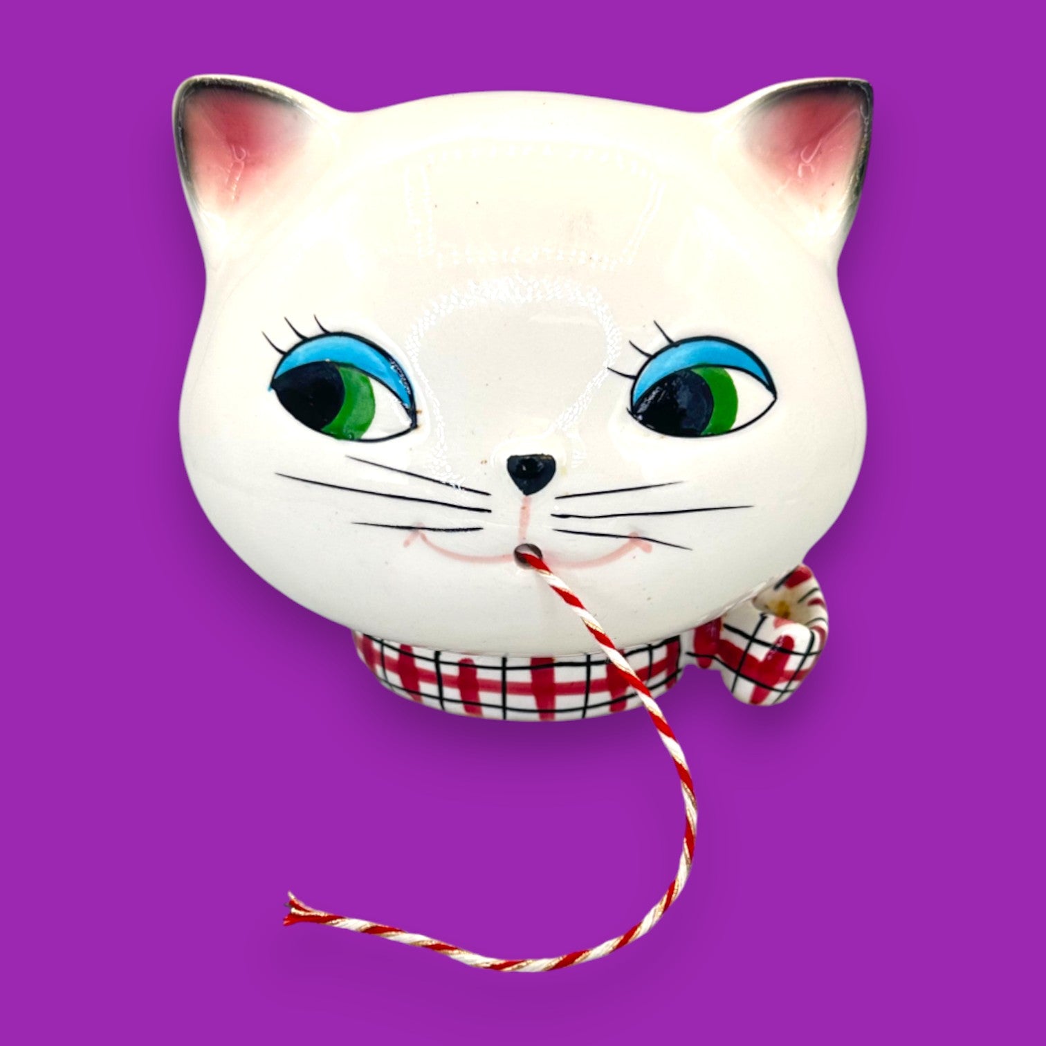 Add a touch of whimsy and functionality to your space with this rare Holt Howard Cozy Cat Yarn Dispenser, crafted in Japan in 1959. With its playful face, tartan bow, and clever string design, this ceramic wall pocket doubles as both a decorative piece and a practical yarn or string holder. Perfect for collectors and crafters, it captures the charm of mid-century design with a delightful feline twist.