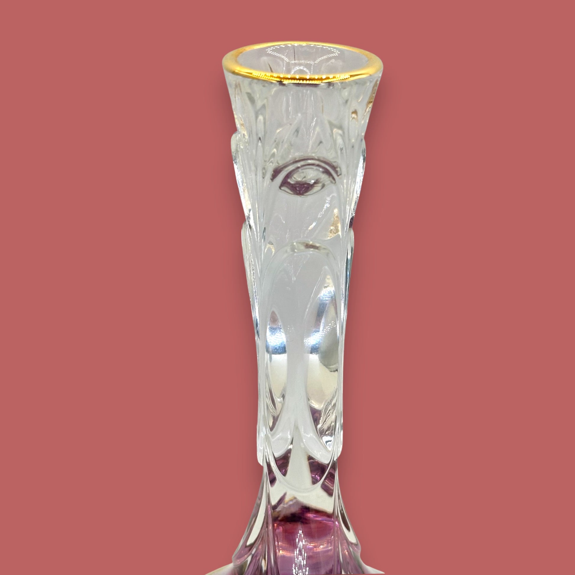 This lavender crystal candlestick brings together art-glass elegance and luminous colour, blending a soft ombré transition from clear to rich purple with a brilliant gold-rimmed base and lip. Its sculpted design catches the light beautifully, creating a shimmering display on mantels, dinner tables, or decorative shelves. Whether used alone or as part of a set, it elevates any space with refined charm and vintage-inspired glamour.