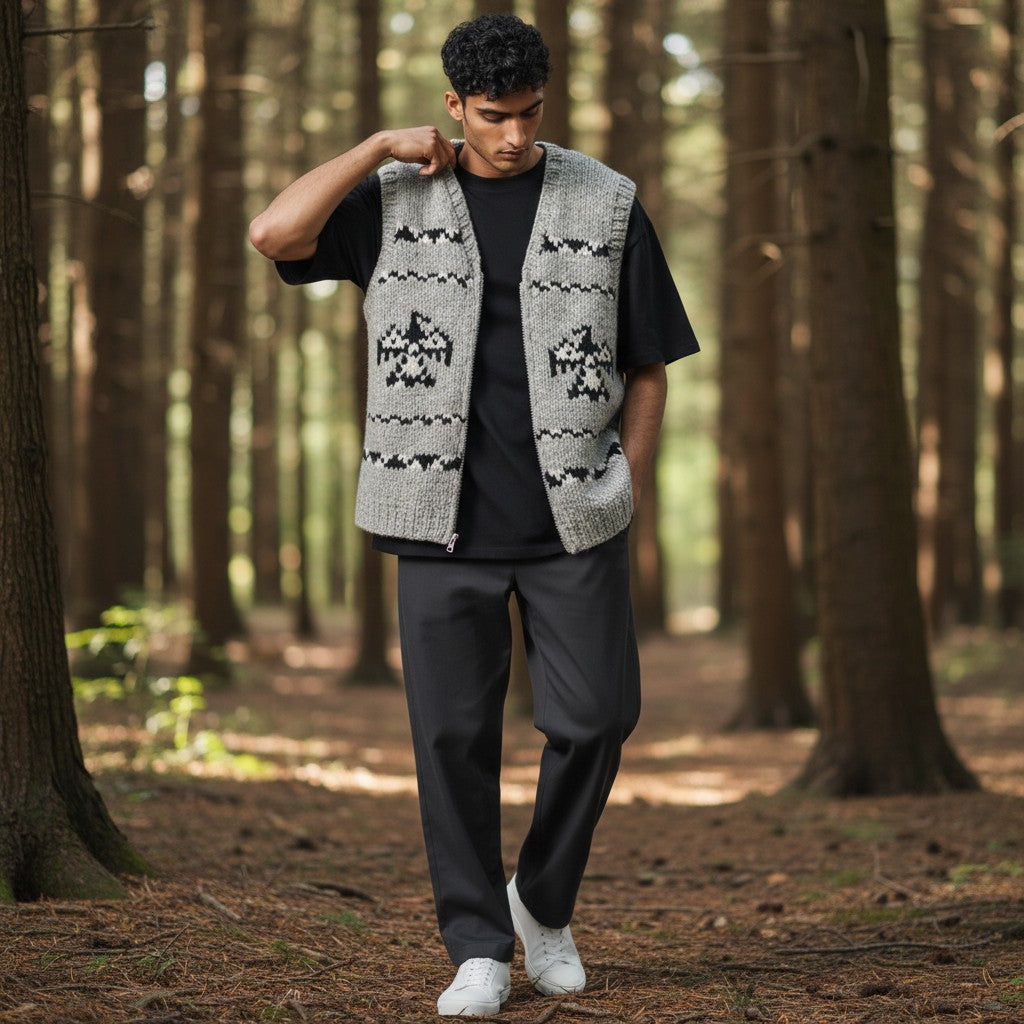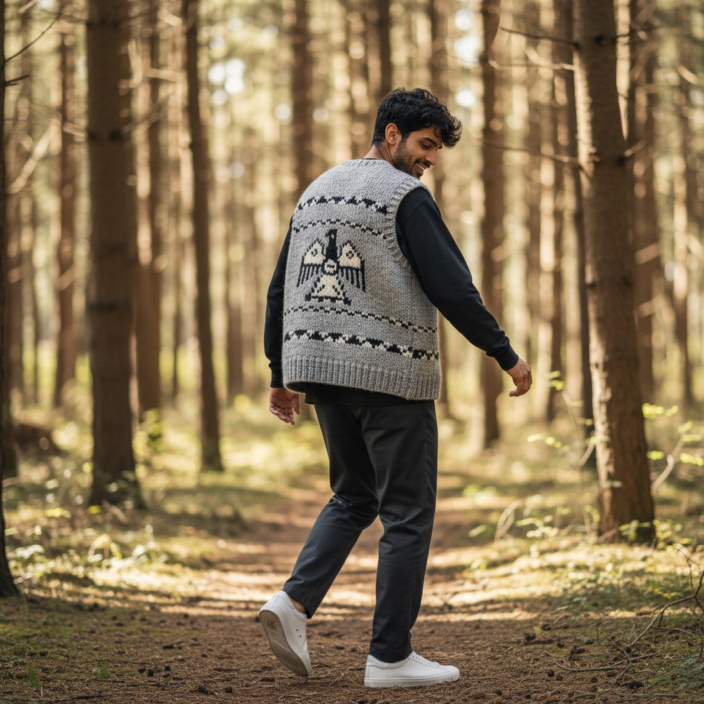 This handmade Cowichan-style wool vest brings together Indigenous-inspired artistry, natural wool warmth, and timeless West Coast craftsmanship. With its bold eagle motif, thick hand-knit texture, and rugged feel, it’s designed for those who value tradition as much as comfort. Crafted from heavyweight natural wool, the vest provides exceptional insulation while maintaining breathability. The iconic eagle pattern reflects strength and protection, making it a meaningful piece that blends history with daily wear. Whether layered for cold weather or styled casually, this vest offers an authentic and durable look that never goes out of season.
