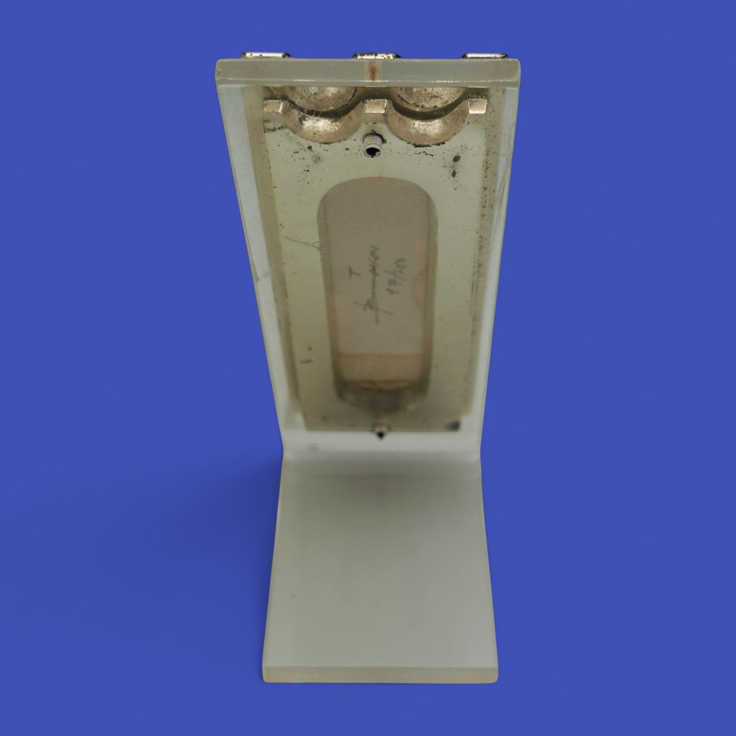 This mezuzah case is a collectible work by Israeli artist Noam Naim Basson (b. 1935), blending Judaica tradition with modern art design. Crafted from acrylic glass (Lucite), silver, and paper, it features bold, colorful geometric motifs in Basson’s signature style. The piece is signed on the back and hand-numbered 17/250, making it a limited-edition treasure.