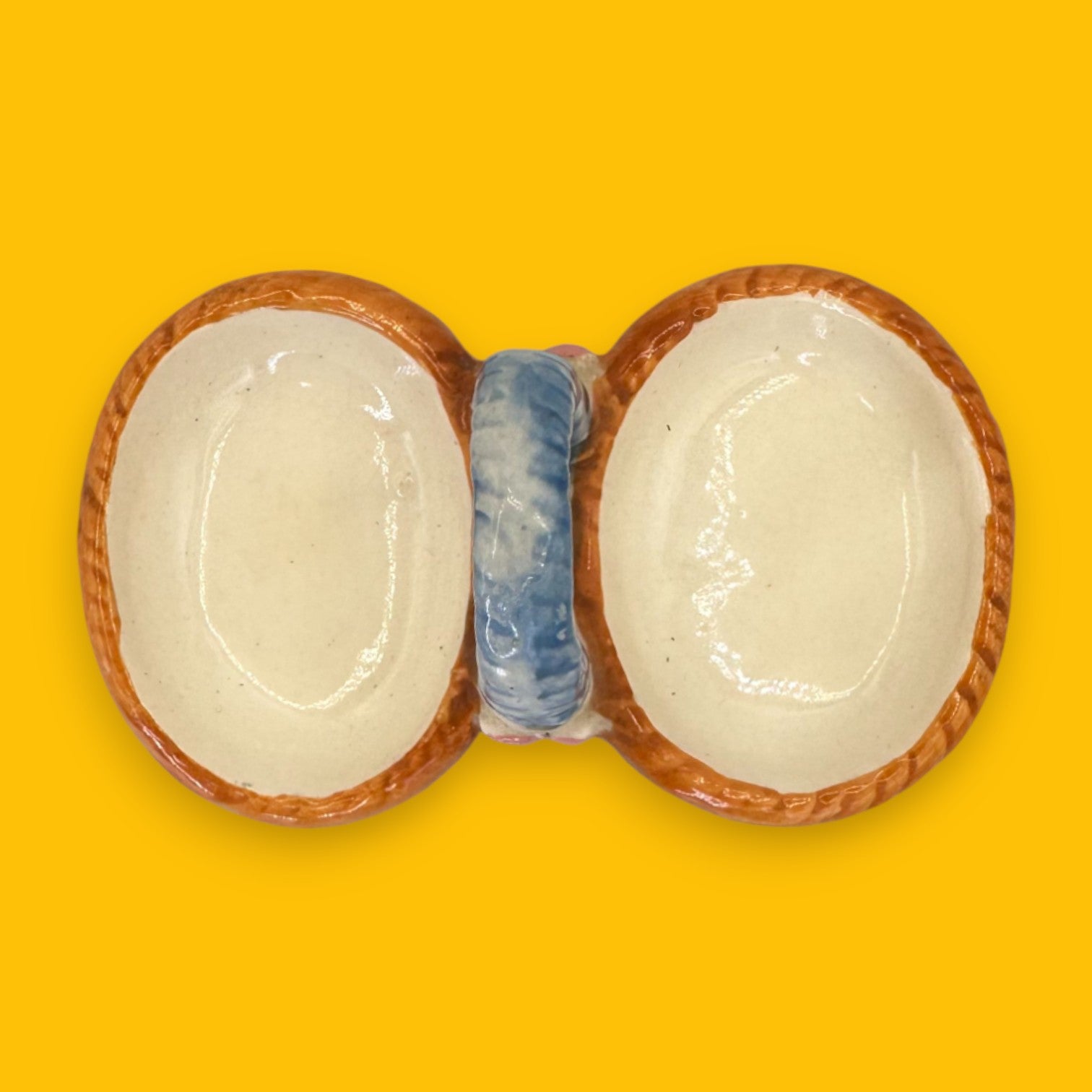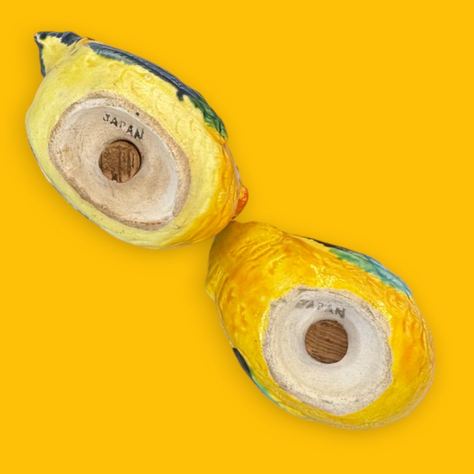 This delightful set of vintage salt and pepper shakers features two hens perched on woven baskets, connected with a decorative handle. Marked “Made in Occupied Japan” on the base, this set is a true collectible piece dating back to the 1940s. The vibrant hand-painted colors bring warmth and whimsy to any kitchen or display shelf.