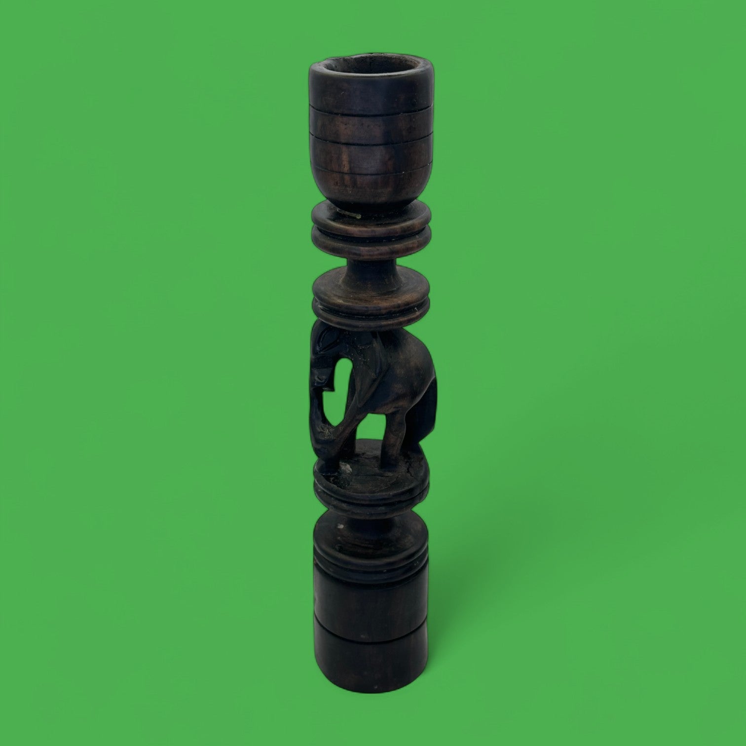 Celebrate craftsmanship and cultural heritage with this striking pair of hand-carved African hardwood candlesticks. Each candle holder features an intricately sculpted elephant motif — a symbol of strength and wisdom — crafted into dense, dark hardwood with a smooth, rich finish. These pieces bring tribal art, natural materials, and bold elegance into any setting.