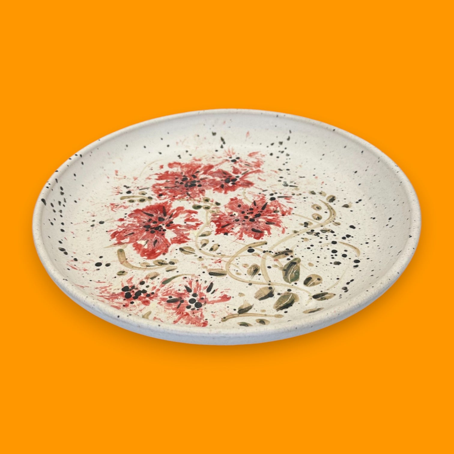 This elegant vintage stoneware plate features five beautifully hand-painted red flowers surrounded by olive-toned leaves and fine speckled accents. The textured surface and soft glaze evoke traditional craftsmanship, making it a standout piece of functional art. Perfect for displaying, collecting, or using as a decorative serving plate, this handmade design reflects both warmth and authenticity in every detail.