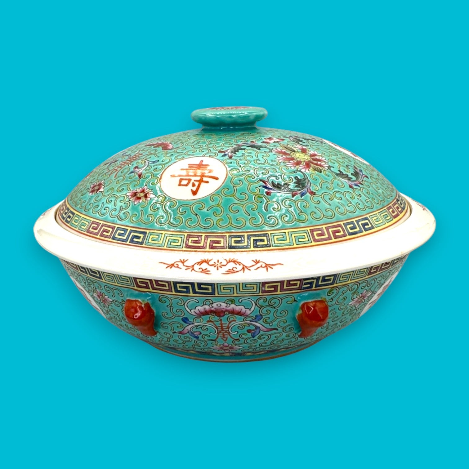 Vintage Chinese Mun Shou Porcelain Soup Tureen – Longevity Pattern Turquoise