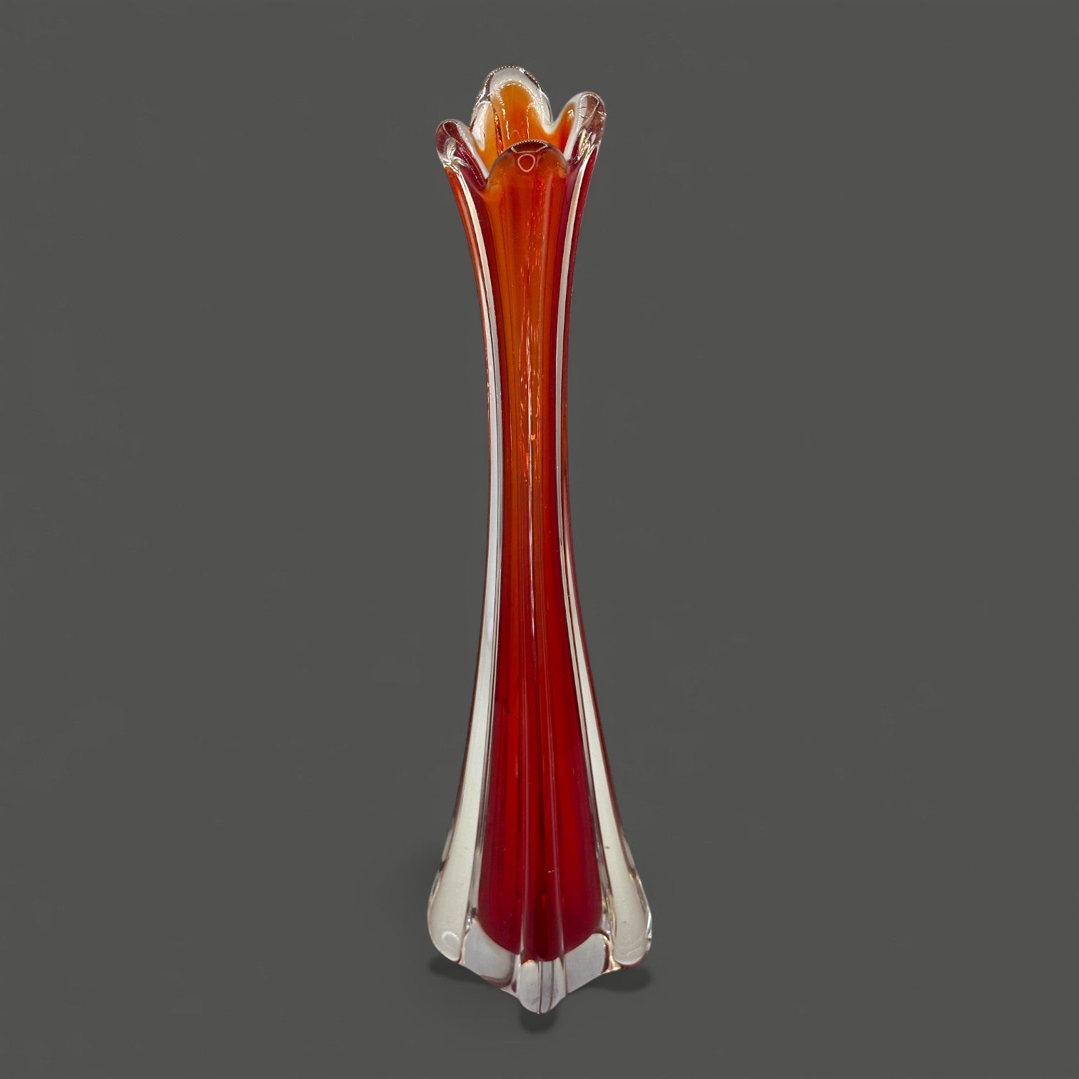 This vintage Murano swung glass vase brings the drama of mid-century Italian design into any room. Hand-crafted with cased layers of red and clear glass, it captures light beautifully, creating a glowing, sculptural effect. Murano artisans perfected the swung technique to elongate and flare the rim, giving each piece a one-of-a-kind silhouette. The bold red coloring, often called amberina, adds warmth and sophistication to your décor. It’s a statement piece that blends history, craftsmanship, and artistic flair.