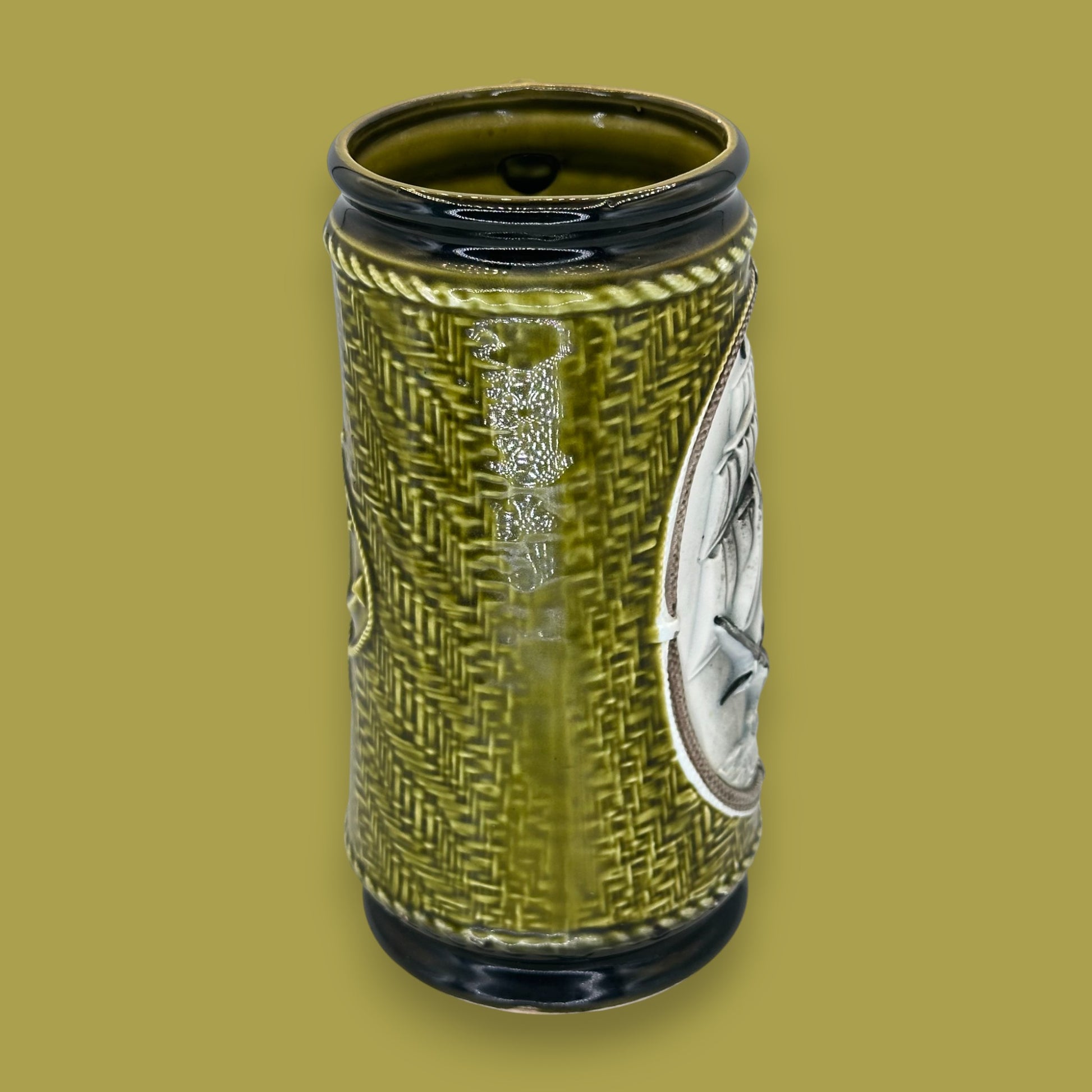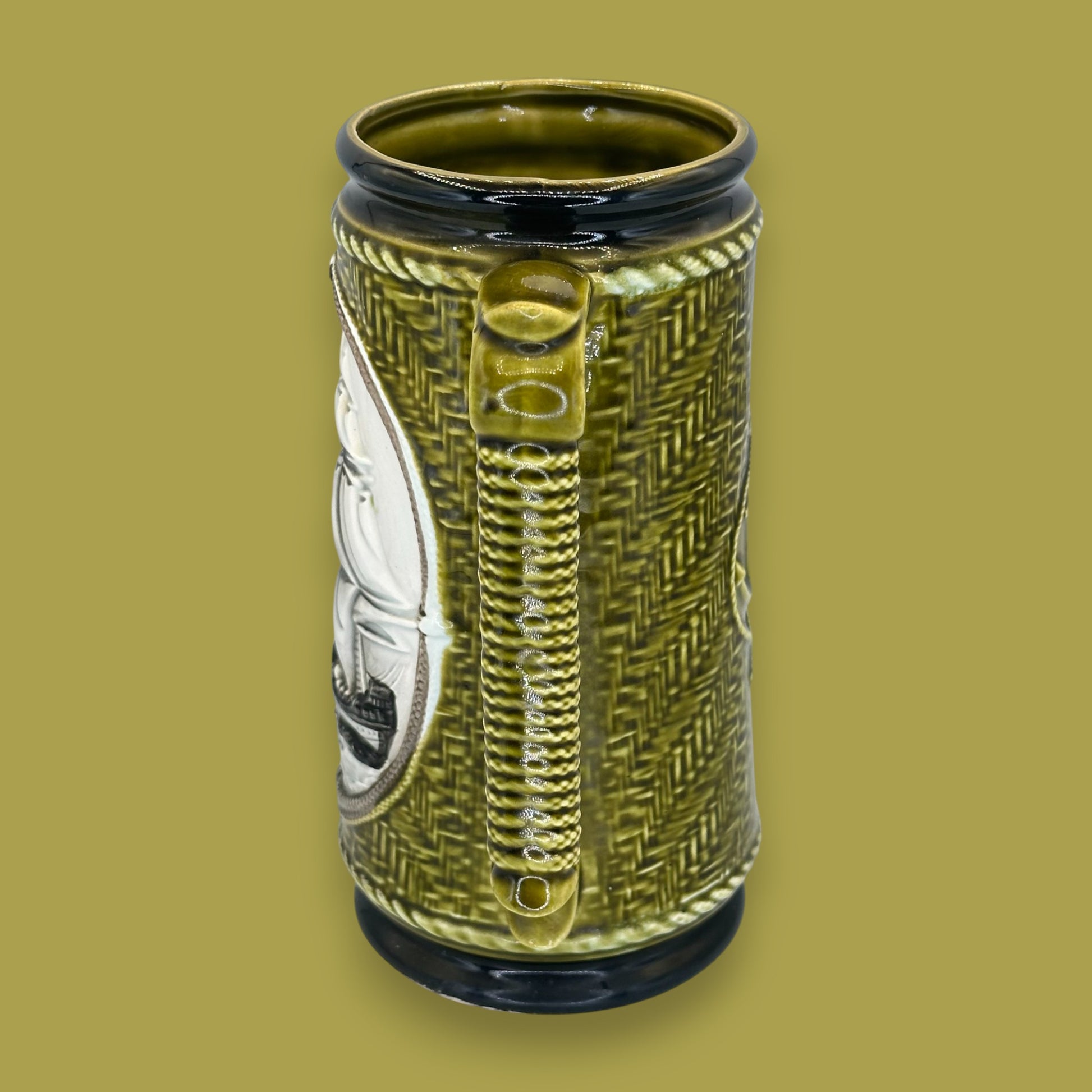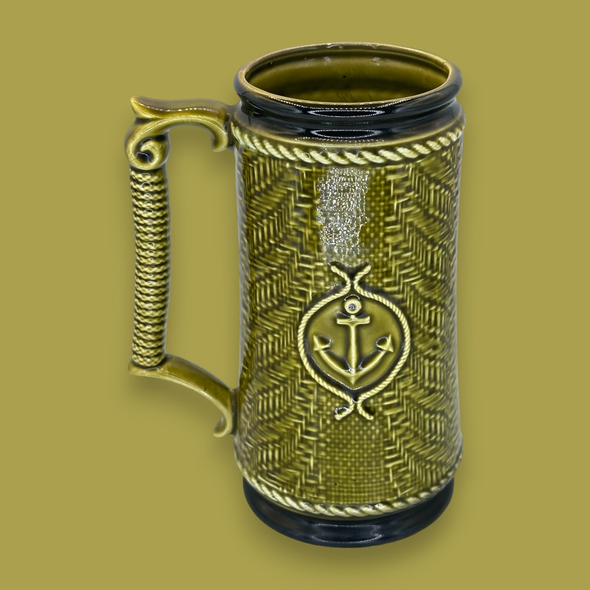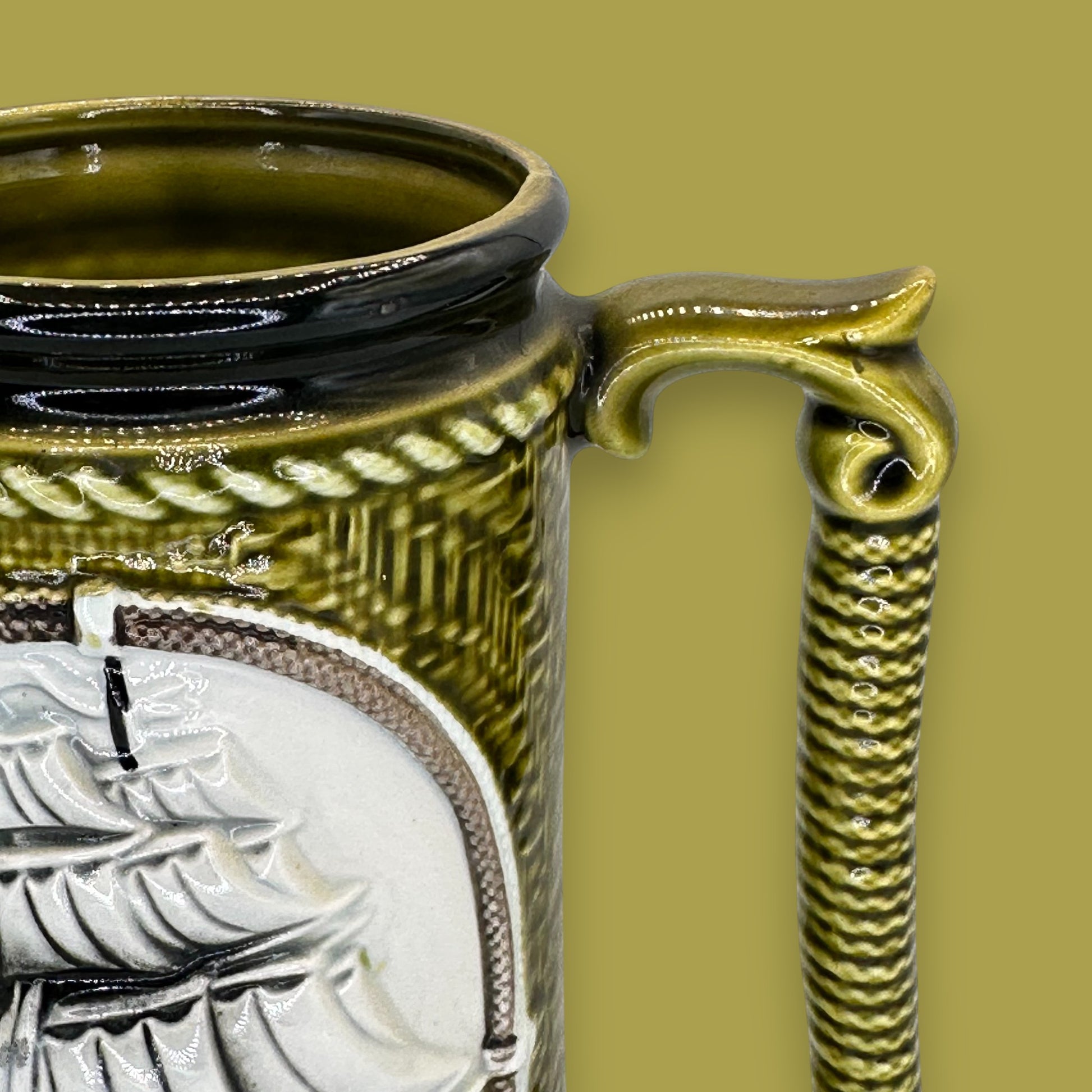 This Vintage Sailing Ship Replacement Mug brings the charm of the open seas into your home. Made in Japan, it features a beautifully embossed tall ship in full sail against textured green ceramic, framed by rope-like detailing. The sturdy handle, crafted with nautical flair, adds both function and vintage appeal. A true conversation piece for collectors and lovers of maritime history.