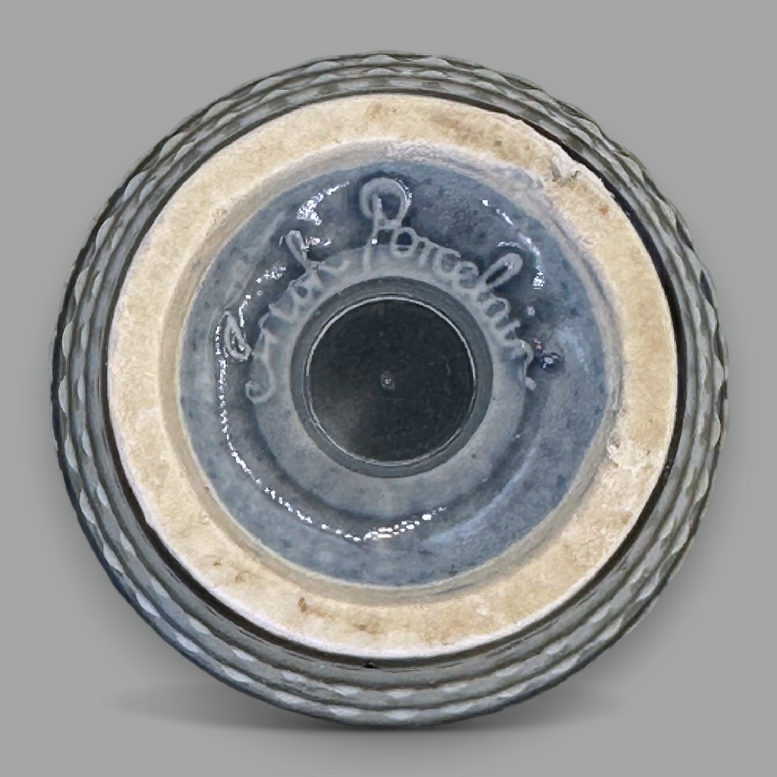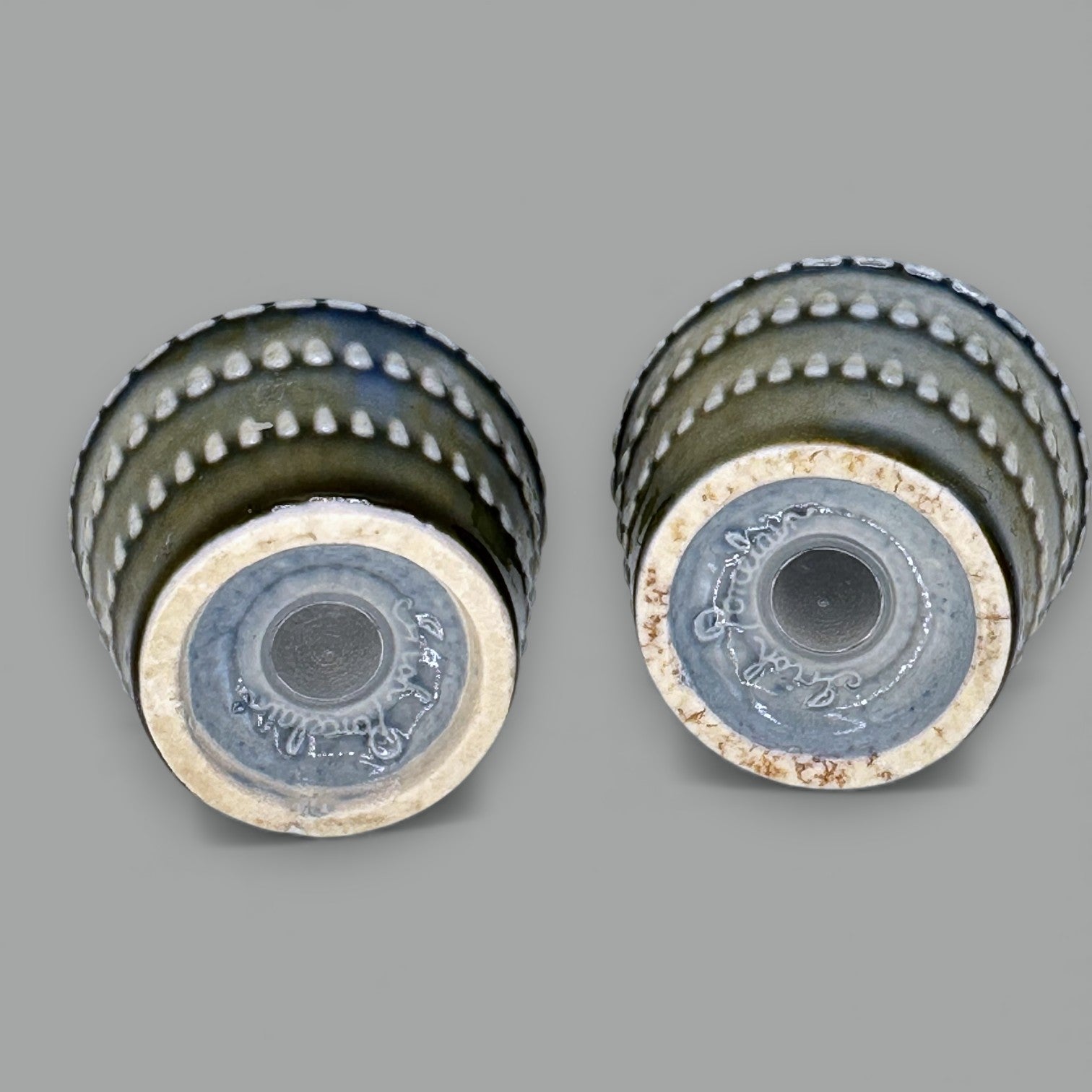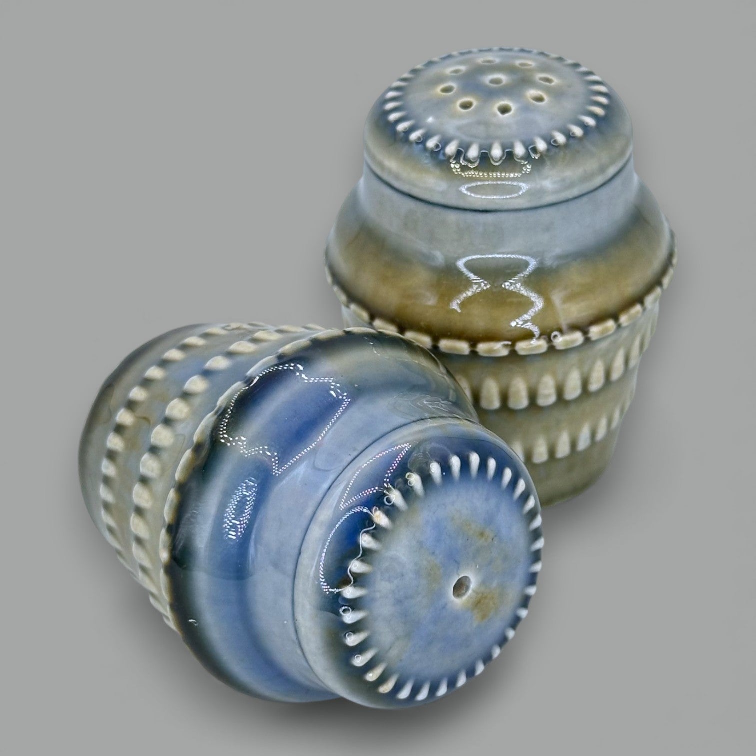 Hailing from Ireland, this charming pair of vintage shakers is crafted from Wade Irish Porcelain and features a distinctive, captivating glaze treatment. The overall palette shifts between earthy greens and rich ocean blues, showcasing an abstract, multi-colour finish that gives the pieces a lovely folk-art feel. The ceramic body is decorated with three horizontal bands of raised, white, bead-like detailing, which evoke the look of a stylized "shamrock" pattern or rows of "raindrops"—a classic, tactile element. These pieces are robust and playful, perfect for bringing a subtle bit of Irish heritage to your dining setting.
