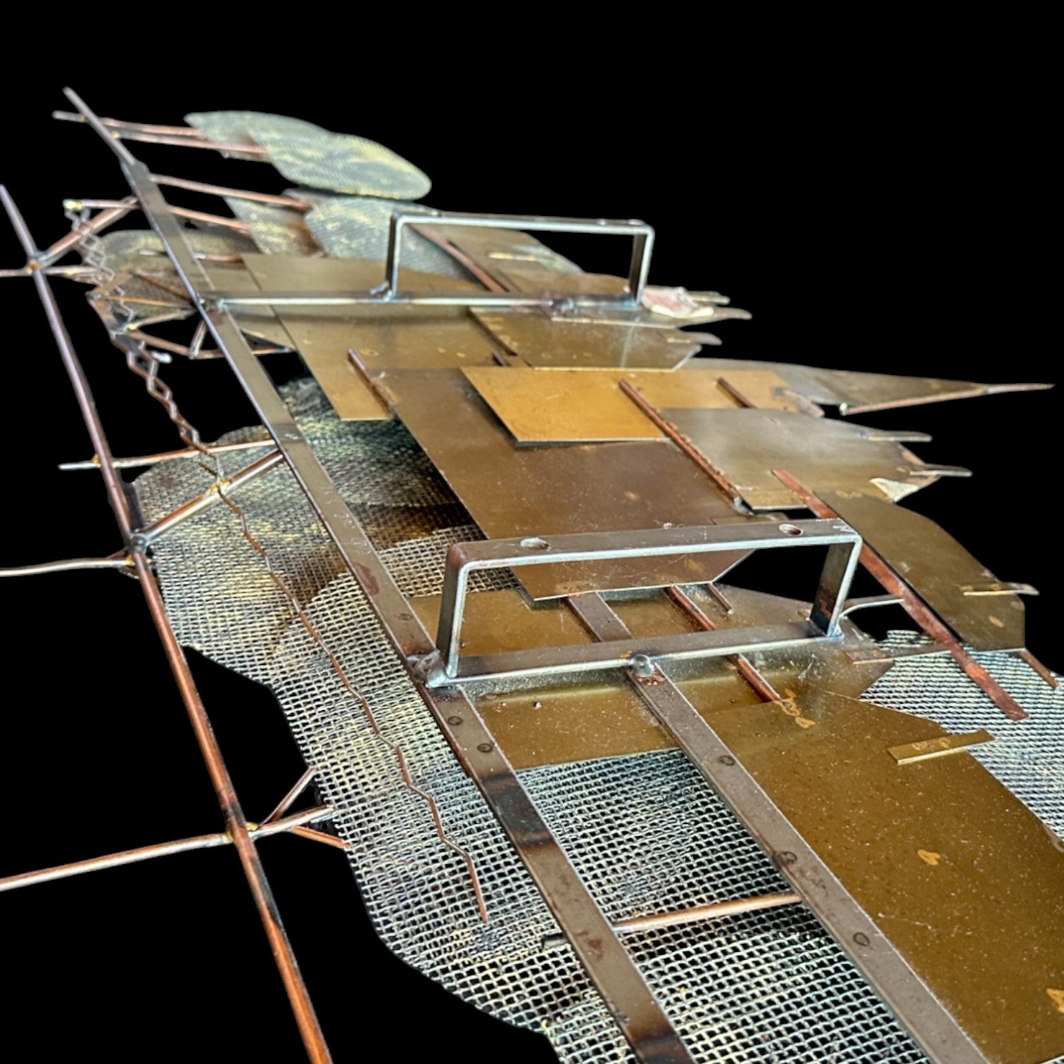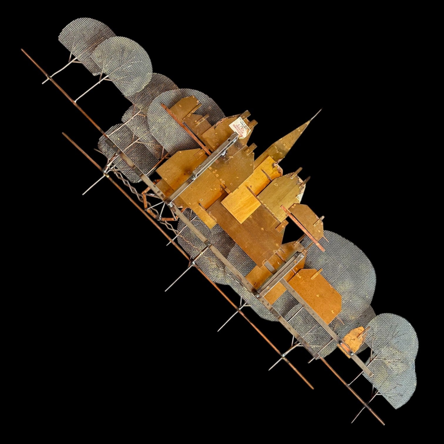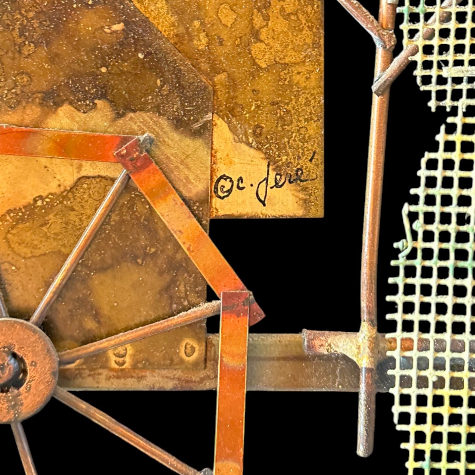Bring vintage sophistication to your space with this signed Jere brutalist wall sculpture. This dimensional metal artwork features an abstract countryside village scene, with geometric rooftops and textured mesh trees in front. Its combination of brass tones and layered depth makes it an eye-catching centrepiece perfect for modern, eclectic, or industrial interiors.