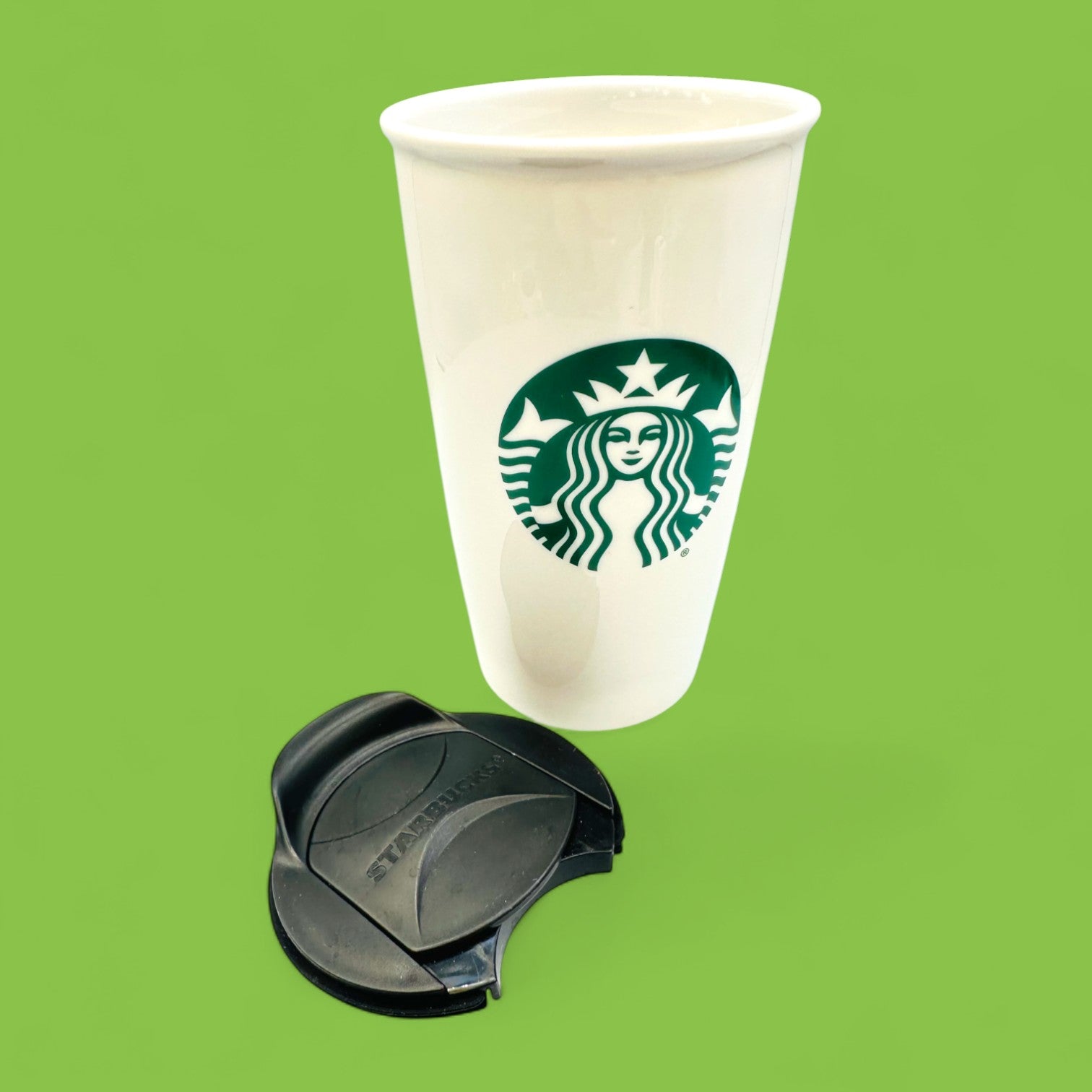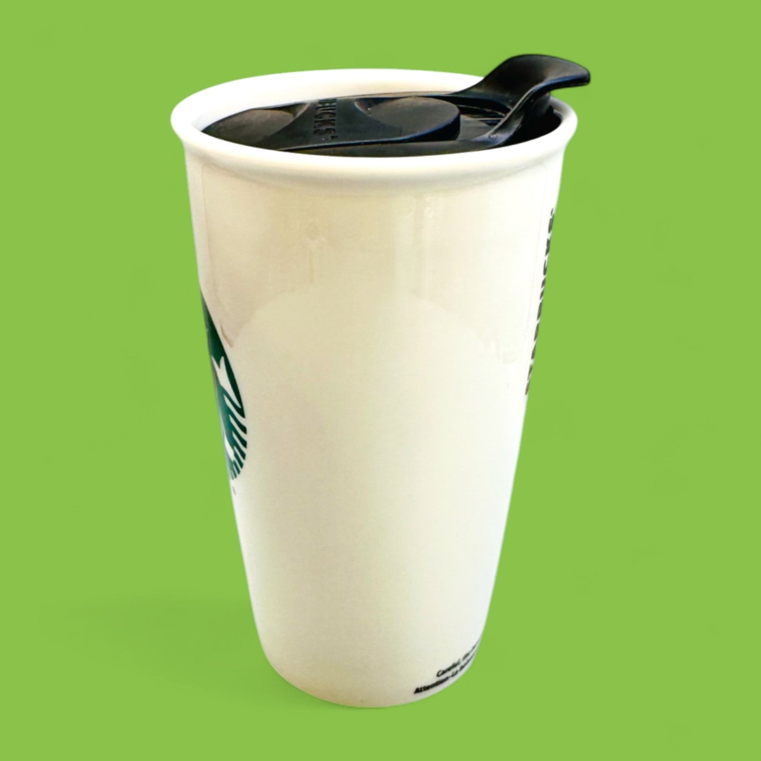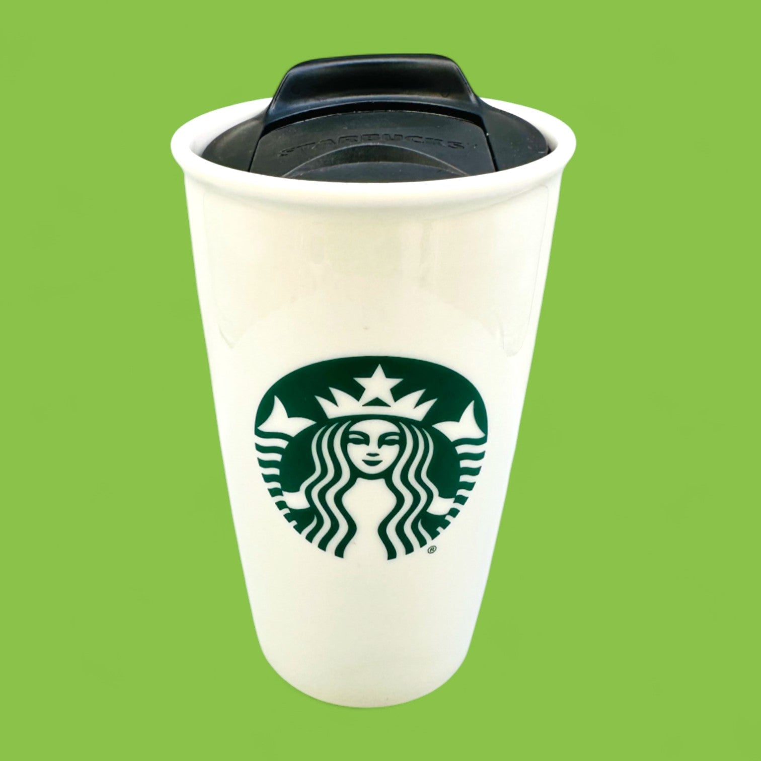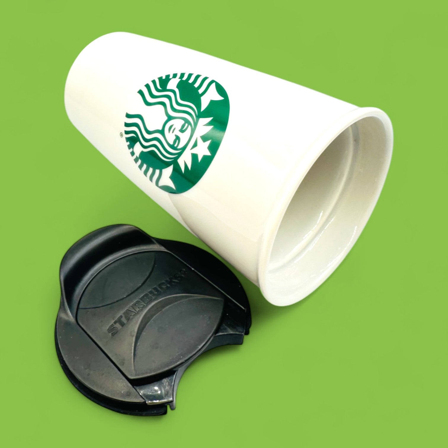 Celebrate your love for Starbucks with this 2016 Green Siren Logo Travel Mug. Crafted from durable ceramic and finished with the iconic mermaid emblem, this sleek white mug is paired with a sturdy black plastic lid. Its tall cylindrical shape, smooth glazed finish, and collectible year stamp make it a perfect companion for both everyday use and collectors.