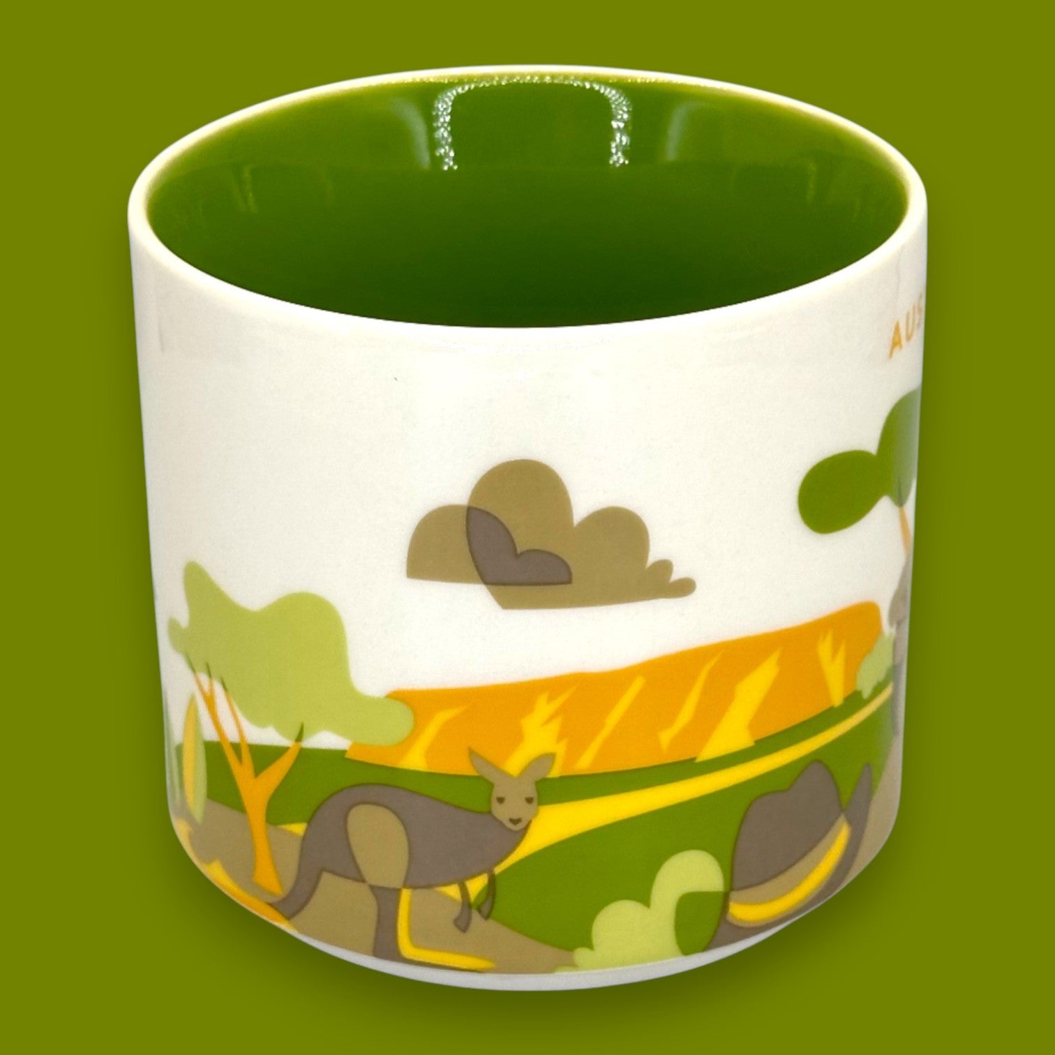 Journey to the Land Down Under every morning with this Starbucks Australia You Are Here Collection Mug. This collectible ceramic mug captures the unique spirit of Australia with its vibrant, whimsical, and colorful design featuring iconic Australian imagery like kangaroos, koalas, boomerangs, and the outback landscape. The glossy green interior perfectly complements the earthy tones of the exterior art, making every sip feel like a getaway.