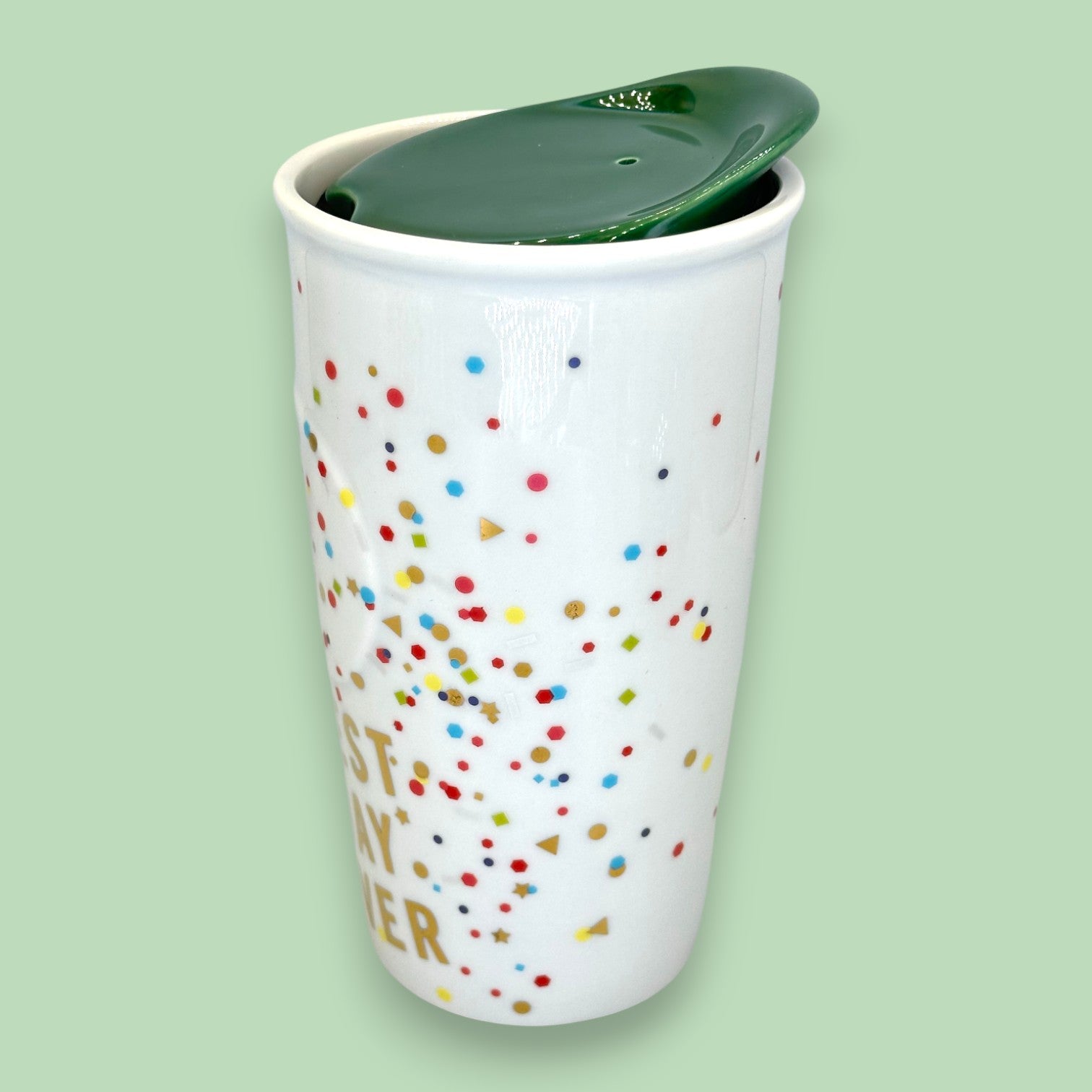 This is the sought-after Starbucks "Best Day Ever" Confetti Ceramic Traveler Tumbler, a vibrant piece from the Dot Collection (c. 2015). This double-walled travel mug features a white ceramic body with festive confetti dots and the uplifting gold lettering: "BEST DAY EVER." Topped with a signature green ceramic lid, it is both a fantastic collectible and a high-quality replacement mug.