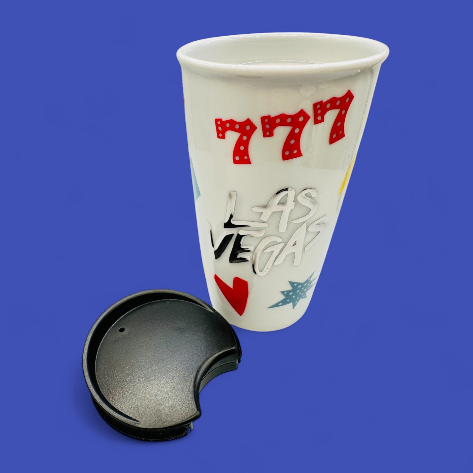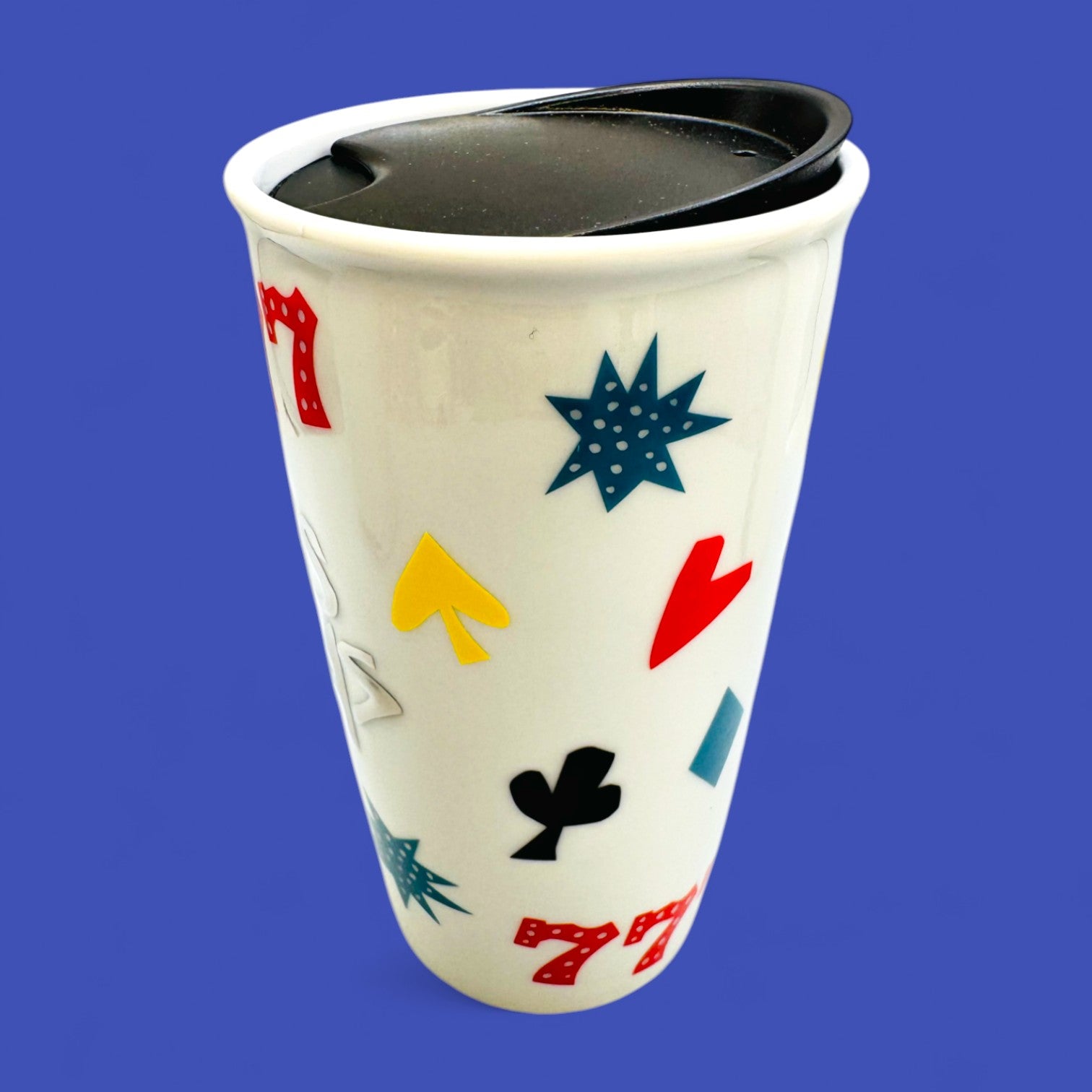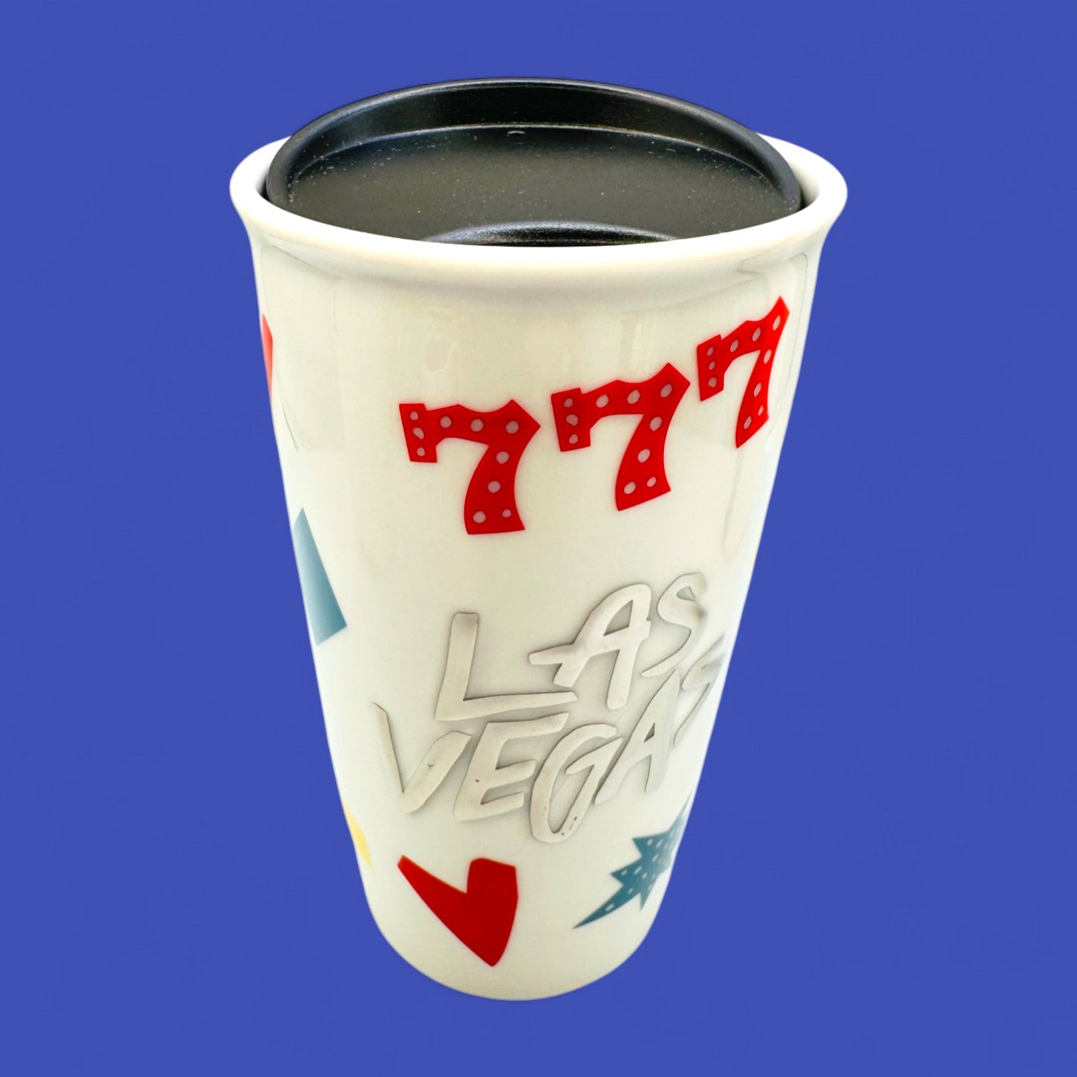 Celebrate the excitement of Las Vegas with this collectible Starbucks travel tumbler featuring bold red “777” graphics, playful card-suit icons, and modern typography. Its glossy cream finish and double-walled ceramic design help keep your drink at temperature, while the fitted black lid makes it perfect for travel. Compact yet stylish, this 10 fl oz (296 mL) tumbler is a fun nod to the city of lights and luck.