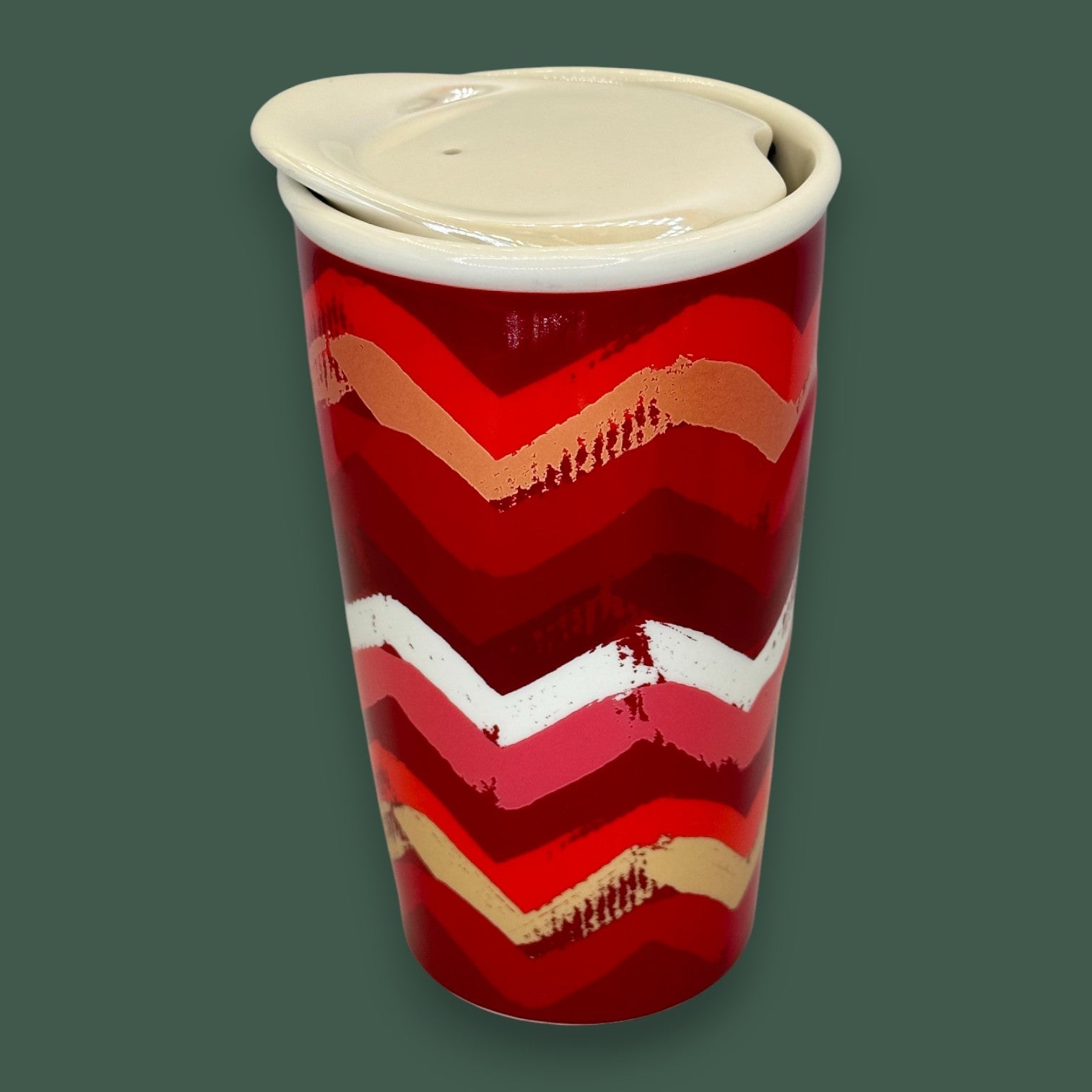 Exclusive 2014 Starbucks Red Chevron Ceramic Travel Mug Rare Limited-Edition Design with Gold Accent and Ceramic Lid.
