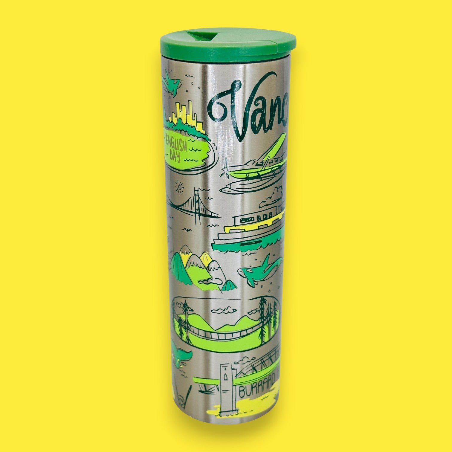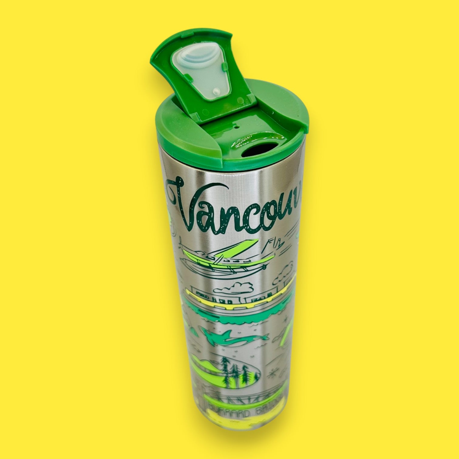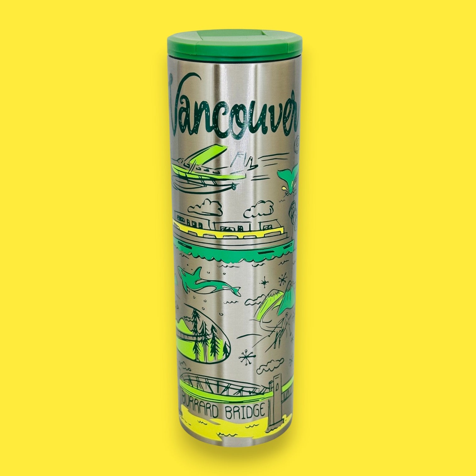 Inspired by the vivid charm of Vancouver, this stainless steel travel tumbler celebrates the city’s seaplanes, mountains, and waterfront life through lively illustrated details. Its brushed steel body paired with fresh green accents brings a modern yet artistic appeal that collectors love. Built for durability and convenience, it keeps drinks secure while adding a touch of West Coast personality to your daily routine. Whether displayed or used on the go, this piece blends practicality with the spirit of travel. As a Replacement Mug option, it’s ideal for keeping your collection complete and functional.