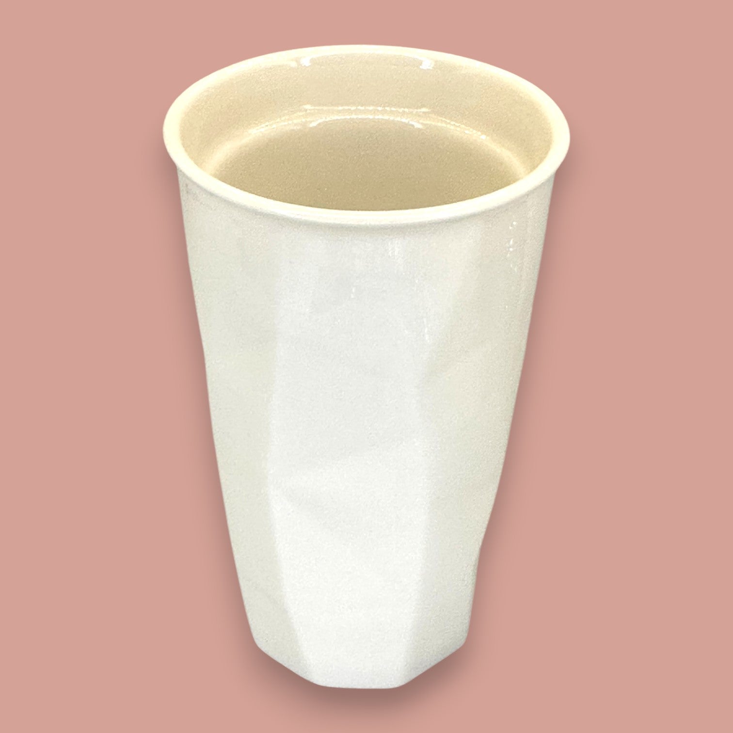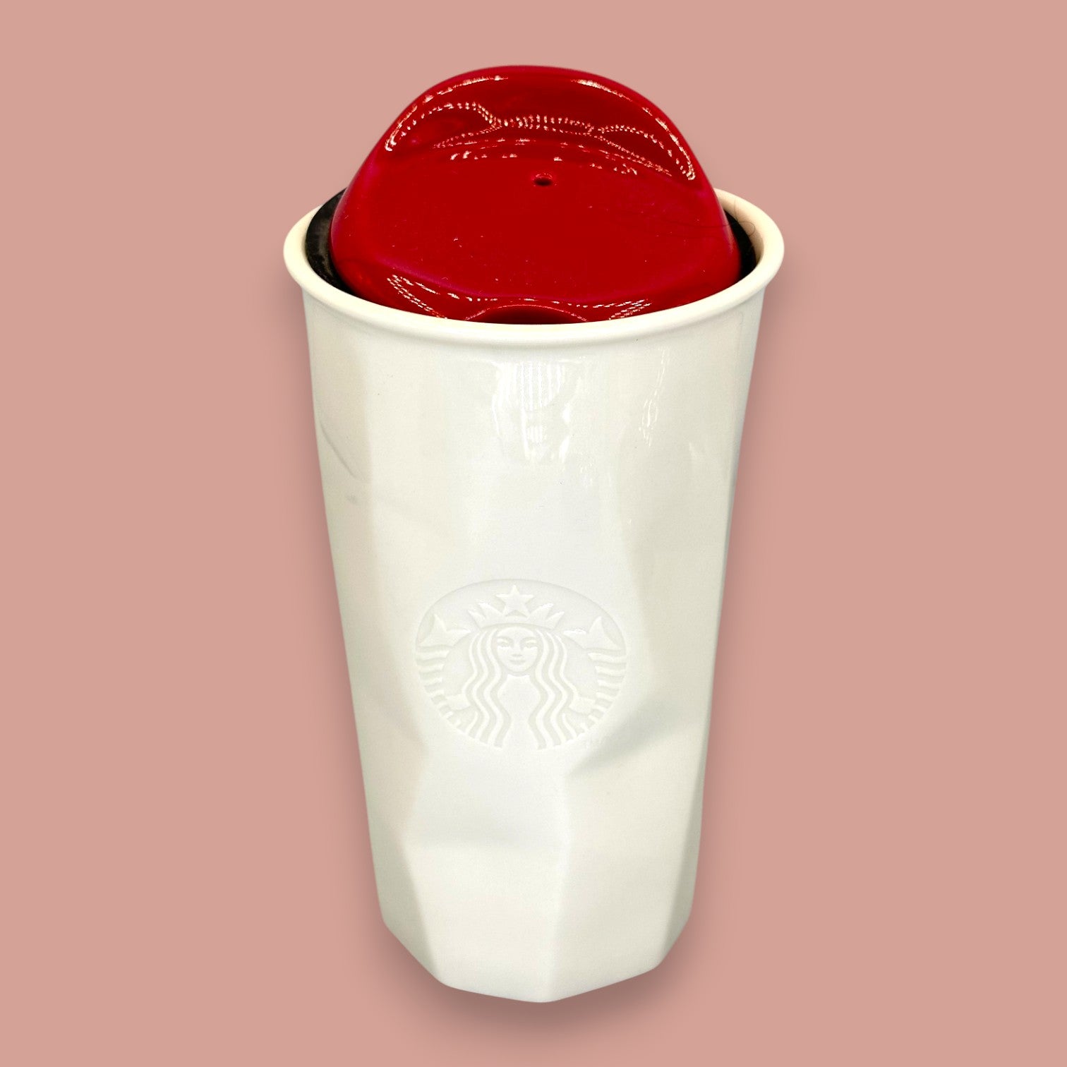This is the sleek and modern Starbucks White Faceted Ceramic Tumbler, a sophisticated design appealing to those who favor clean lines and structural aesthetics. This double-walled travel mug is defined by its distinctive faceted body, giving the smooth white ceramic a contemporary, architectural look reminiscent of a geometric cut diamond. The mug is finished with an embossed, subtle Starbucks Siren logo and a contrast glossy dark RED lid, which enhances its premium, collectible feel.