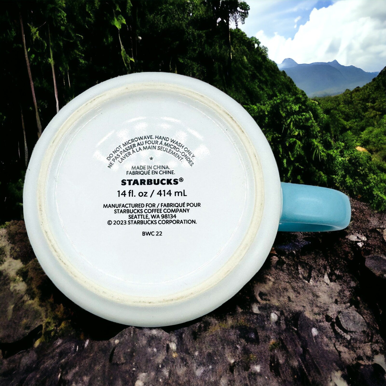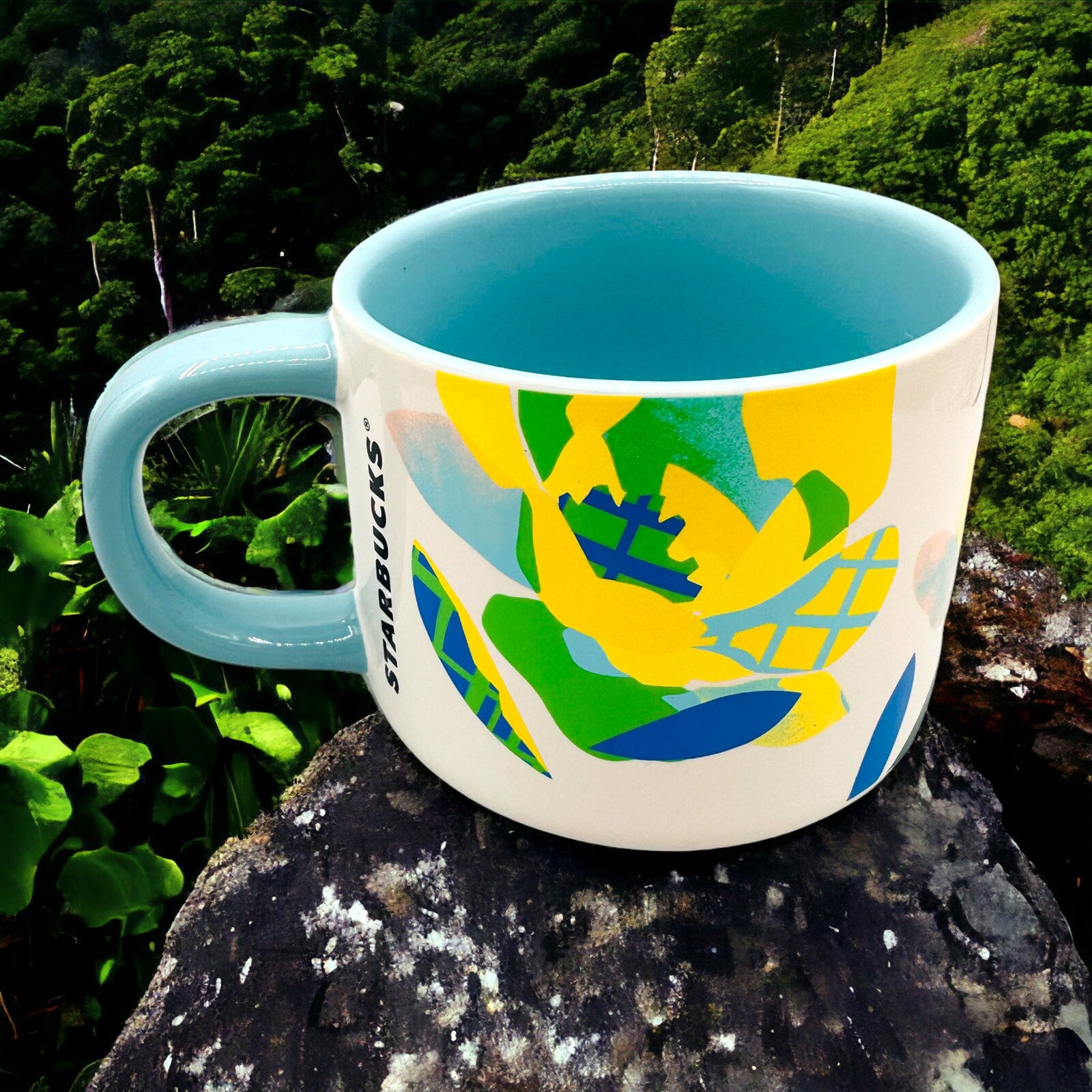 With a generous 14 fl/oz capacity, it's the ideal size for your favourite hot beverages. The baby blue interior adds a pop of colour and adds to the overall charm of this mug. Whether you're a coffee connoisseur or a tea lover, this mug is a must-have for your collection. Get ready to sip in style with the Starbucks Yellow and Green Floral Mug!