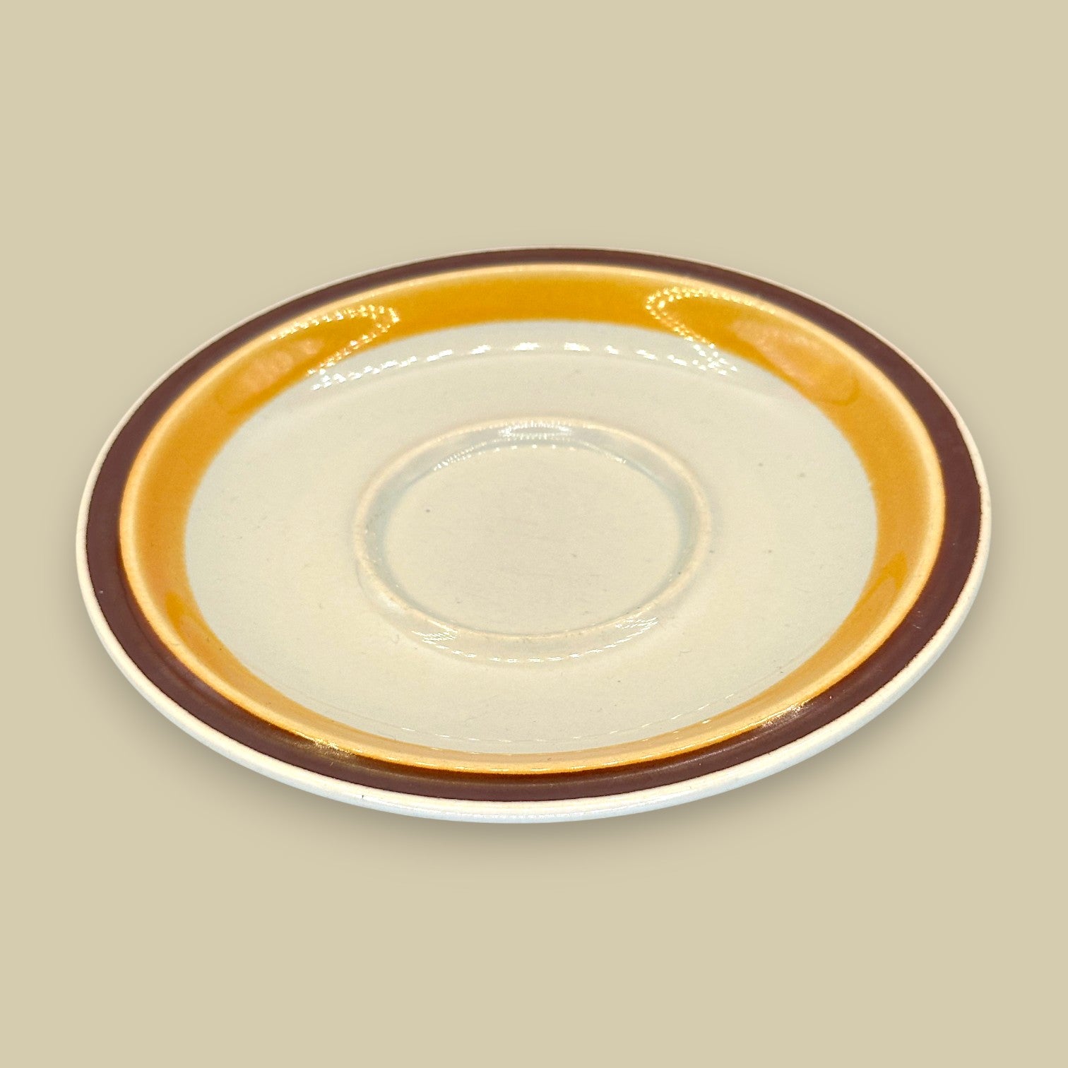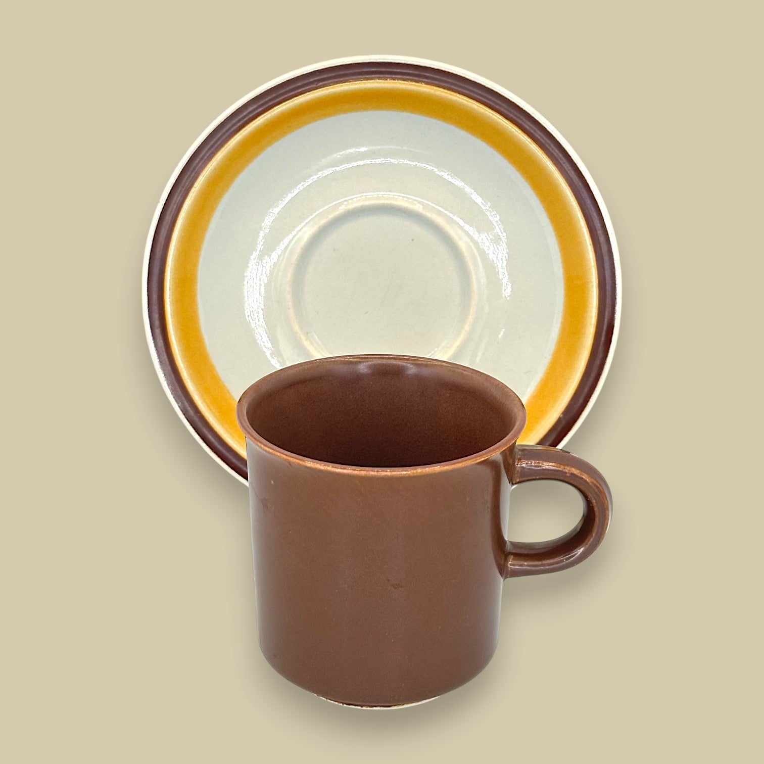 This Saycrest Stoneware cup and saucer set in the Doral Brown pattern combines functionality with mid-century charm. Featuring a deep brown glaze on the cup and a contrasting cream-and-amber banded saucer, it reflects the timeless simplicity and durability of Japanese stoneware craftsmanship. Perfect for collectors or those who love a touch of vintage style in their kitchenware.