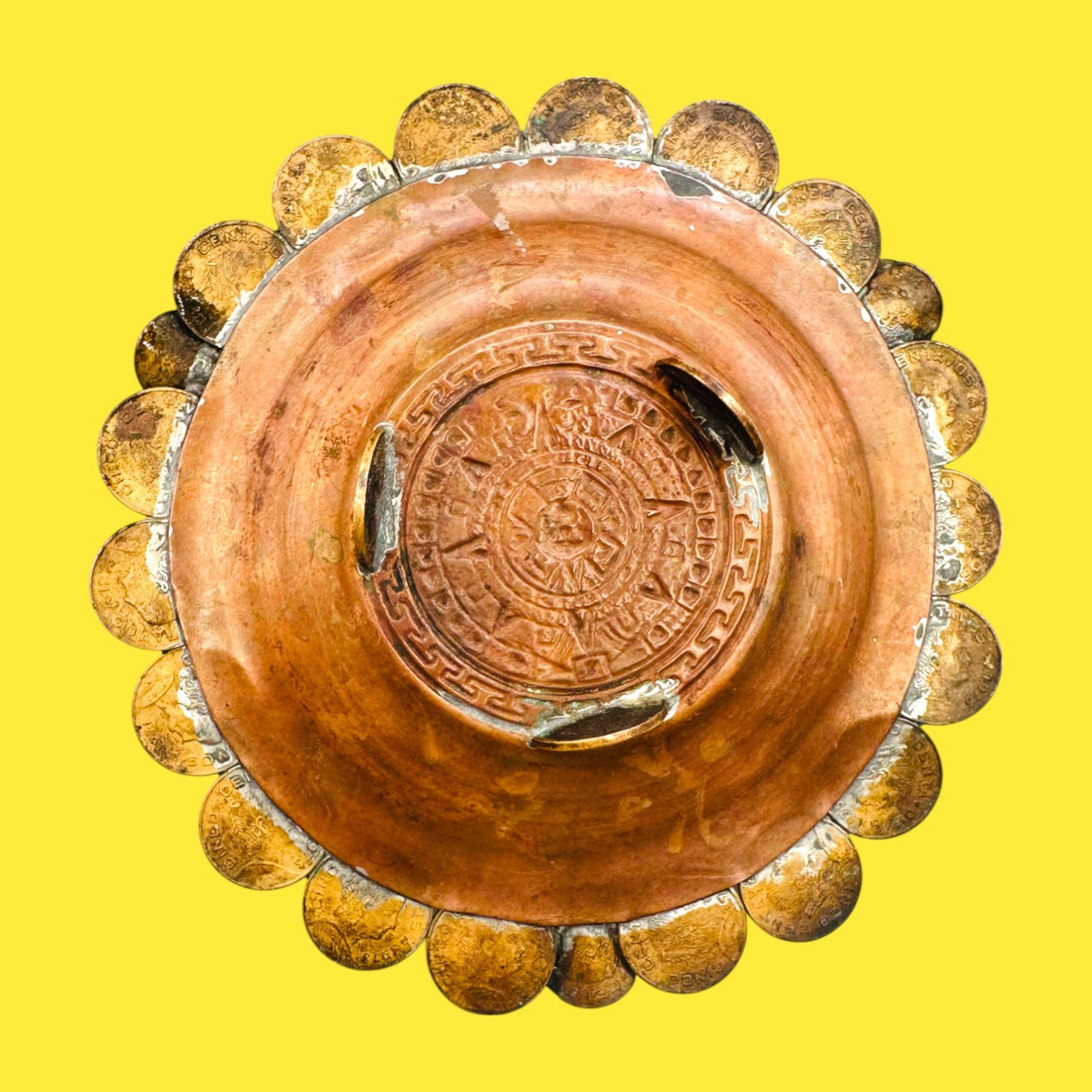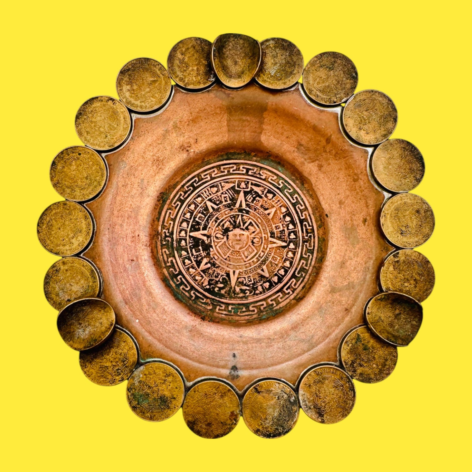 Step back in time with this vintage 1960s Mexican coin ashtray, handcrafted from authentic brass and adorned with bent Mexican centavo coins. This ashtray combines rustic charm and cultural heritage, showcasing a flower-like pattern with flared coin edges. It’s the perfect accent for a mid-century display, collector’s cabinet, or conversation piece with nostalgic appeal.