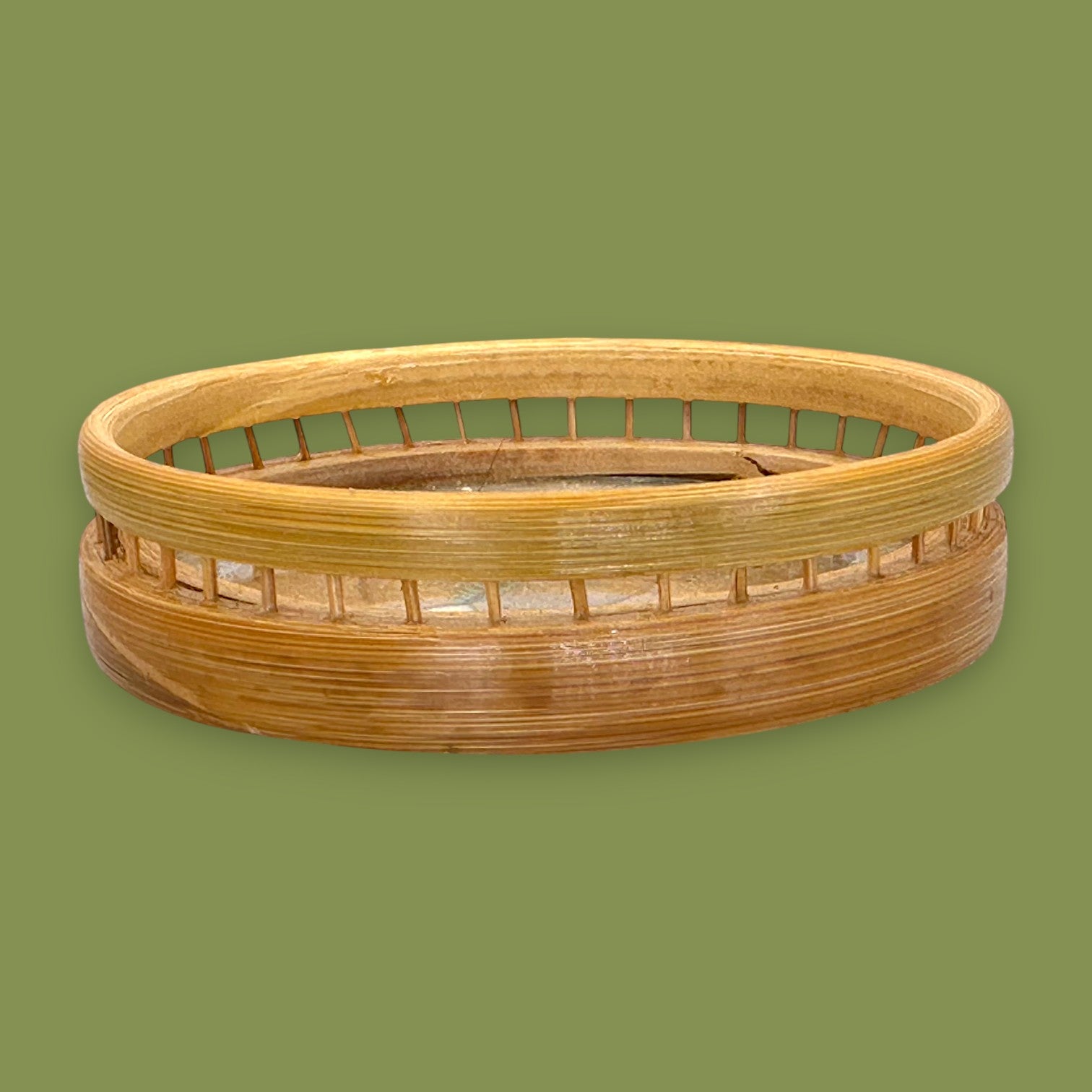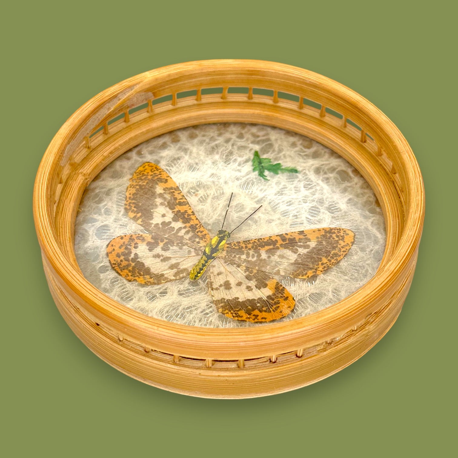Bring a touch of timeless artistry to your home with this Vintage 1970s Real Preserved Butterfly Bamboo Serving Tray and Coaster Set. Each piece showcases genuine butterflies encased in delicate resin and surrounded by pressed ferns and wildflowers — beautifully framed in natural bamboo. The combination of organic textures and vivid colours captures the serene beauty of nature in mid-century tropical style.