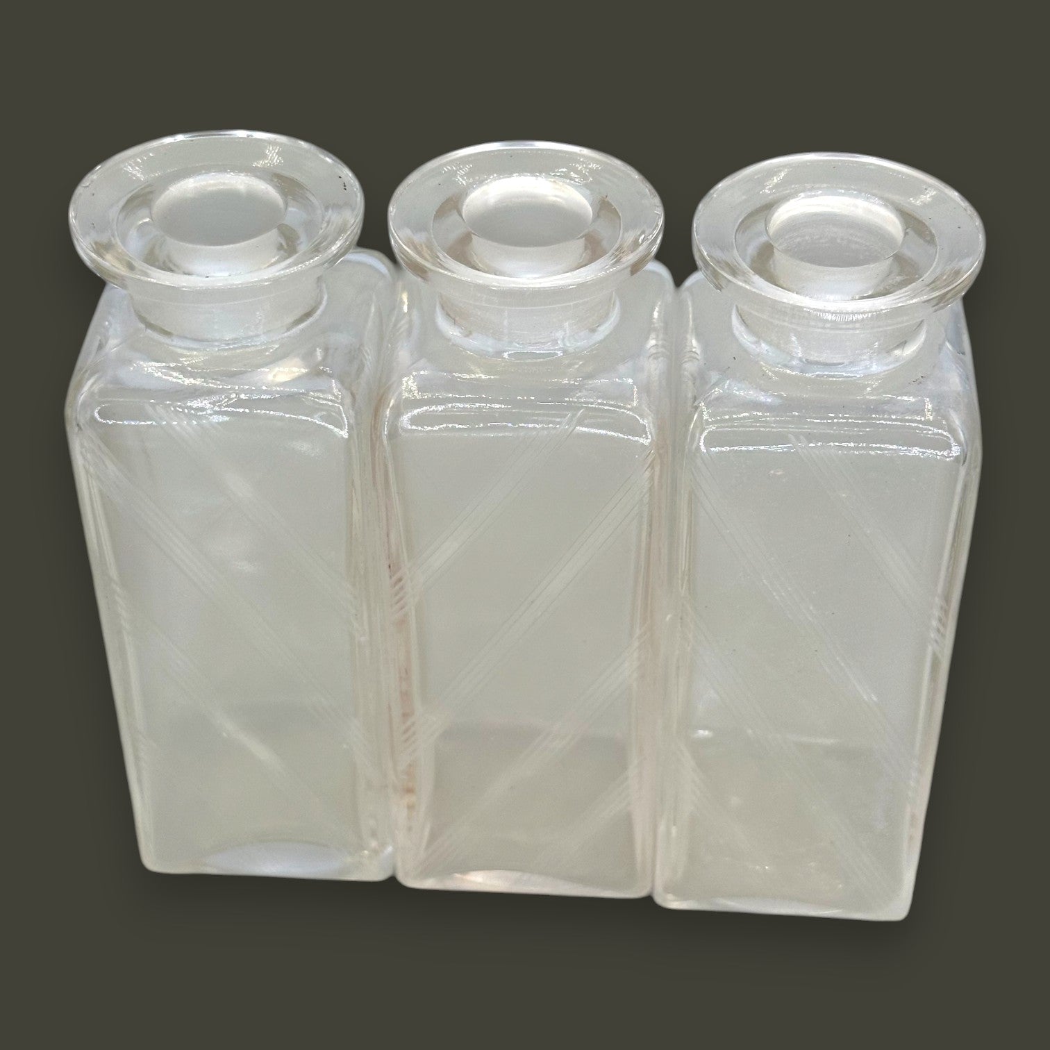 This set of three Vintage Art Deco Apothecary Bottles showcases timeless craftsmanship and refined elegance. Each bottle features a sleek square form adorned with diagonal etched striping, paired with rounded glass stoppers that seal beautifully. These pieces are perfect for collectors of antique glass, vintage decor, or anyone with an appreciation for Art Deco design. Their clarity and linear etching capture the minimalist sophistication of early 20th-century style.