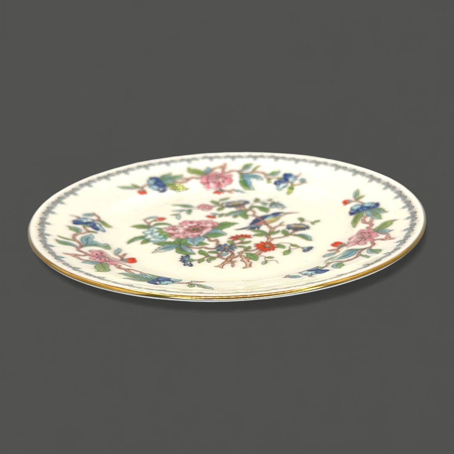 This vintage Aynsley Pembroke plate showcases one of the company’s most beloved eighteenth-century revival patterns, featuring colourful florals intertwined with the iconic blue bird. Crafted from fine bone china in England, the piece is known for its delicate translucence, crisp white glaze, and beautifully detailed artwork. The gold trim adds a refined finishing touch, enhancing the traditional charm of the design. As a reproduction of an early Aynsley pattern, it carries both historic inspiration and modern craftsmanship. Whether displayed or used for serving, it offers a touch of English porcelain beauty to any home.