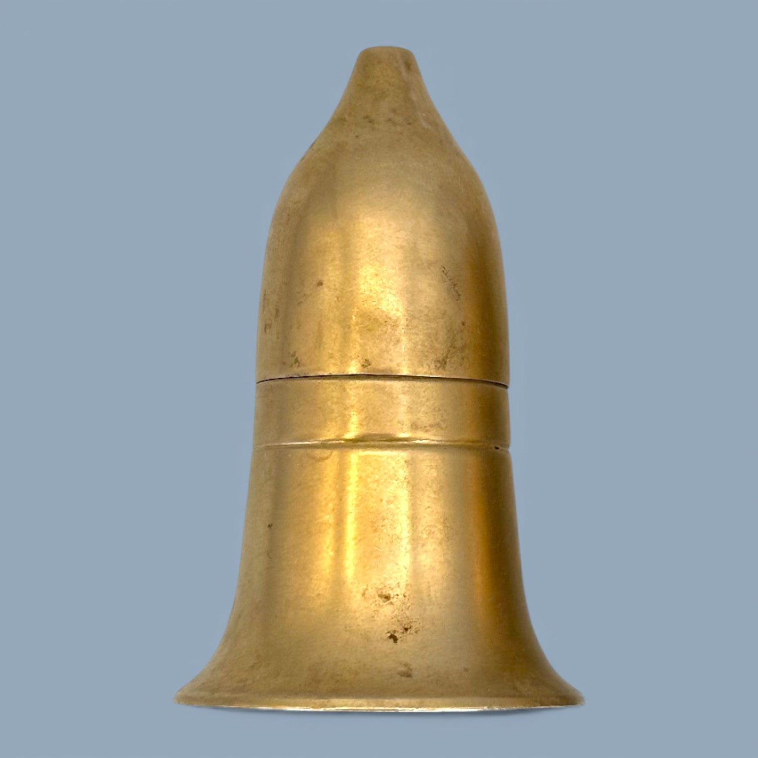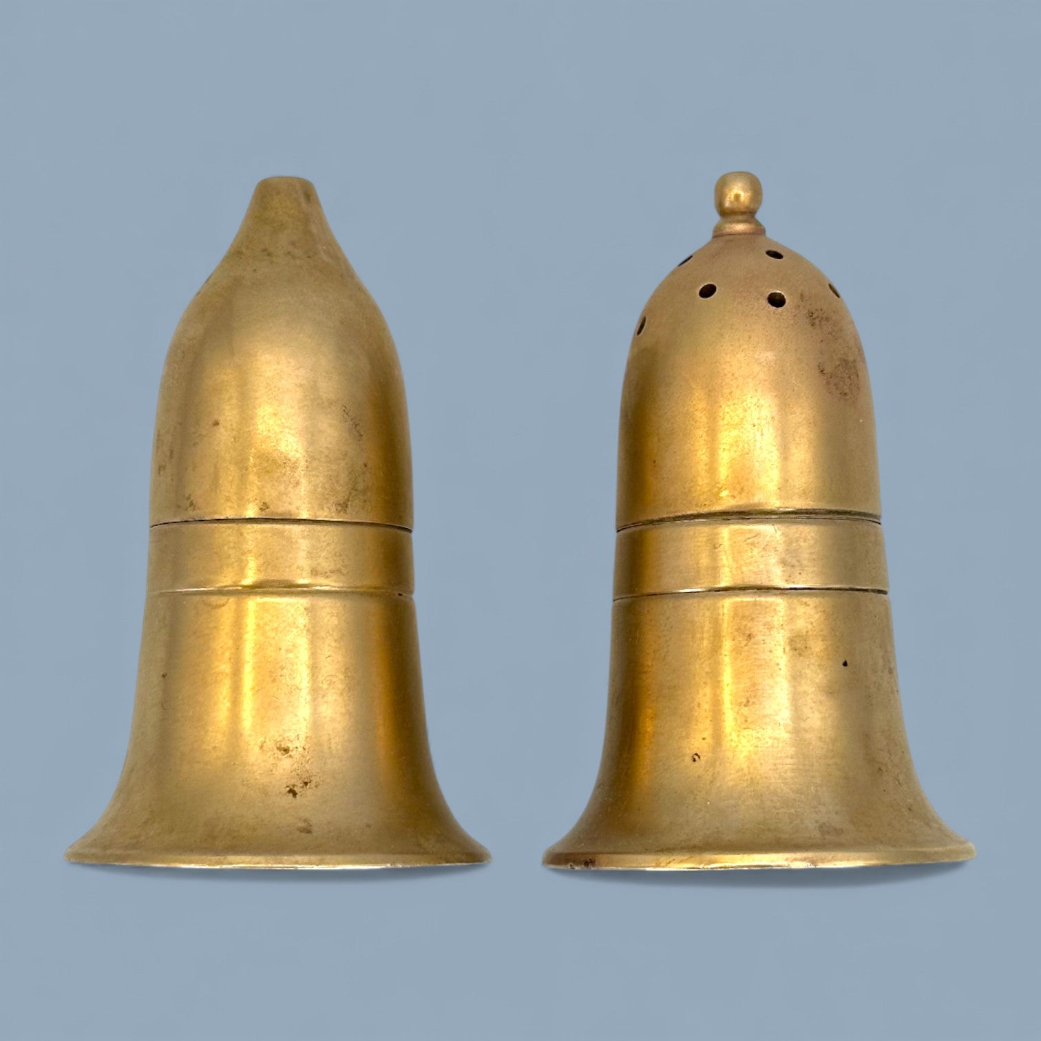 This vintage pair of salt and pepper shakers is crafted from solid brass and shaped in a distinctive bullet-inspired form. The smooth tapered bodies flare gently at the base, giving them a sculptural yet functional silhouette. One shaker features evenly spaced perforations on the top, while the other has a single opening, maintaining classic salt and pepper distinction. The brass surface shows natural patina, light surface marks, and age-related wear that enhance their vintage character. Strong, weighty, and visually striking, this set reflects practical mid-century design with an industrial edge.