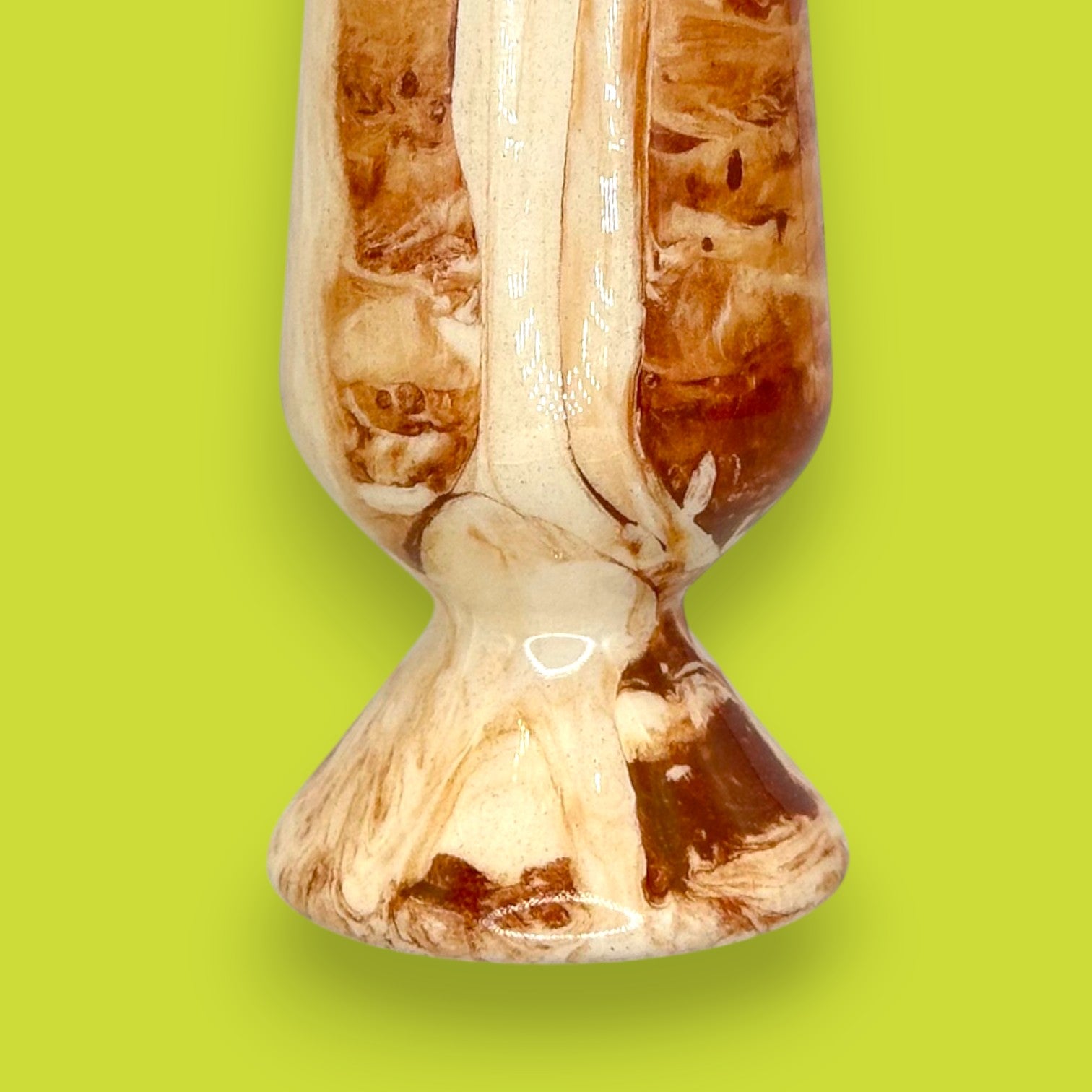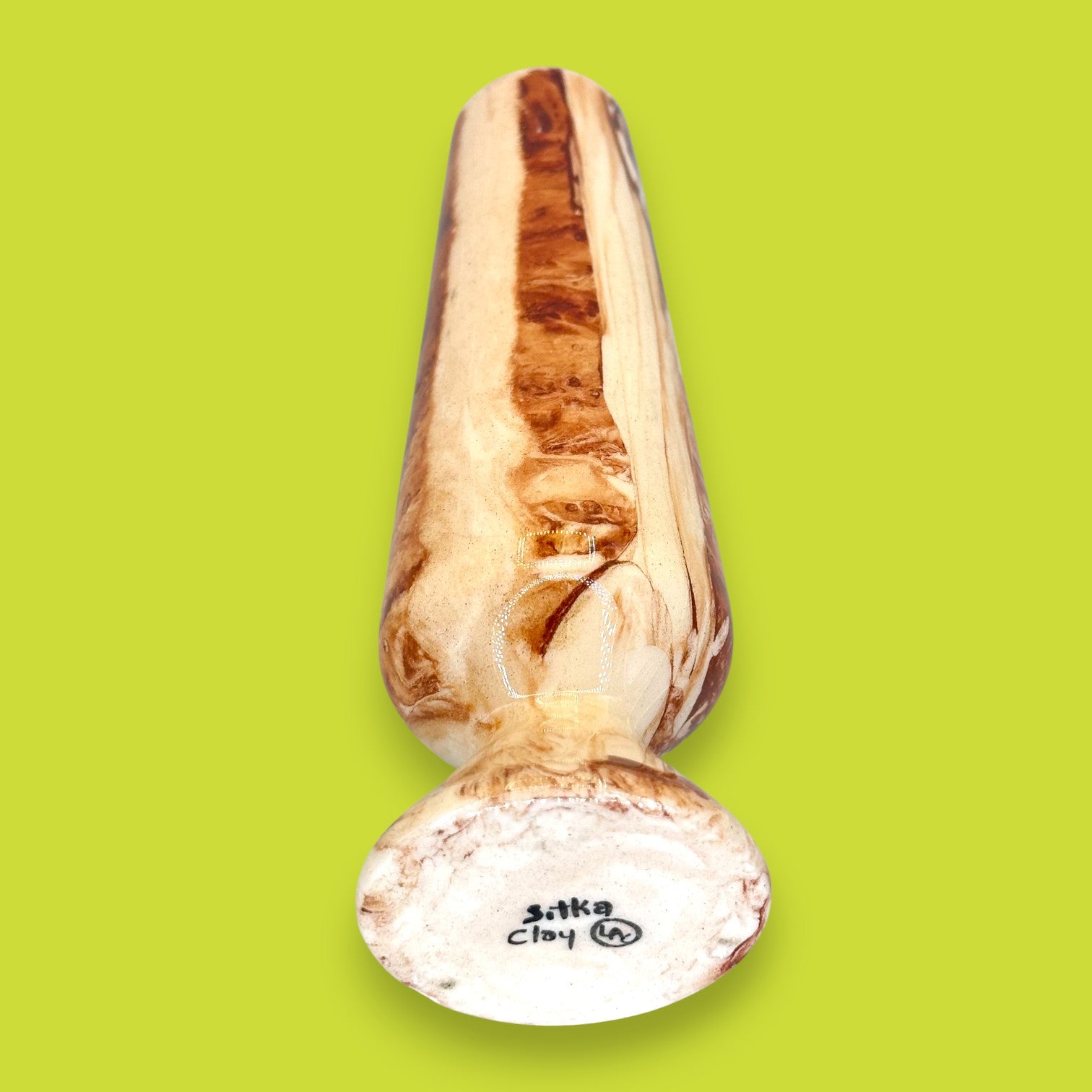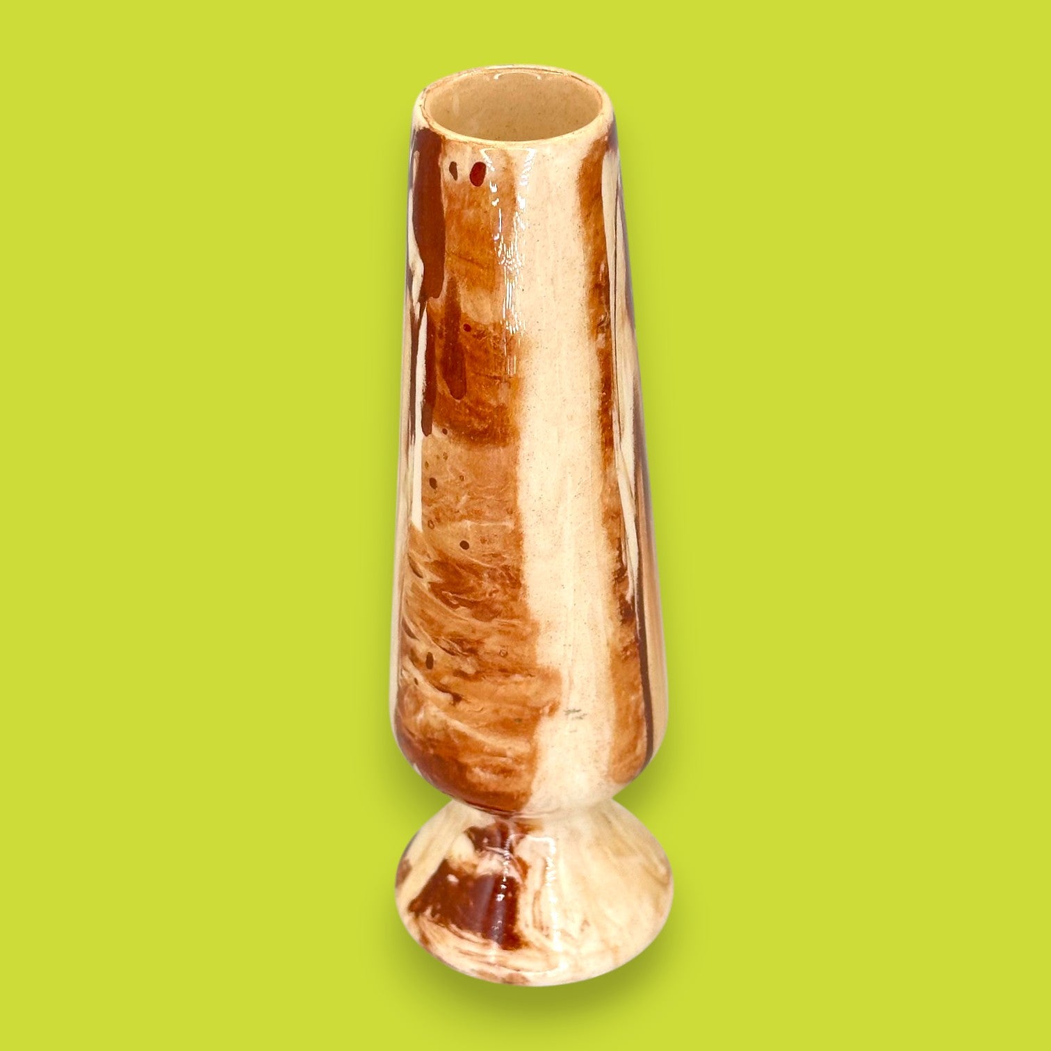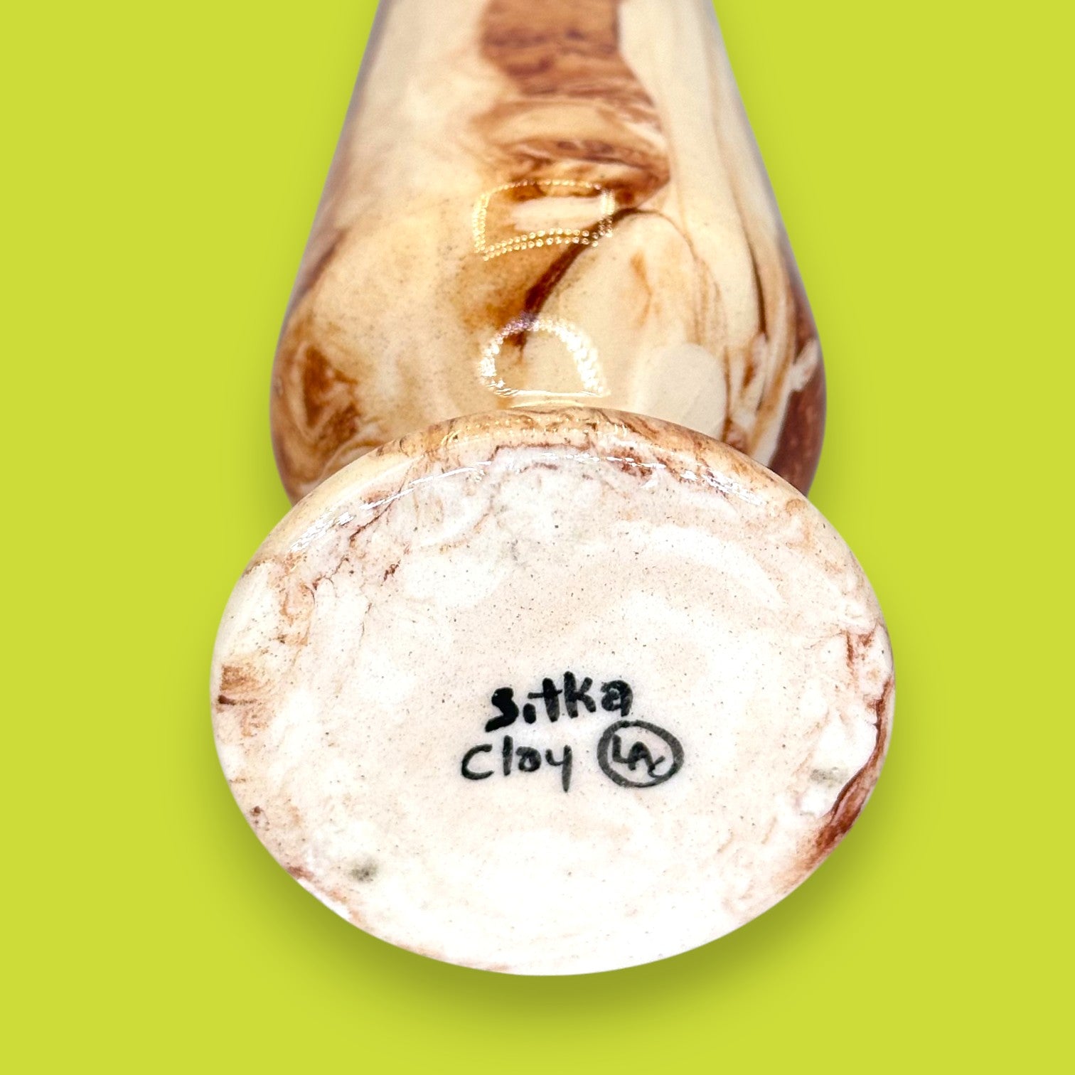 This vintage brown ceramic vase from the 1980s captures the earthy essence of artisan pottery. Handcrafted with swirling marbled tones and a glossy glaze, it brings warmth and organic elegance to any setting. Marked “Sitka Clay,” it reflects the maker’s dedication to natural form and texture — a subtle yet captivating piece that complements both rustic and modern interiors.