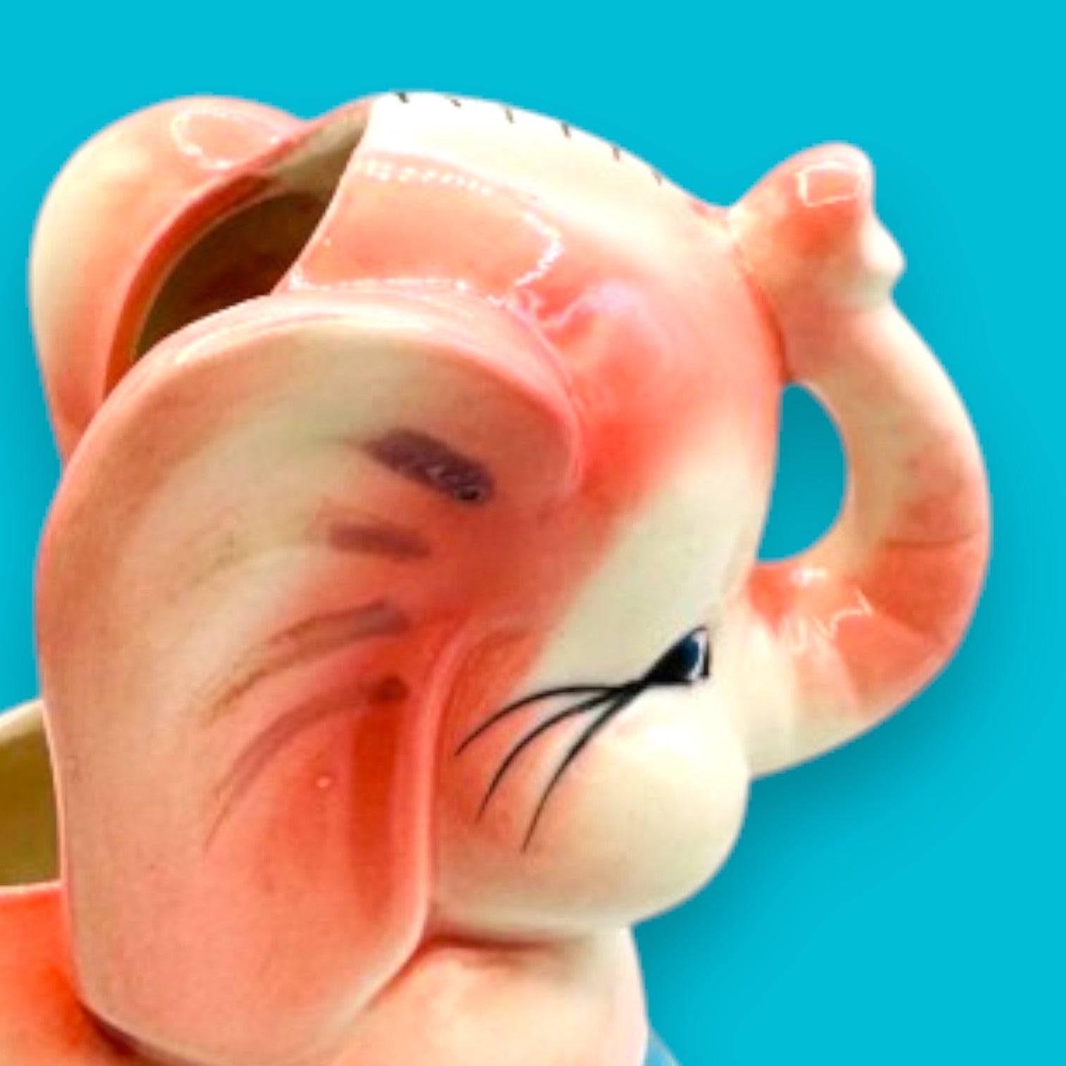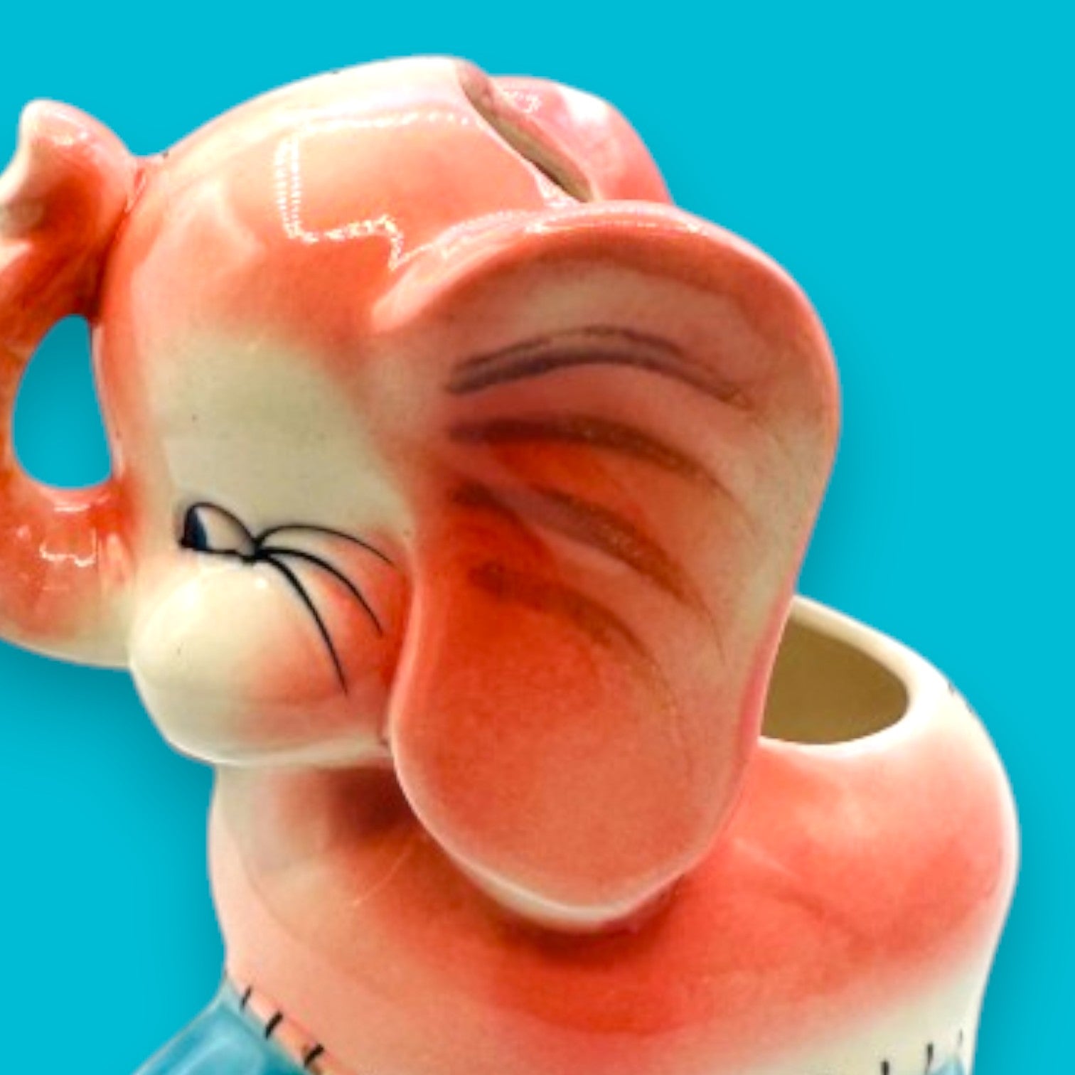 This vintage circus elephant planter captures the playful spirit of mid-century kitsch design. With its hand-painted pastel pink, blue, and white glaze, this cheerful ceramic piece was made in Japan and radiates charm from every angle. Its cartoonish features and oversized ears bring a lighthearted feel, while the planter opening adds practical function. Perfect for showcasing a small plant or simply as a decorative accent, it embodies the nostalgic fun of 1950s–60s home décor.