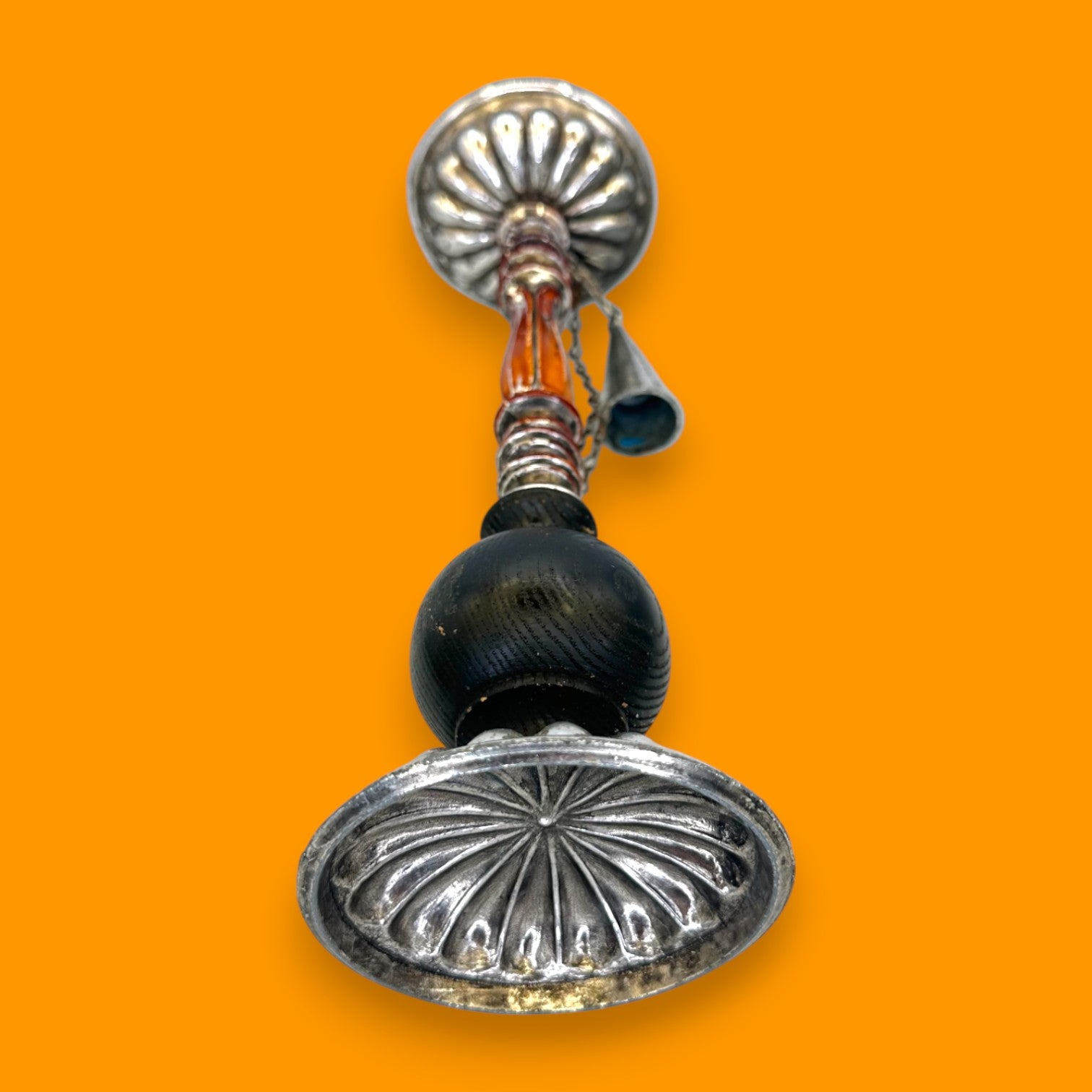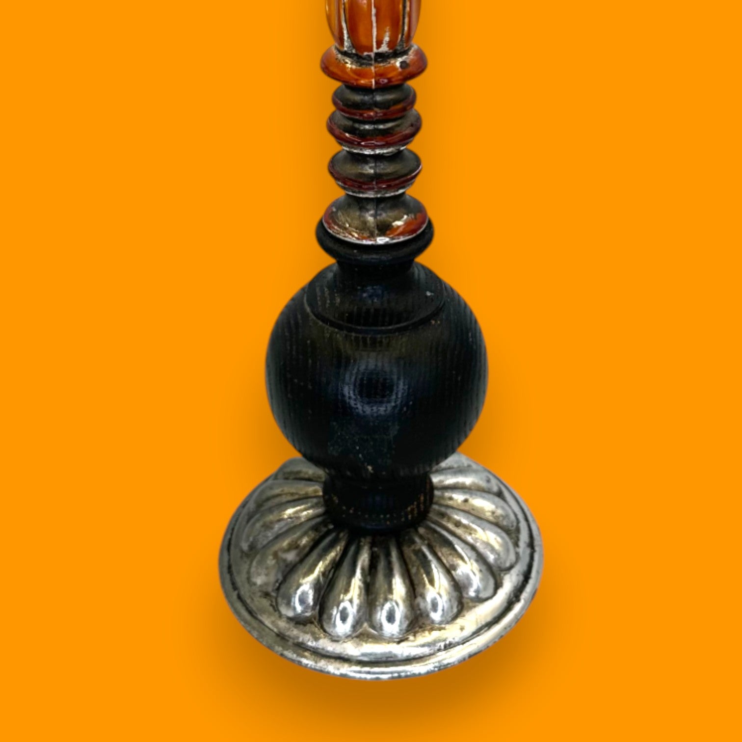 This vintage Dilly silver-tone cast metal candle holder exudes old-world charm with its intricate detailing and rich patina. Designed with a tall pillar silhouette, it features a beautifully balanced base and stem accentuated by a warm amber-toned glass section. The attached chained snuffer adds both convenience and a touch of sophistication, making it a stunning centerpiece for mantels, tables, or vintage décor displays.