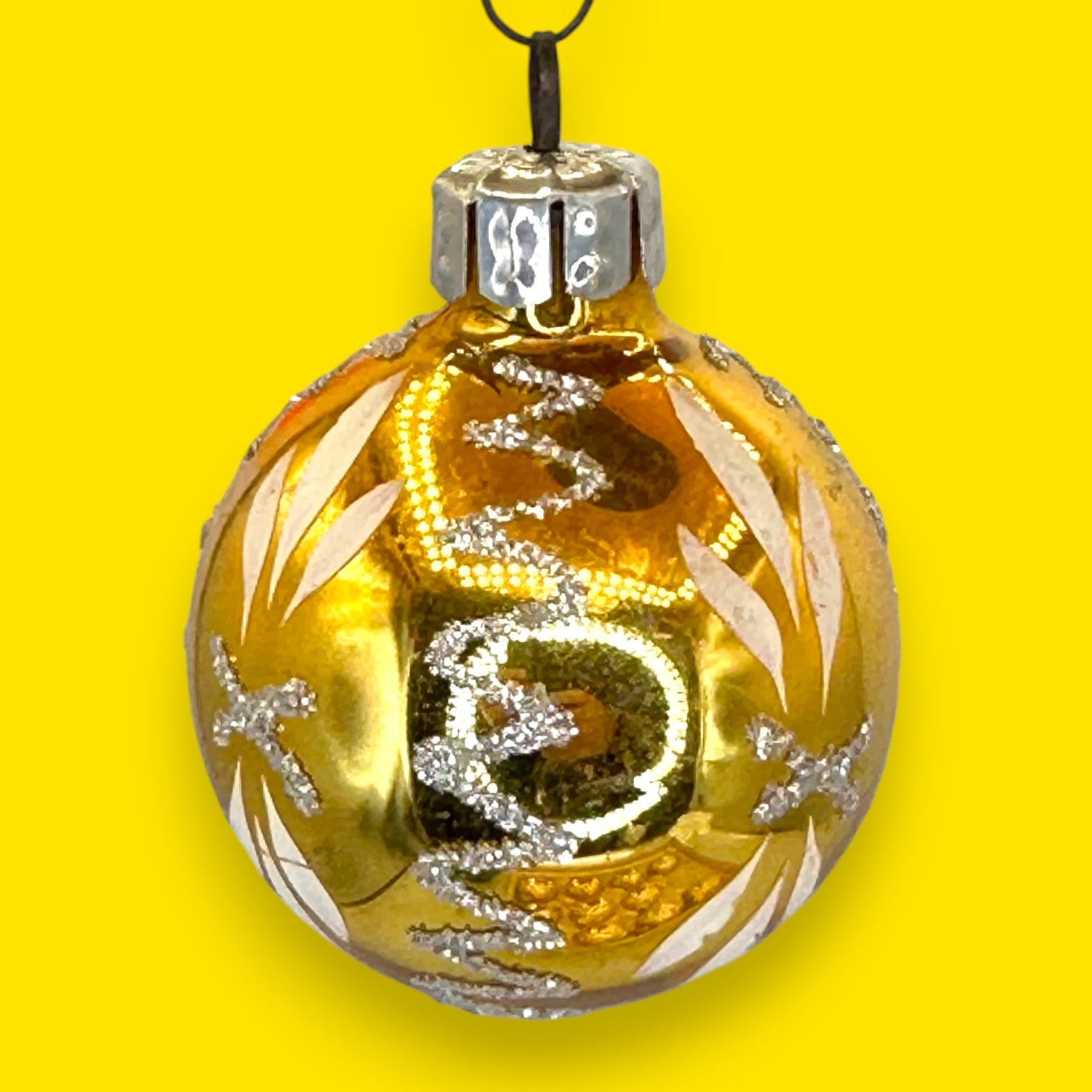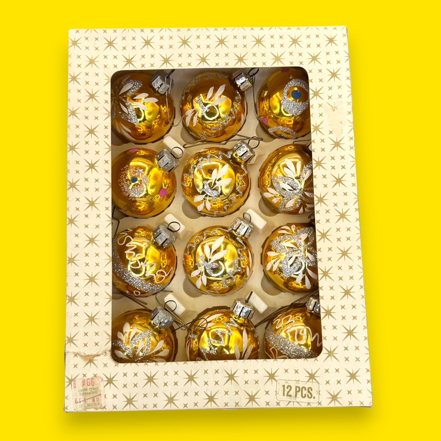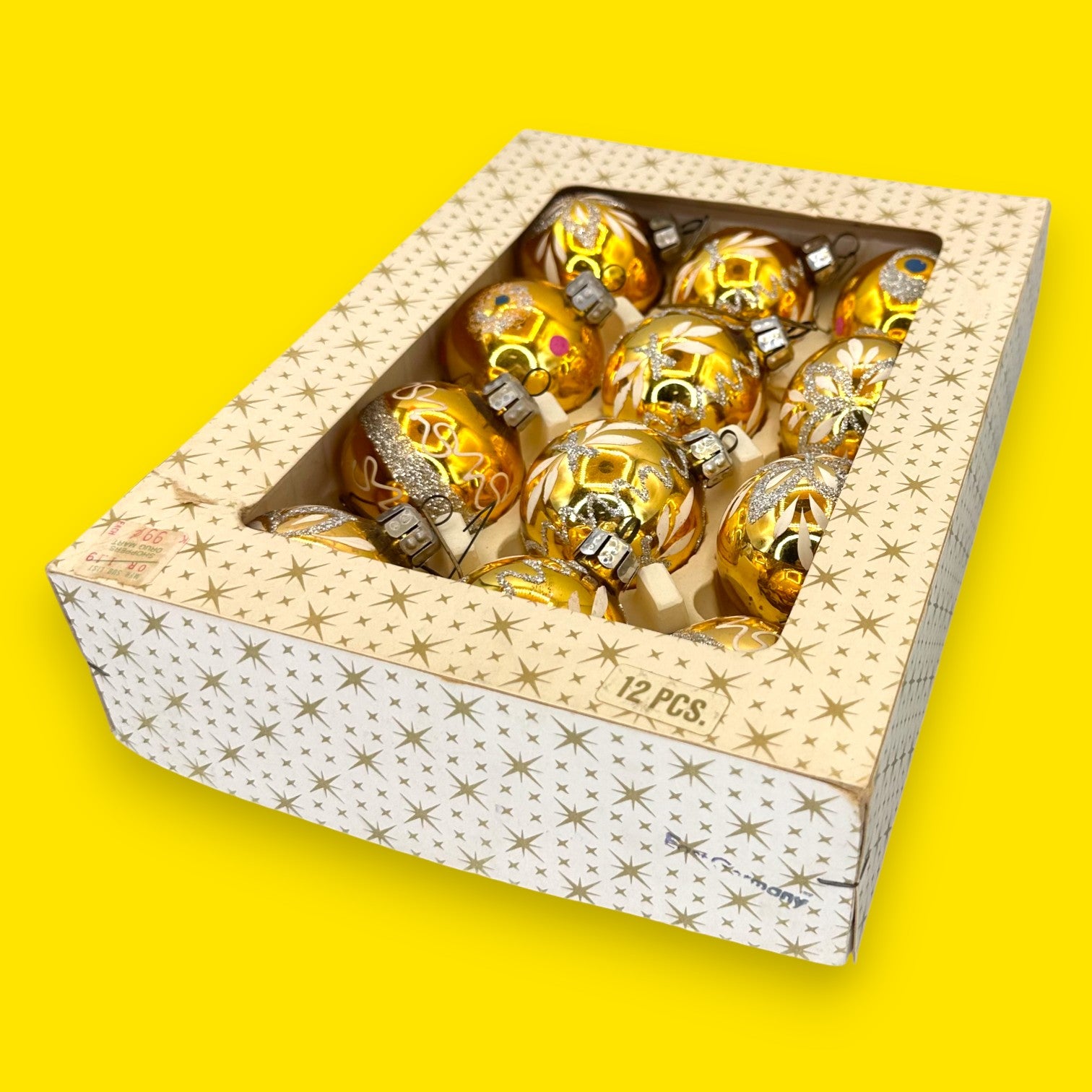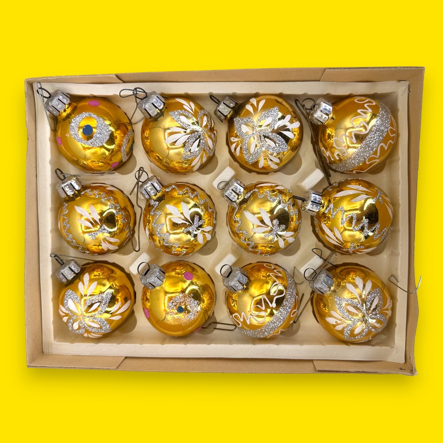 This stunning box of 12 mid-century, gold-mercury glass Christmas baubles features a variety of hand-painted white, silver glitter, and magenta-dotted patterns. Made in West Germany, these tiny treasures likely date from the 1960s. They have a brilliant, reflective golden hue, with some ornaments showcasing intricate floral designs, others elegant swirls of glitter, and a few with playful polka dots. This exquisite, well-preserved set offers a genuine slice of Christmas history, making your holiday décor feel wonderfully nostalgic and truly special. They will instantly elevate your tree, bringing a warm, luminous, and elegant sparkle to your home. This set also makes a wonderful and thoughtful vintage gift.