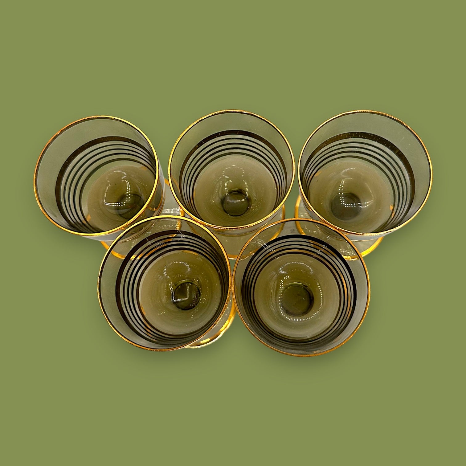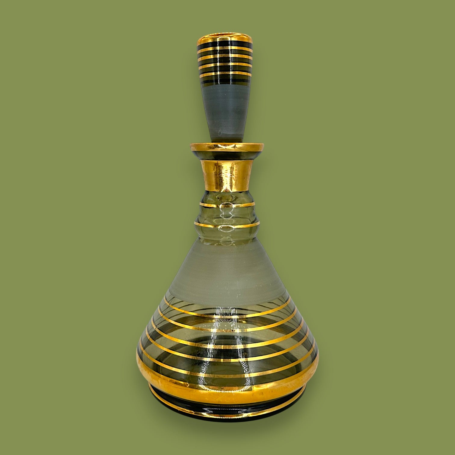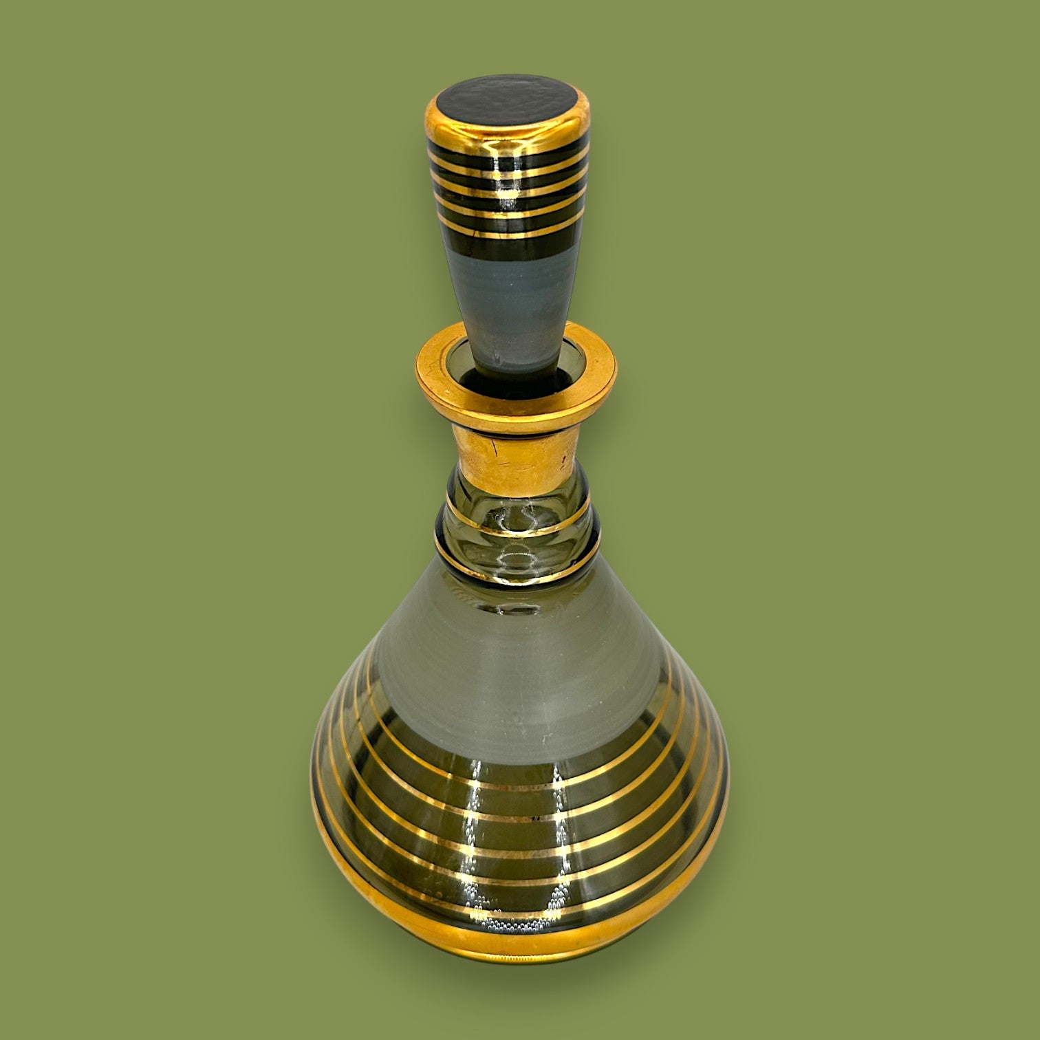 This exquisite Vintage Bohemian Crystal Decanter and Glass Set exudes timeless sophistication with its smoky green glass, frosted detailing, and rich gold gilt stripes. The set includes a beautifully crafted decanter with stopper and five matching liqueur glasses, all showcasing elegant symmetry and hand-applied gilding. Perfect for collectors and those who appreciate refined mid-century barware.