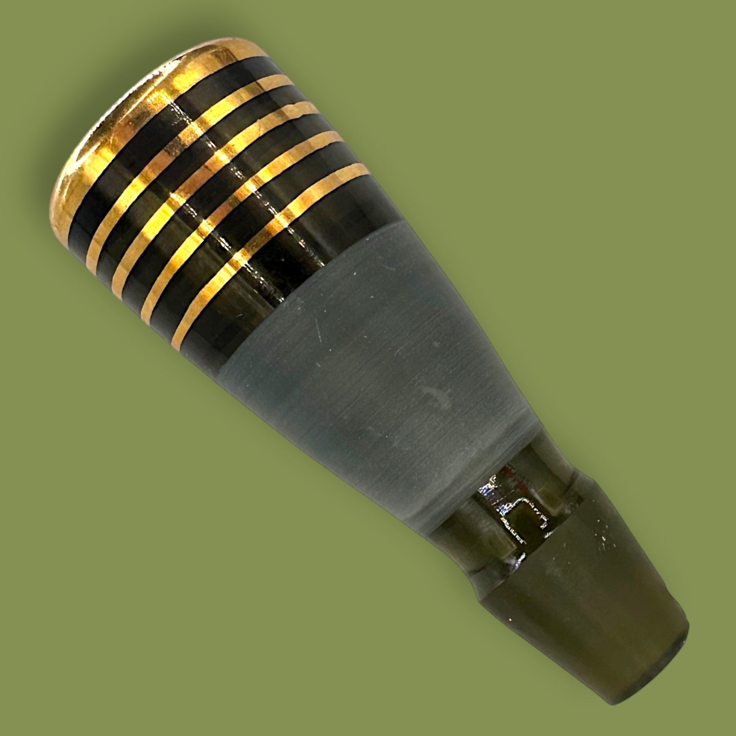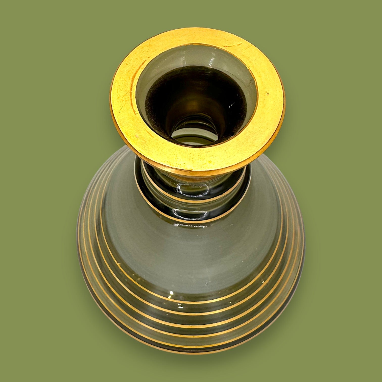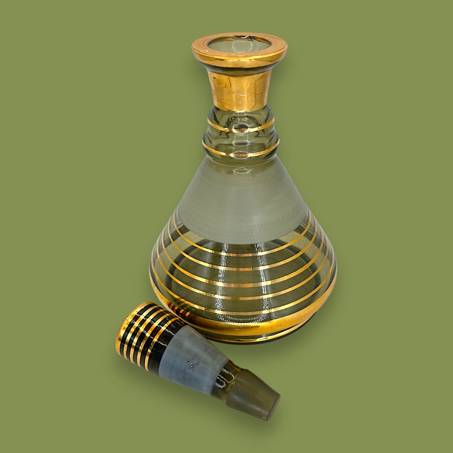 This exquisite Vintage Bohemian Crystal Decanter and Glass Set exudes timeless sophistication with its smoky green glass, frosted detailing, and rich gold gilt stripes. The set includes a beautifully crafted decanter with stopper and five matching liqueur glasses, all showcasing elegant symmetry and hand-applied gilding. Perfect for collectors and those who appreciate refined mid-century barware.